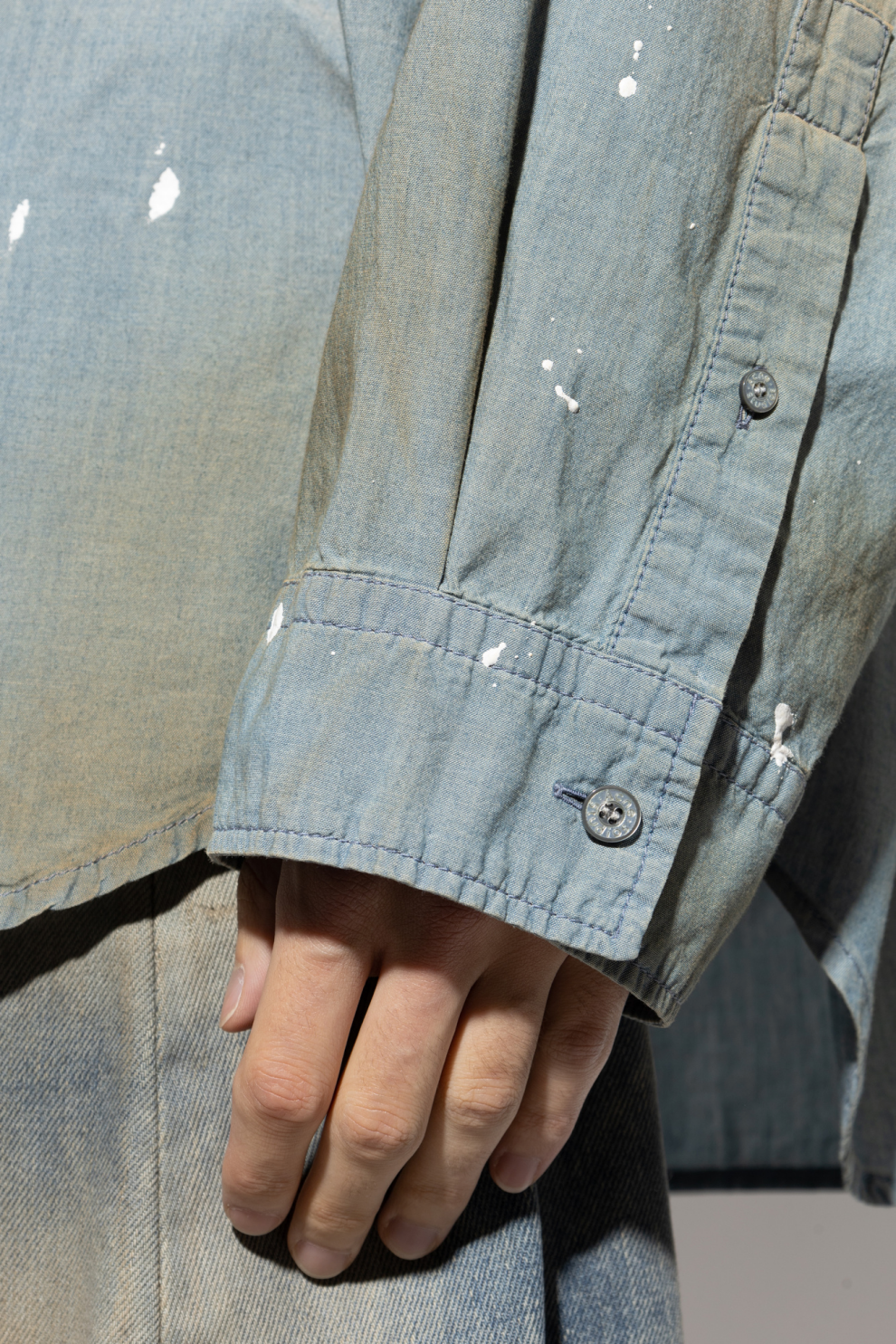Характерный эффект потертости — неравномерные светло-бежевые и белые блики — в сочетании с тонкими белыми акцентами, имитирующими брызги краски, делают эту рубашку уникальным выбором для ценителей изысканного авангардного стиля. Классическое расположение пуговиц гармонирует с общим дизайном и не перекрыто никакой видимой маркировкой или логотипом.