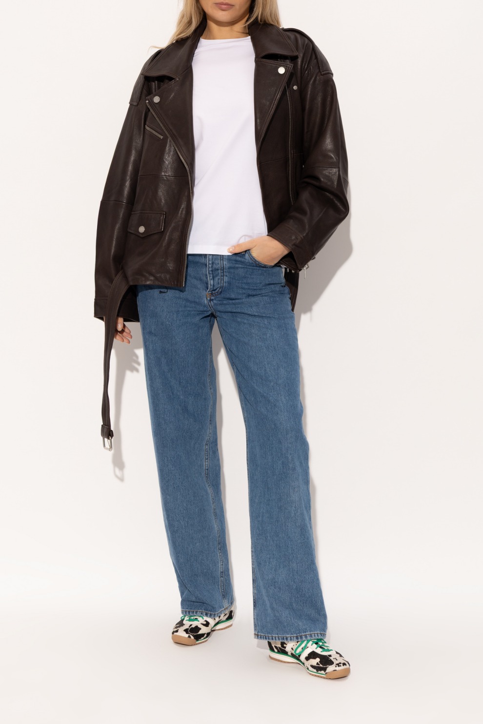 Низкий профиль, вдохновленный ретро-моделями 1970-х, формирует легкий и динамичный силуэт. Верх выполнен из фактурного материала с узором cow-print в кремово-черной гамме, создающим эффектный визуальный акцент.