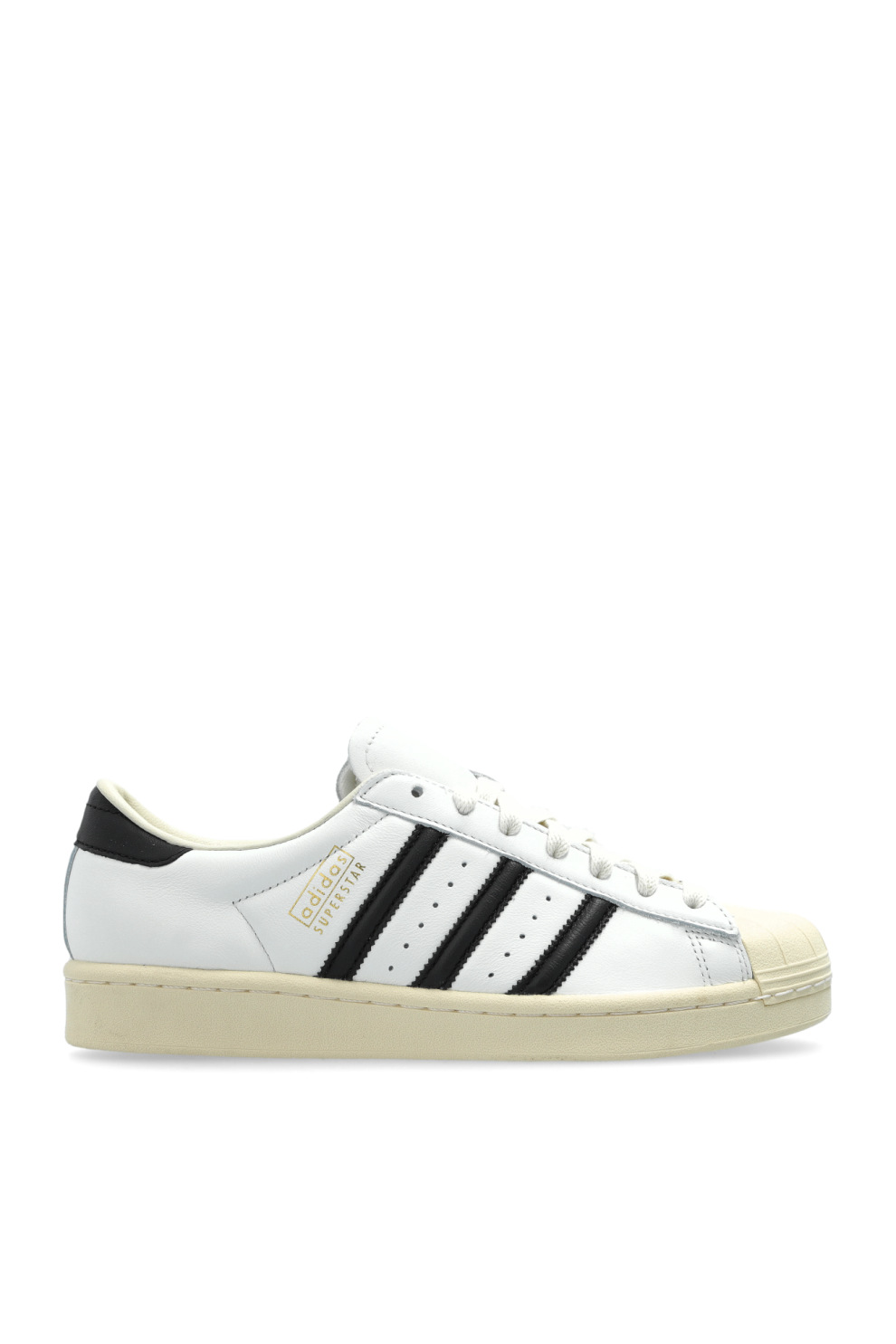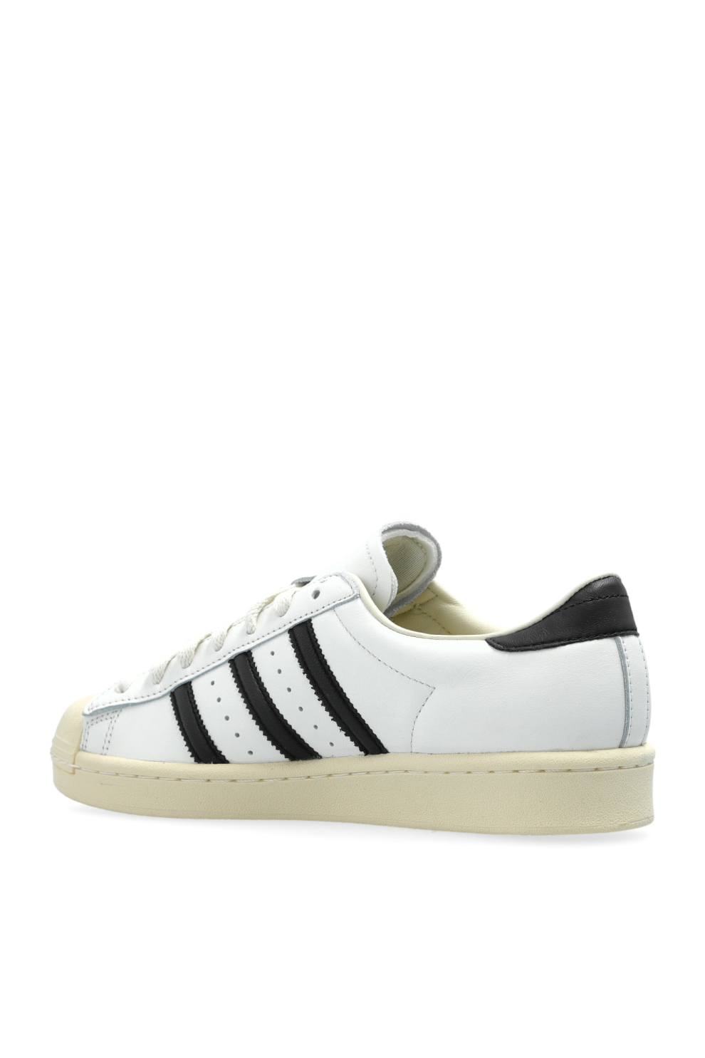 Низкий силуэт выполнен из гладкой белой кожи и дополнен кремовым резиновым «ракушечным» носком, который придает паре характерное винтажное настроение. Контрастные черные полоски и золотистая надпись Superstar сбоку подчеркивают культовую эстетику бренда.