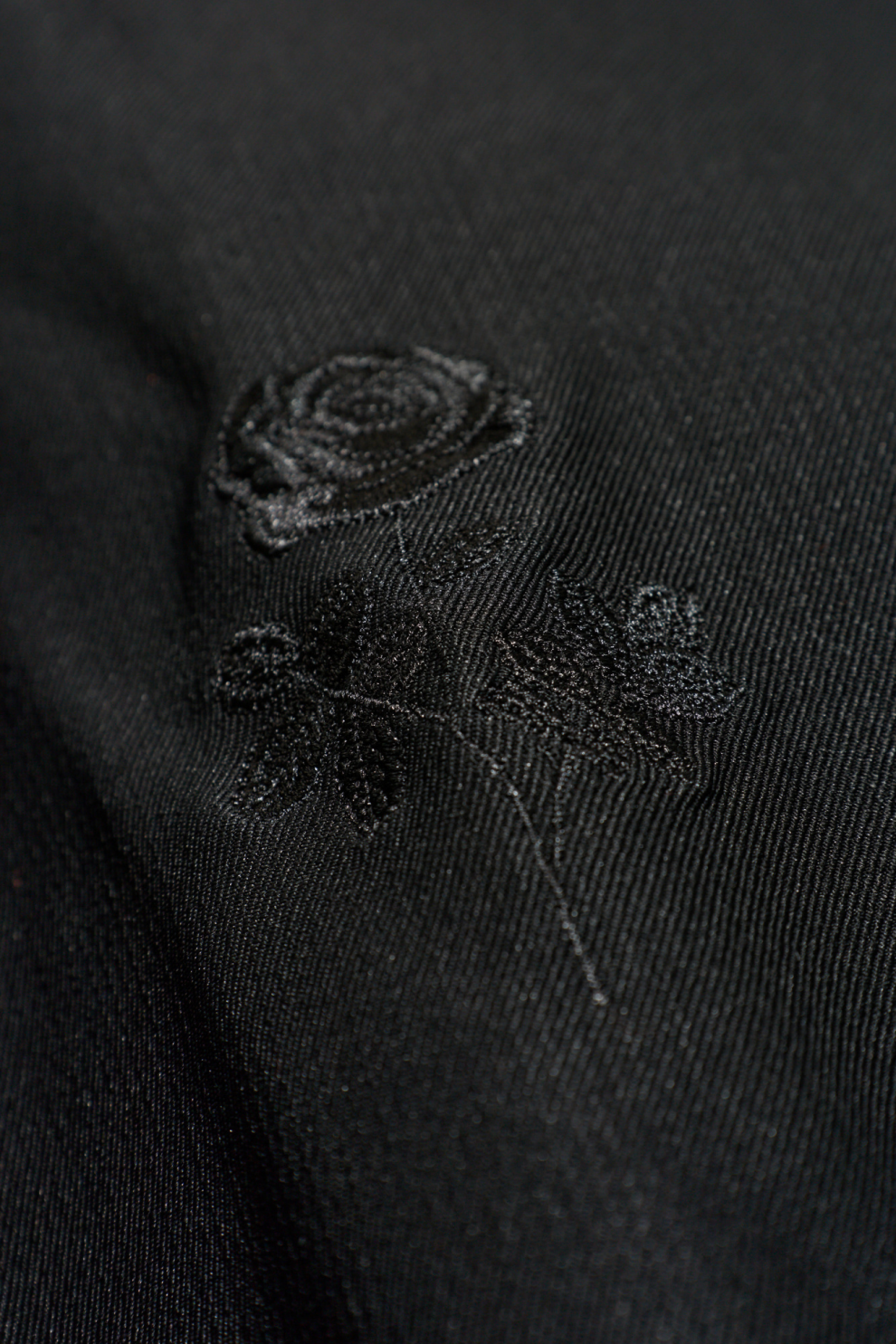 Знаковая вышивка чёрной розы на груди — деликатный, но выразительный символ авторского почерка Вилли Чаваррии, добавляющий изделию эмоциональности и индивидуальности. Завершает образ широкий эластичный пояс по низу, обеспечивающий идеальную посадку и подчёркивающий премиальный уровень исполнения.