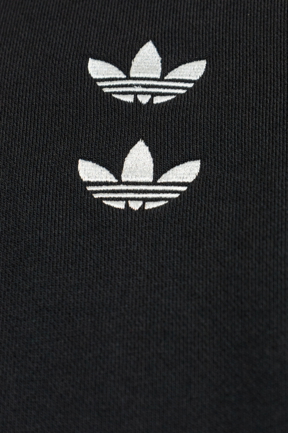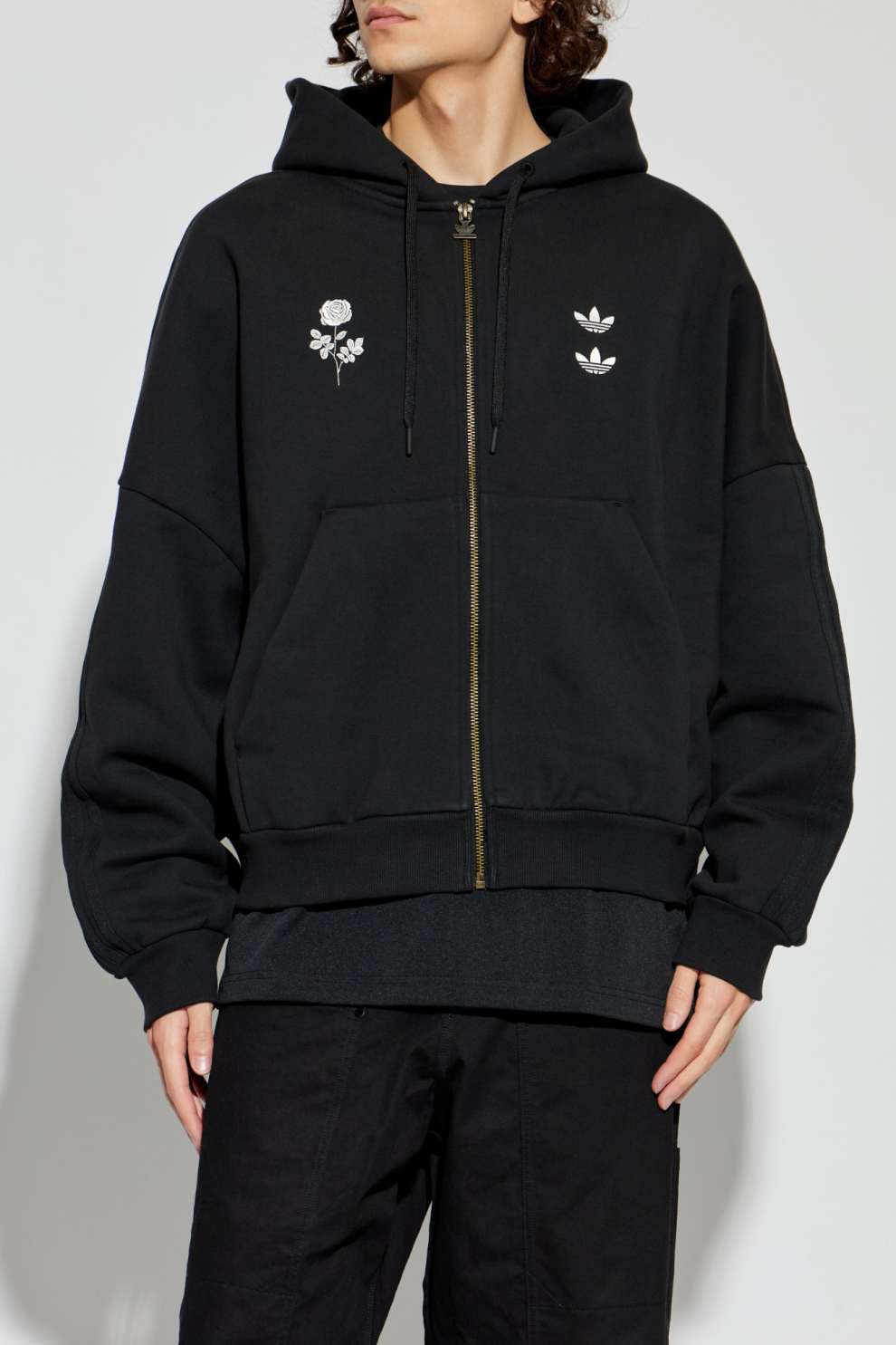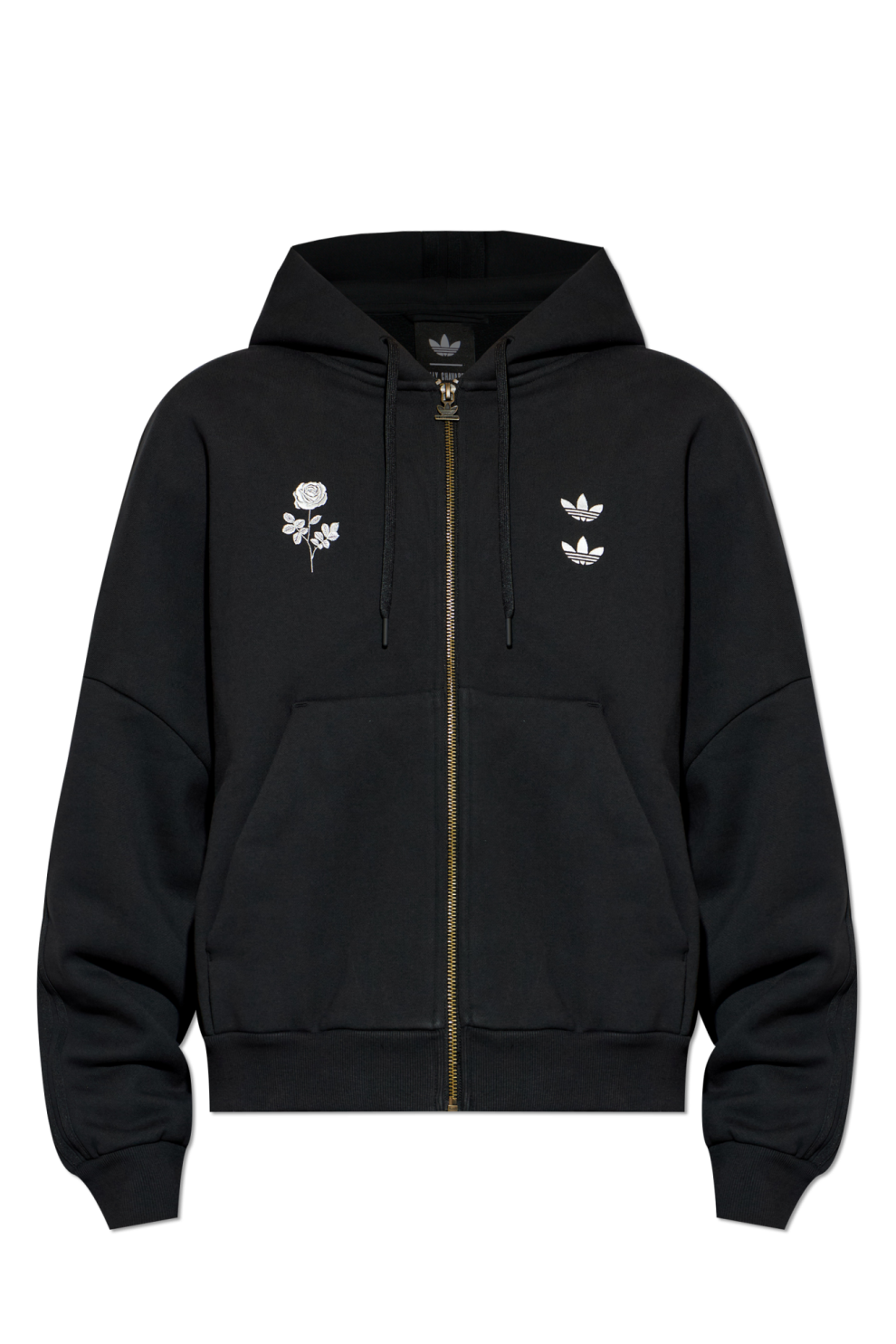 Передняя часть выполнена в эффектном черном цвете, разбавленном едва заметным вышитым мотивом белой розы и двумя логотипами adidas Trefoil. Оригинальная золотая молния подчеркивает стиль, а функциональный карман-кенгуру добавляет практичности. Дизайн завершают выразительные шнурки, гармонично дополняющие объемный капюшон. Это образец изысканного минимализма и мастерской детализации.