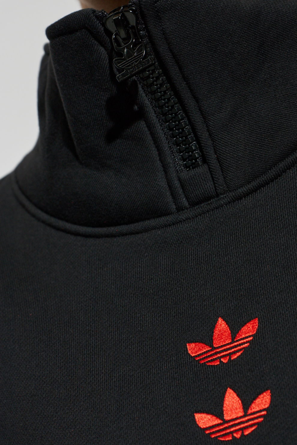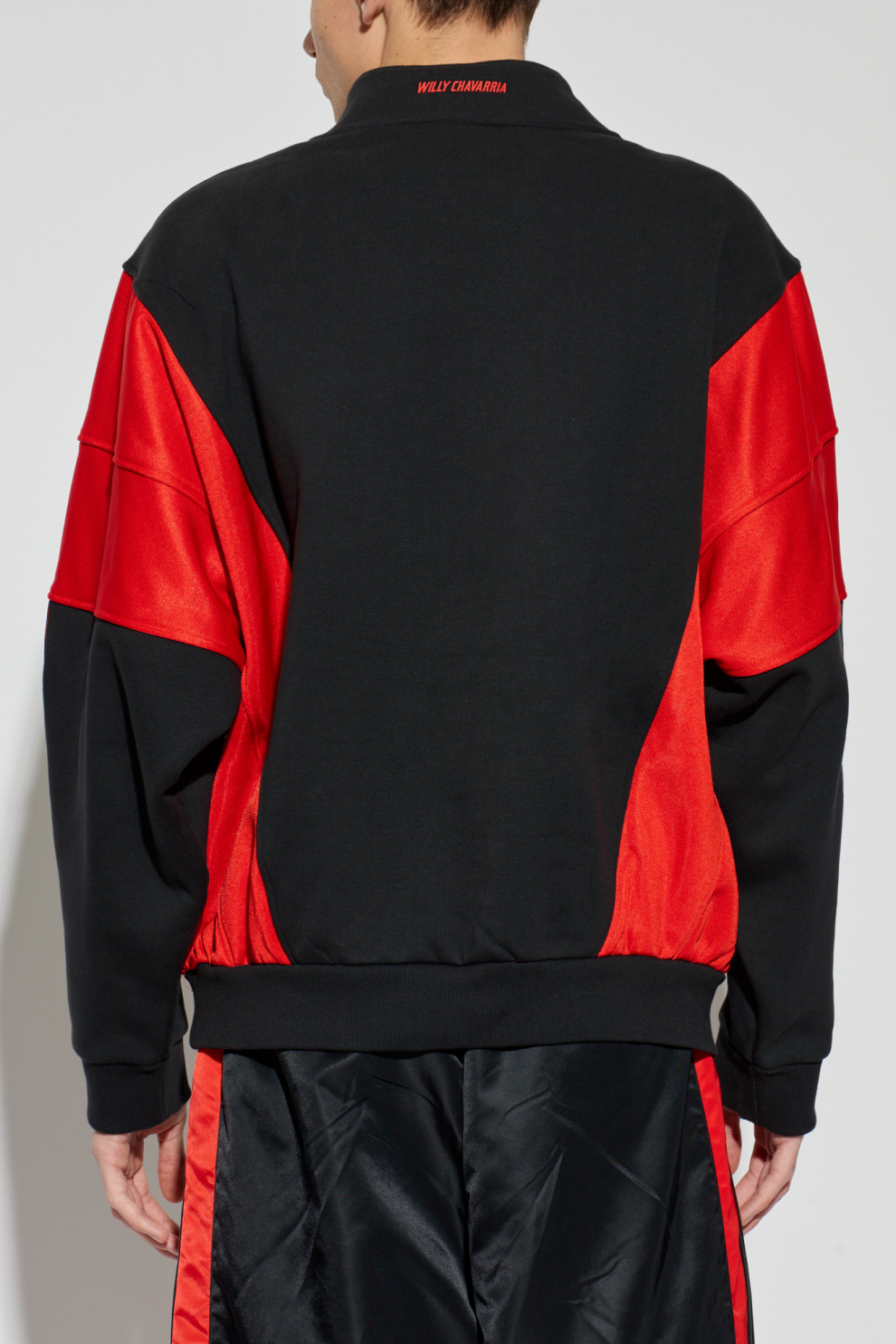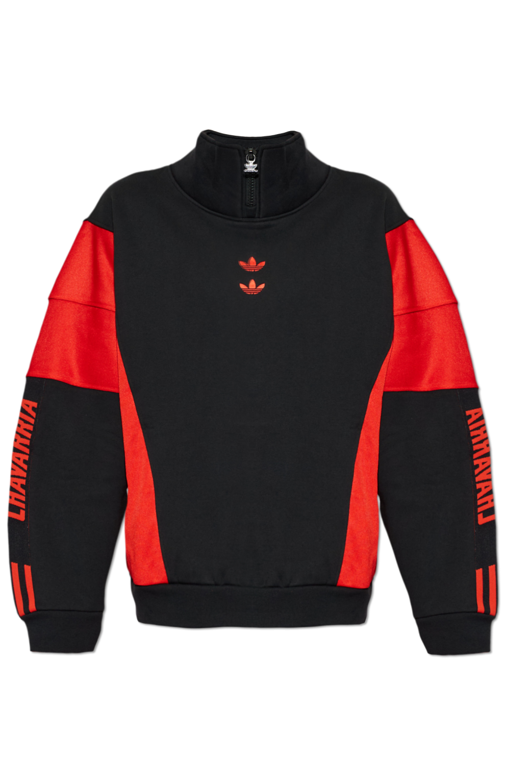 Асимметричные красные вставки из блестящей технической ткани привлекают внимание, подчеркивая плечи и бока. Вертикальные контрастные надписи на рукавах и двойной красный логотип Adidas Originals на груди гармонично сочетают спортивное наследие с современным авангардом. Три красные полосы на концах рукавов элегантно завершают дизайн.