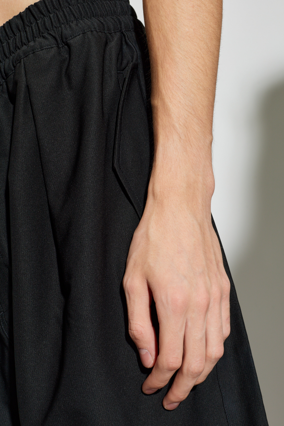 Исключительно свободный, объёмный крой формирует выразительный архитектурный силуэт. Широкие брючины, мягко сужающиеся к низу, завершены эластичными манжетами, которые добавляют динамики и обеспечивают комфорт при движении, сохраняя при этом визуальную строгость. Глубокий чёрный цвет без декоративных узоров подчёркивает чистоту формы и эксклюзивный характер изделия.