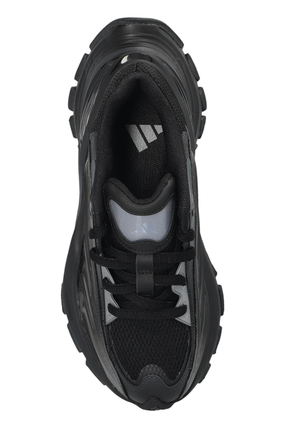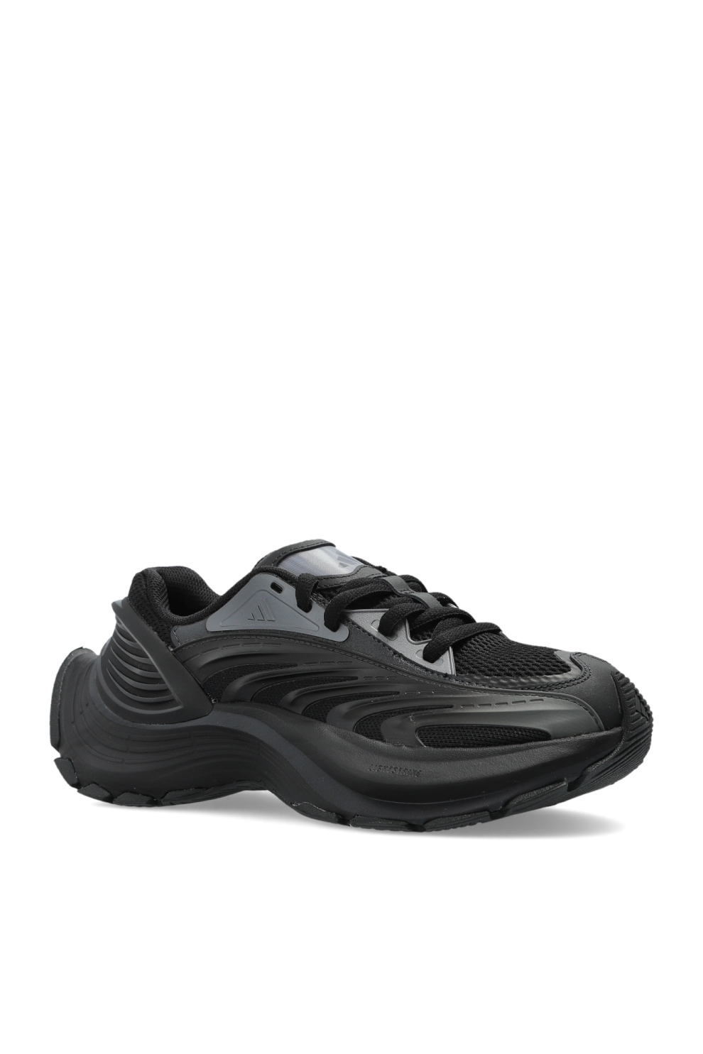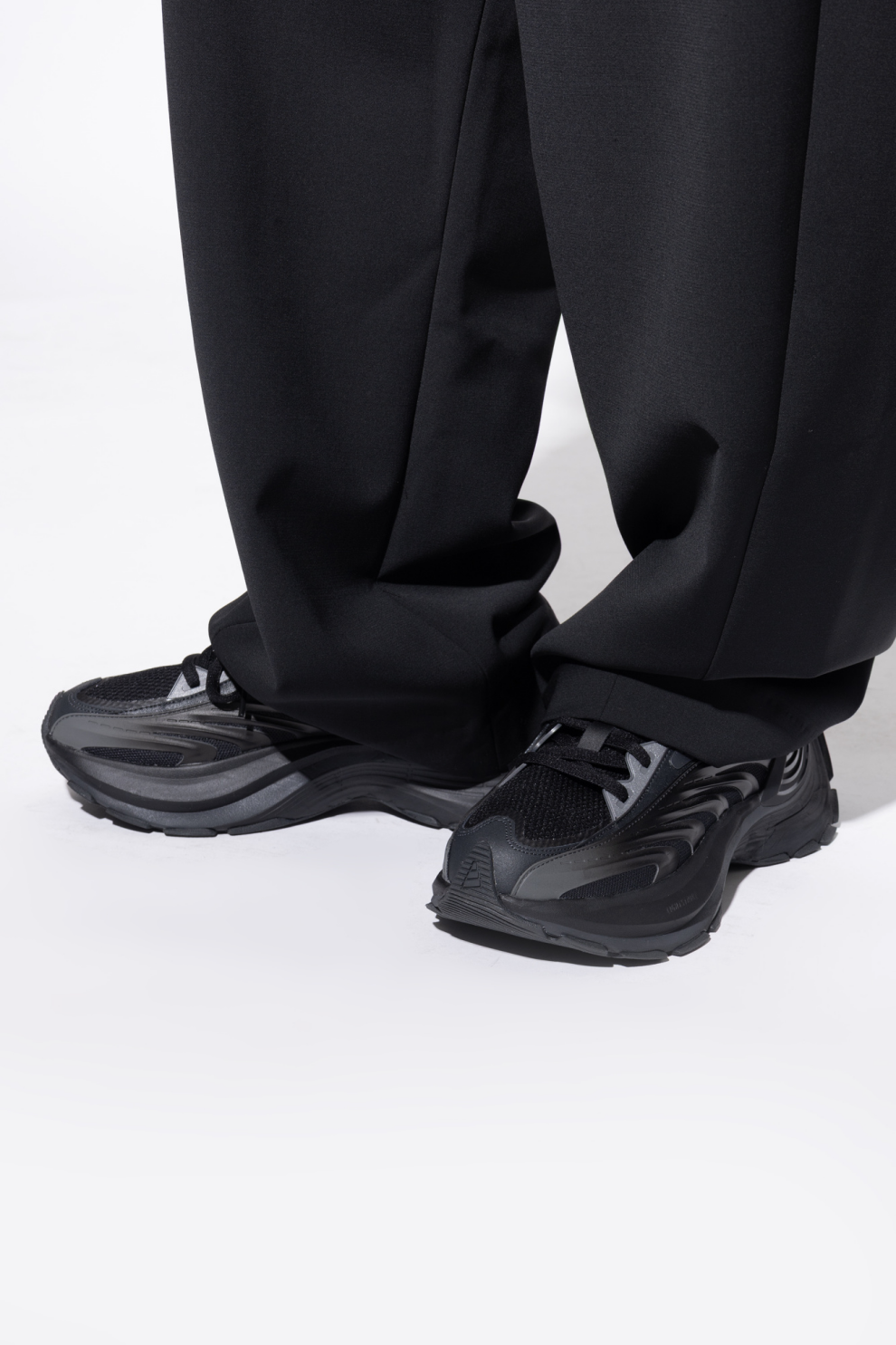 Черный верх кроссовок выполнен из дышащей текстильной сетки с матовыми и мерцающими синтетическими вставками, которые создают эффектный многослойный рисунок, перекликающийся с техническими спортивными мотивами. Выразительные изогнутые линии и сложная строчка придают кроссовкам смелый и динамичный вид.