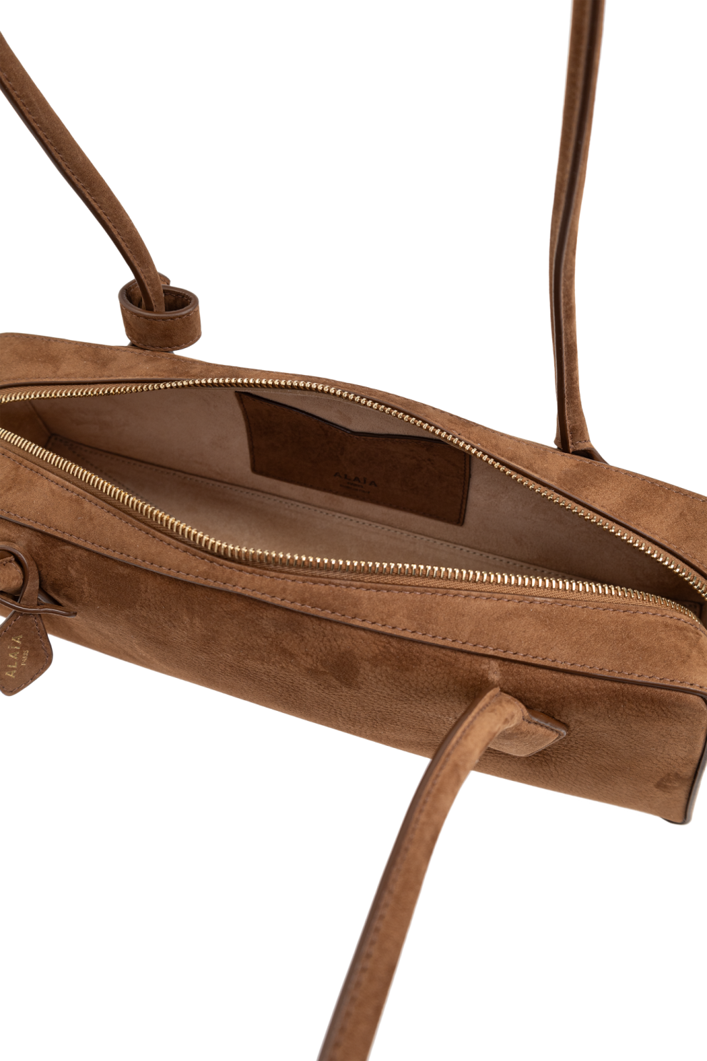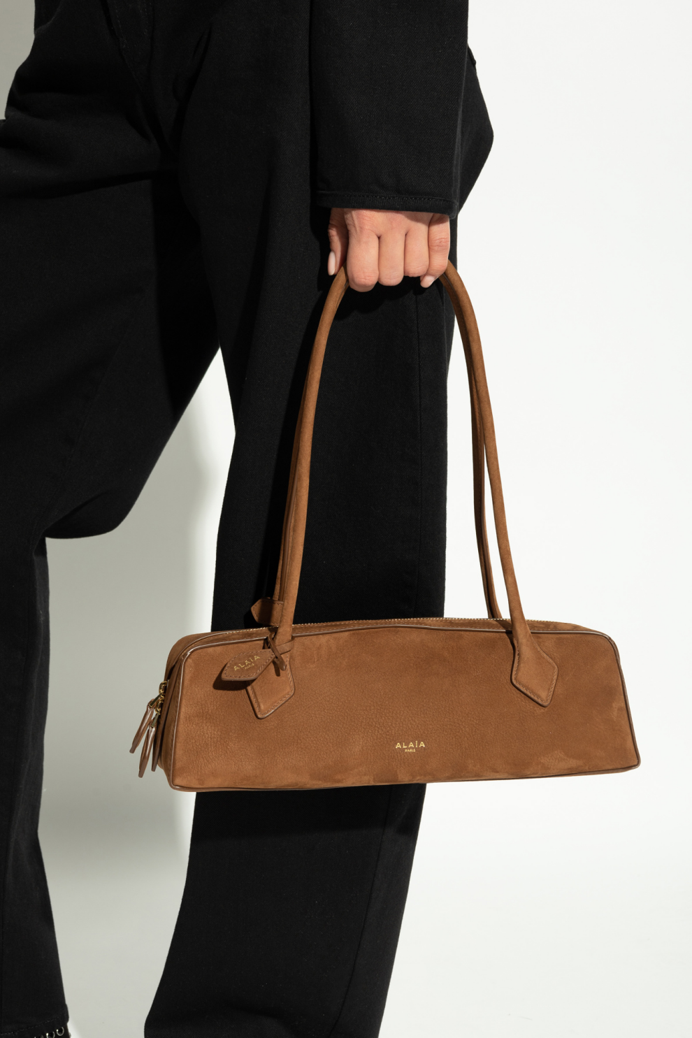 Функциональные и декоративные элементы гармонично интегрированы в дизайн: изящная золотая молния добавляет деликатный акцент роскоши, а фирменное тиснение «ALAÏA PARIS» на передней панели служит знаком подлинности и высокого статуса. Две компактные декоративные ручки подчеркивают продуманность композиции, не перегружая минималистичный силуэт.