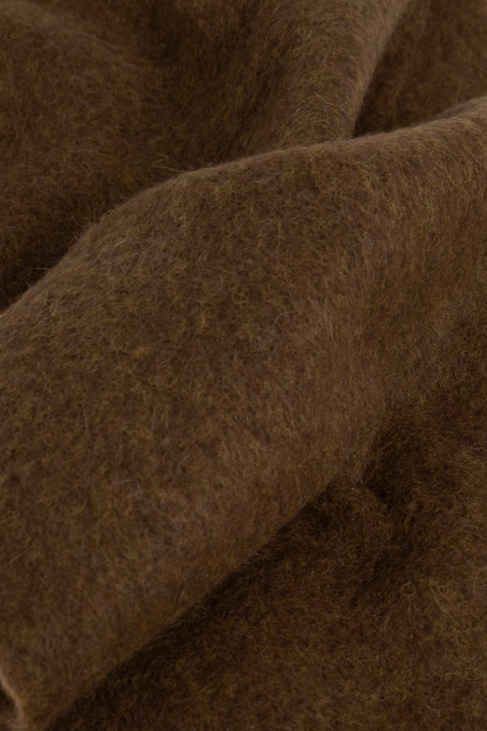 Выполненный в коричневом цвете, он имеет прямоугольную, удлинённую форму и идеально подходит как для женского, так и для мужского образа. Эта изысканная ткань, сочетающая в себе нежную пряжу из альпаки, полиамида и шерсти, невероятно мягкая на ощупь и создаёт богатую, пушистую текстуру, дарящую исключительный комфорт. Элегантная густая бахрома по краям подчёркивает стильный характер этого аксессуара.