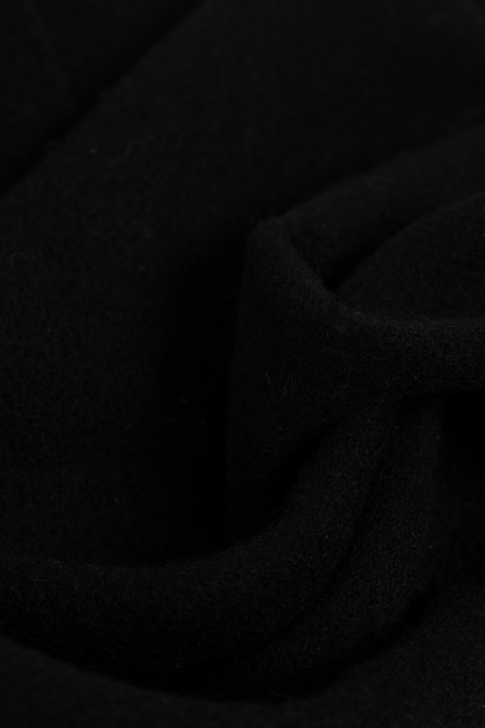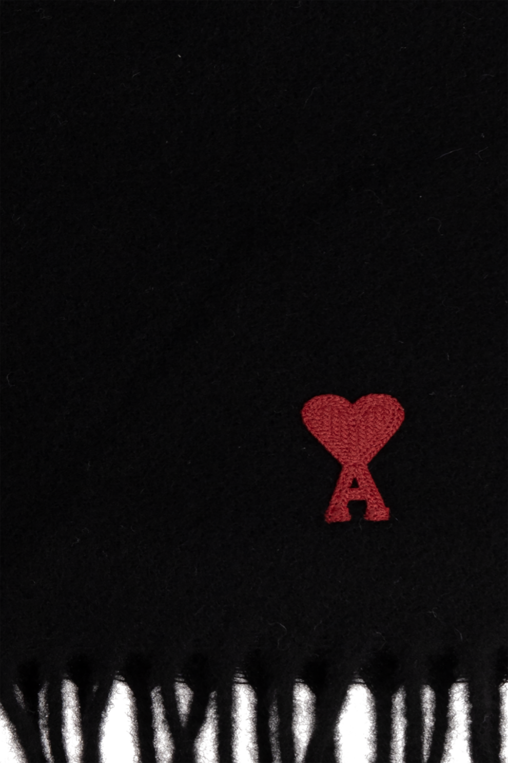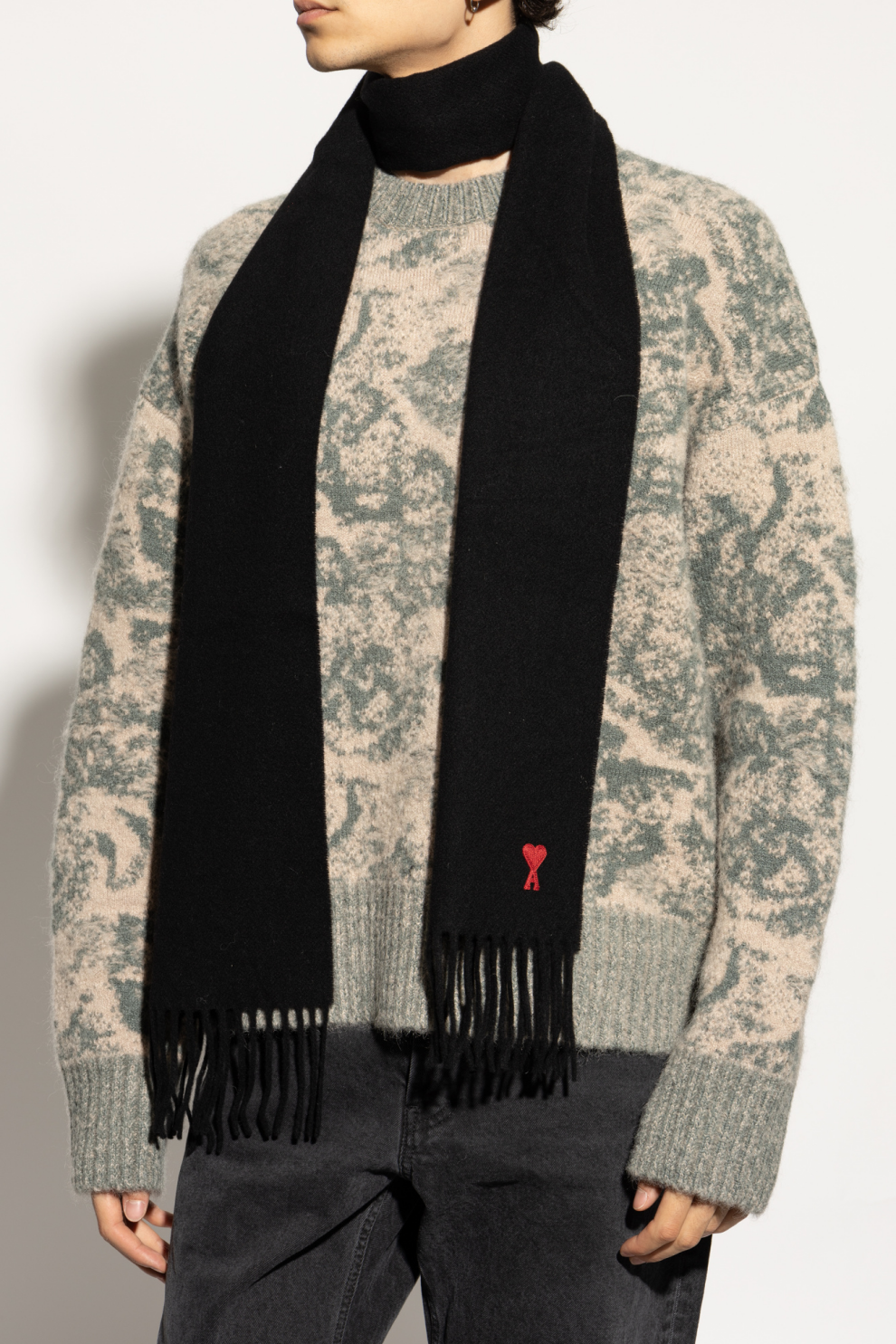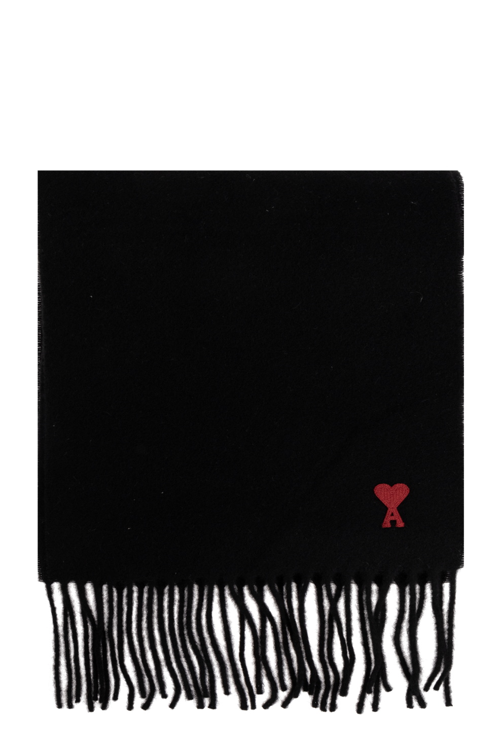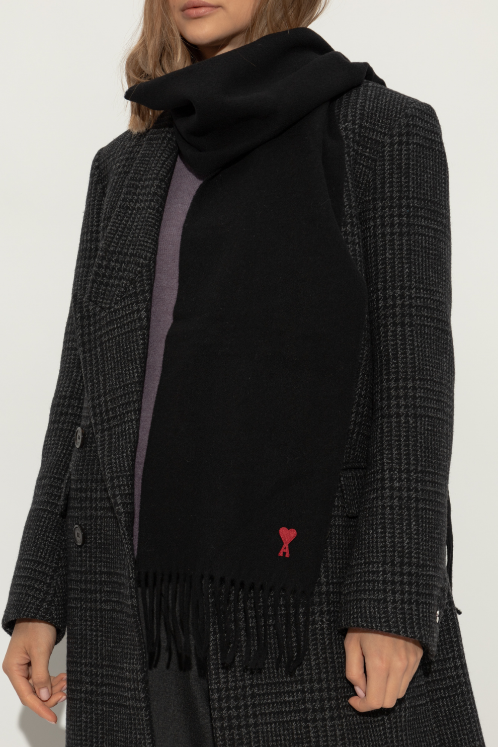 Прямоугольная форма и высококачественная натуральная шерсть гарантируют практичность, комфорт и тепло. Стильная бахрома на конце придаёт ему уникальный вид, а красная нашивка в форме сердца с буквой «А» подчёркивает эксклюзивность изделия и узнаваемость бренда AMI. Монохромный чёрный дизайн дополнит любой гардероб, добавив изысканности.
