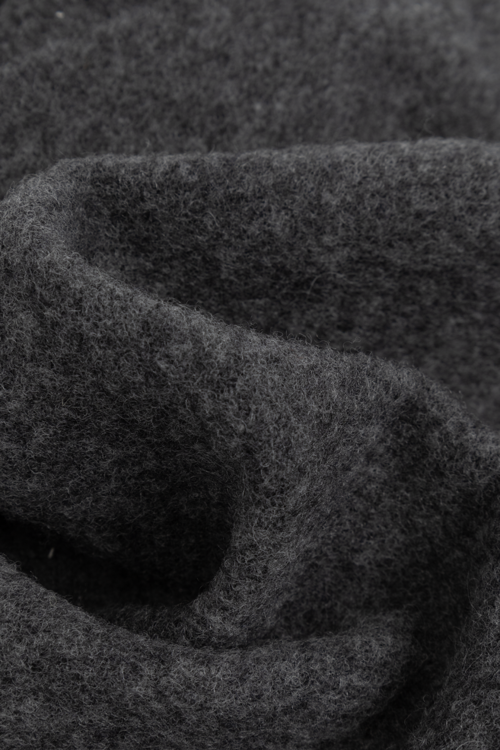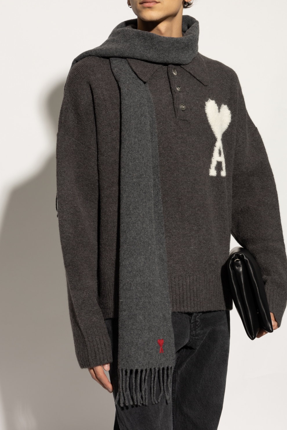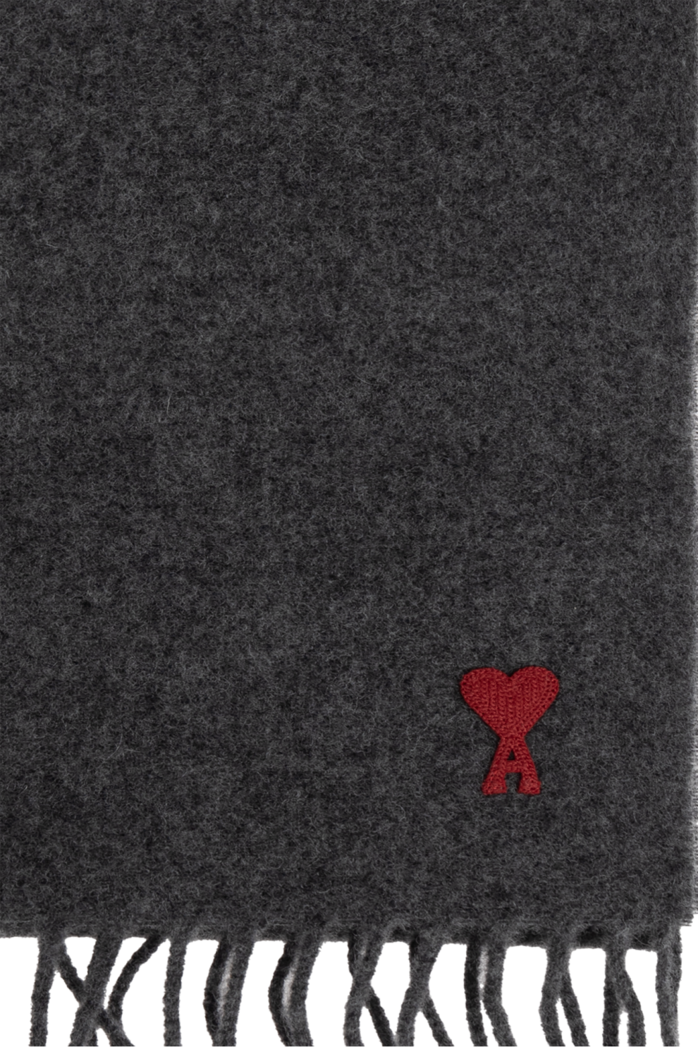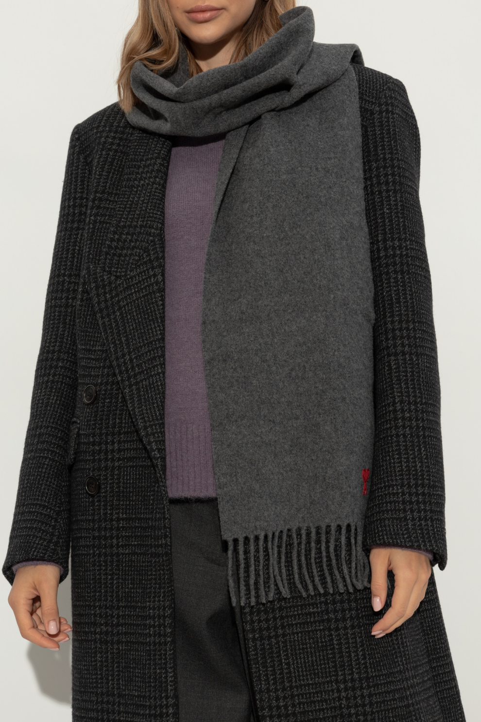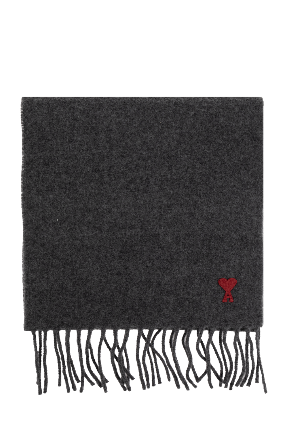 Прямоугольная форма и высококачественная натуральная шерсть гарантируют практичность, комфорт и тепло. Стильная бахрома на конце придаёт ему уникальный вид, а красная нашивка в форме сердца с буквой «А» подчёркивает эксклюзивность изделия и узнаваемость бренда AMI. Монохромный серый дизайн дополнит любой гардероб, добавив изысканности.