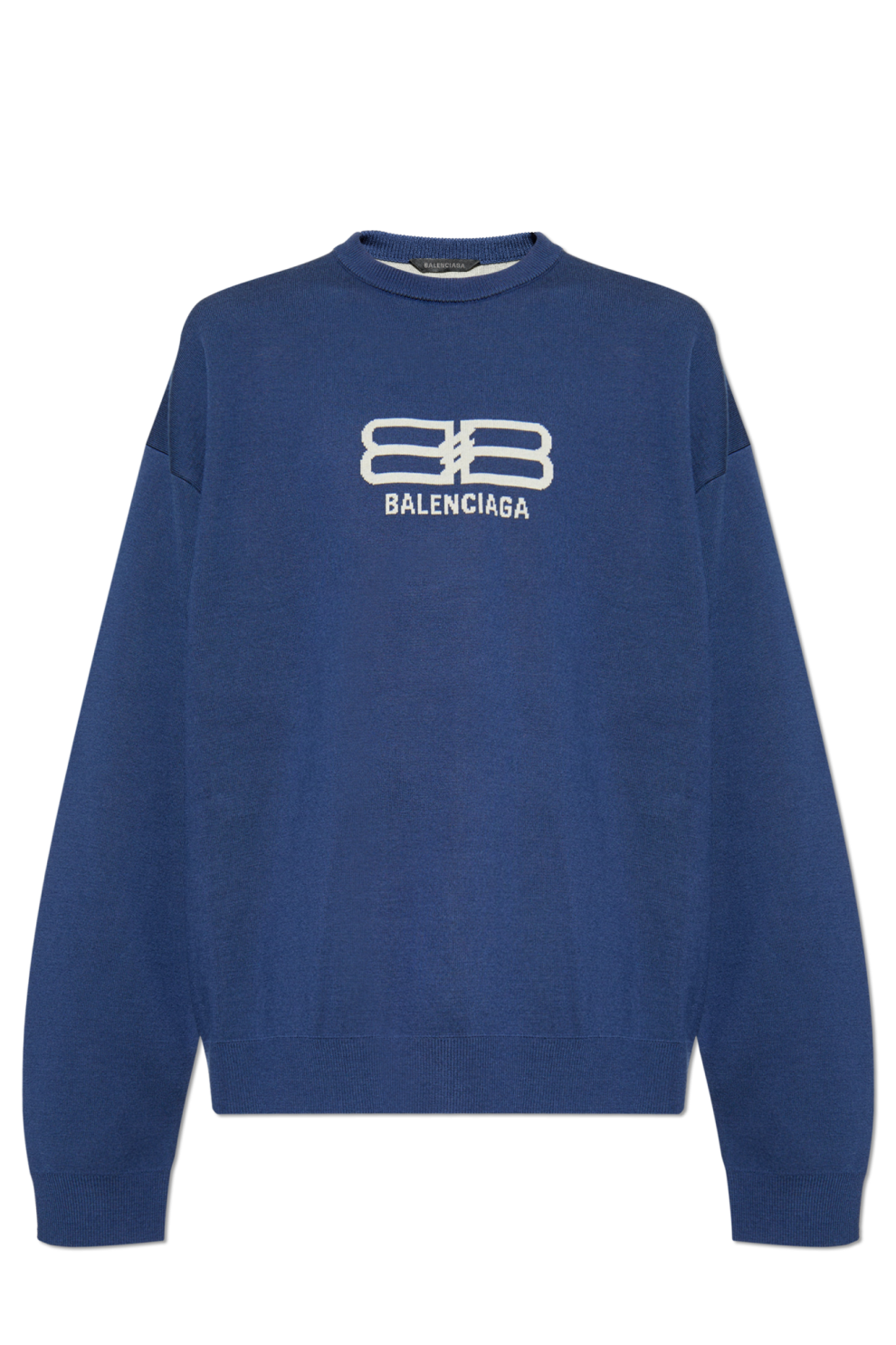 Минималистичный характер дополняет контрастный белый логотип в виде двойной буквы «B» и надпись «BALENCIAGA», подчёркивающие престиж бренда. Уникальное расположение принта – крупный узор спереди и более мелкий сзади на горловине – демонстрирует продуманный, эксклюзивный дизайн. Свитер насыщенного синего оттенка гармонично сочетает в себе современность и классику.