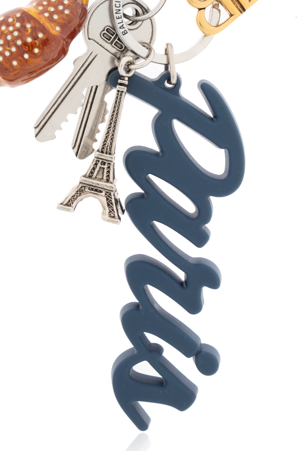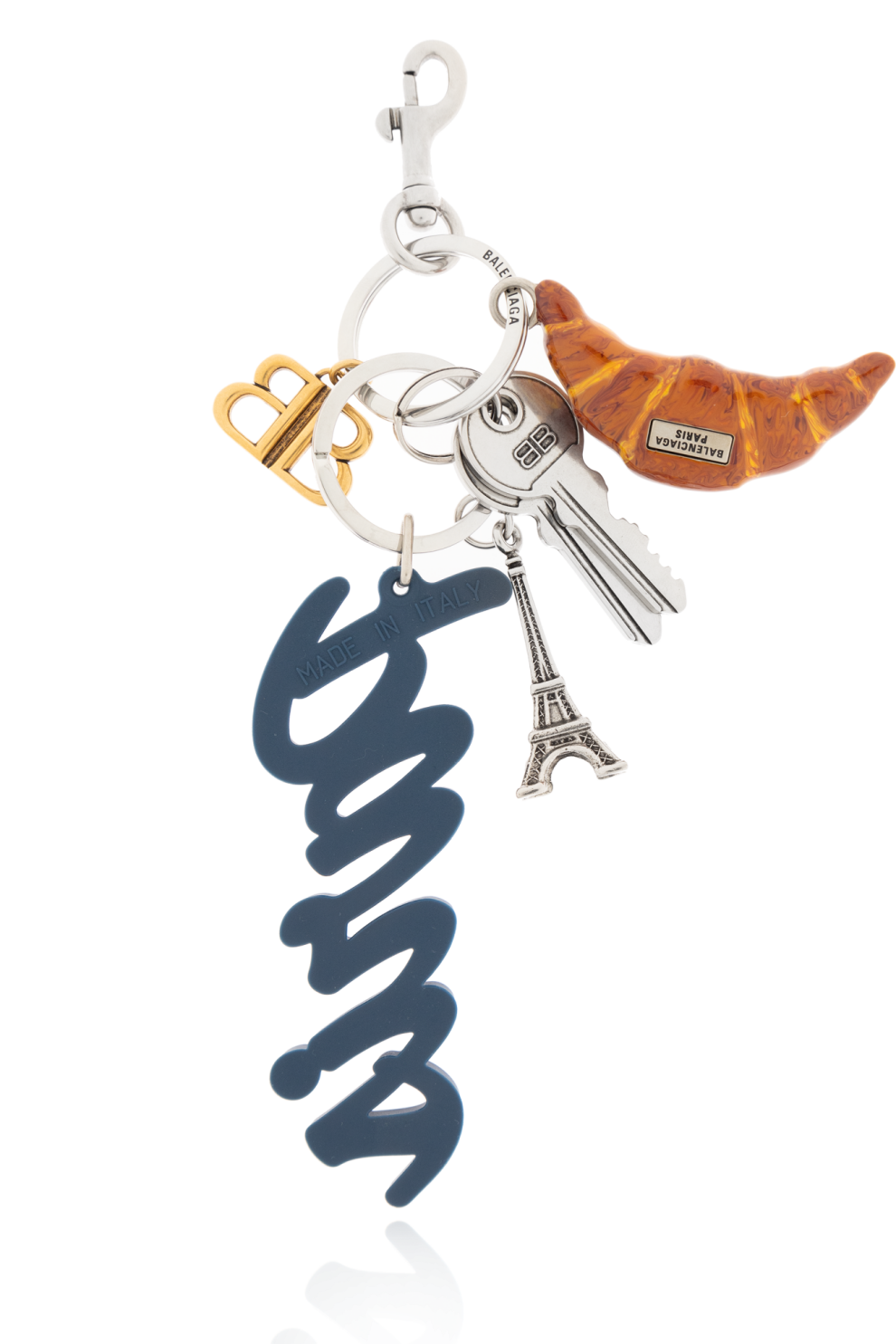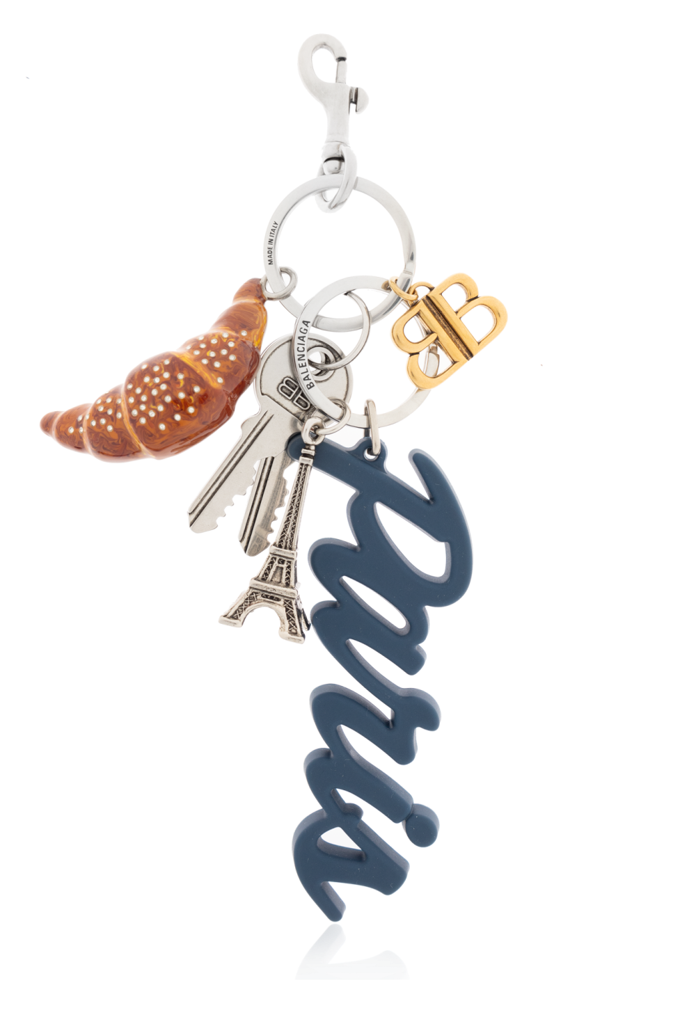 Этот изысканный брелок с подвесками — прекрасное украшение, идеально воплощающее парижский шик и современное видение легендарного модного дома Balenciaga. Утонченный дизайн включает в себя несколько отличительных элементов: центральную надпись «Paris», выполненную из тонко обработанного синтетического материала в оттенках темно-синего, подвеску в форме аппетитного, идеально воспроизведенного круассана и серебристую миниатюрную Эйфелеву башню. Все это дополняют утонченные металлические детали, включая ключ и стилизованную эмблему «BB».