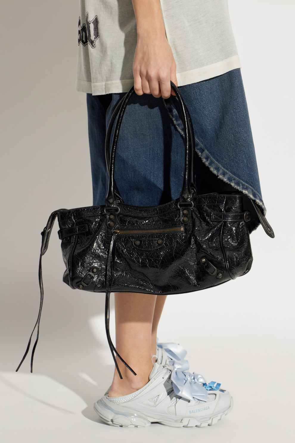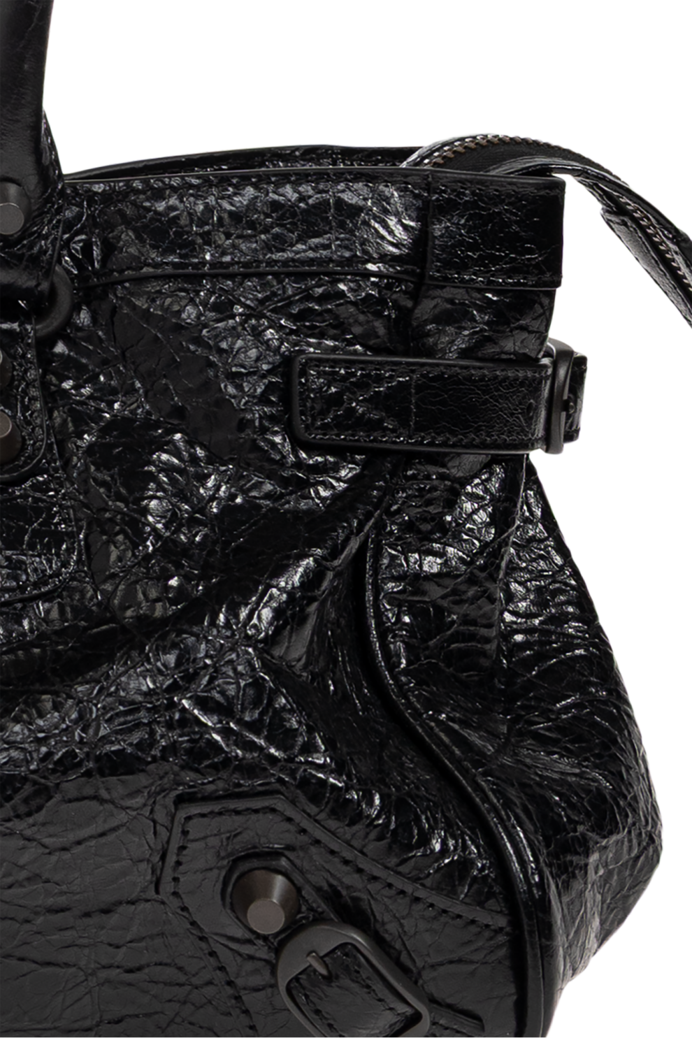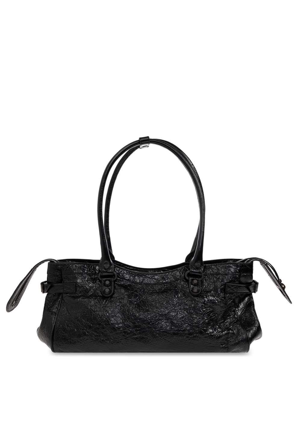 Фирменные детали — выразительная декоративная строчка, массивные заклёпки и две круглые пряжки на фронтальной панели — формируют узнаваемый характер линии Balenciaga. Боковые ремешки с металлическим покрытием и функциональные декоративные молнии добавляют индустриальный акцент, сохраняя при этом изысканность общего дизайна.