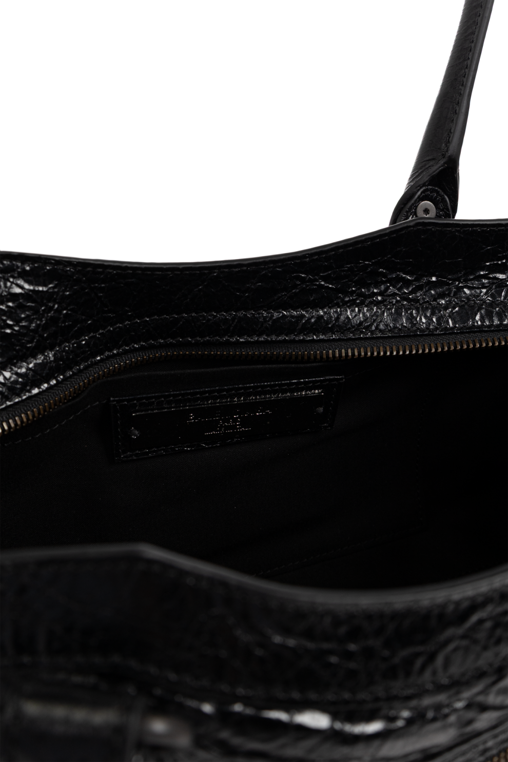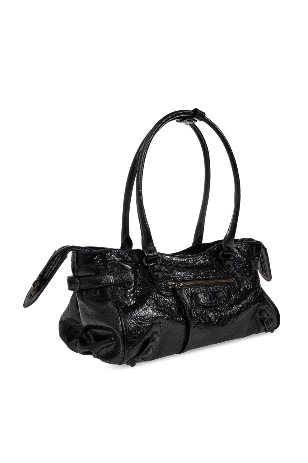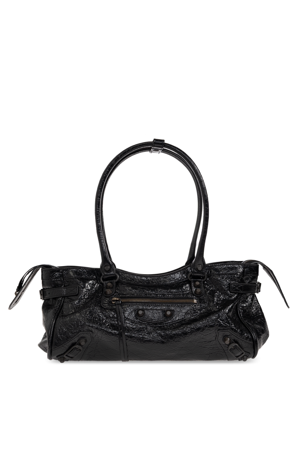 Фирменные детали — выразительная декоративная строчка, массивные заклёпки и две круглые пряжки на фронтальной панели — формируют узнаваемый характер линии Balenciaga. Боковые ремешки с металлическим покрытием и функциональные декоративные молнии добавляют индустриальный акцент, сохраняя при этом изысканность общего дизайна.