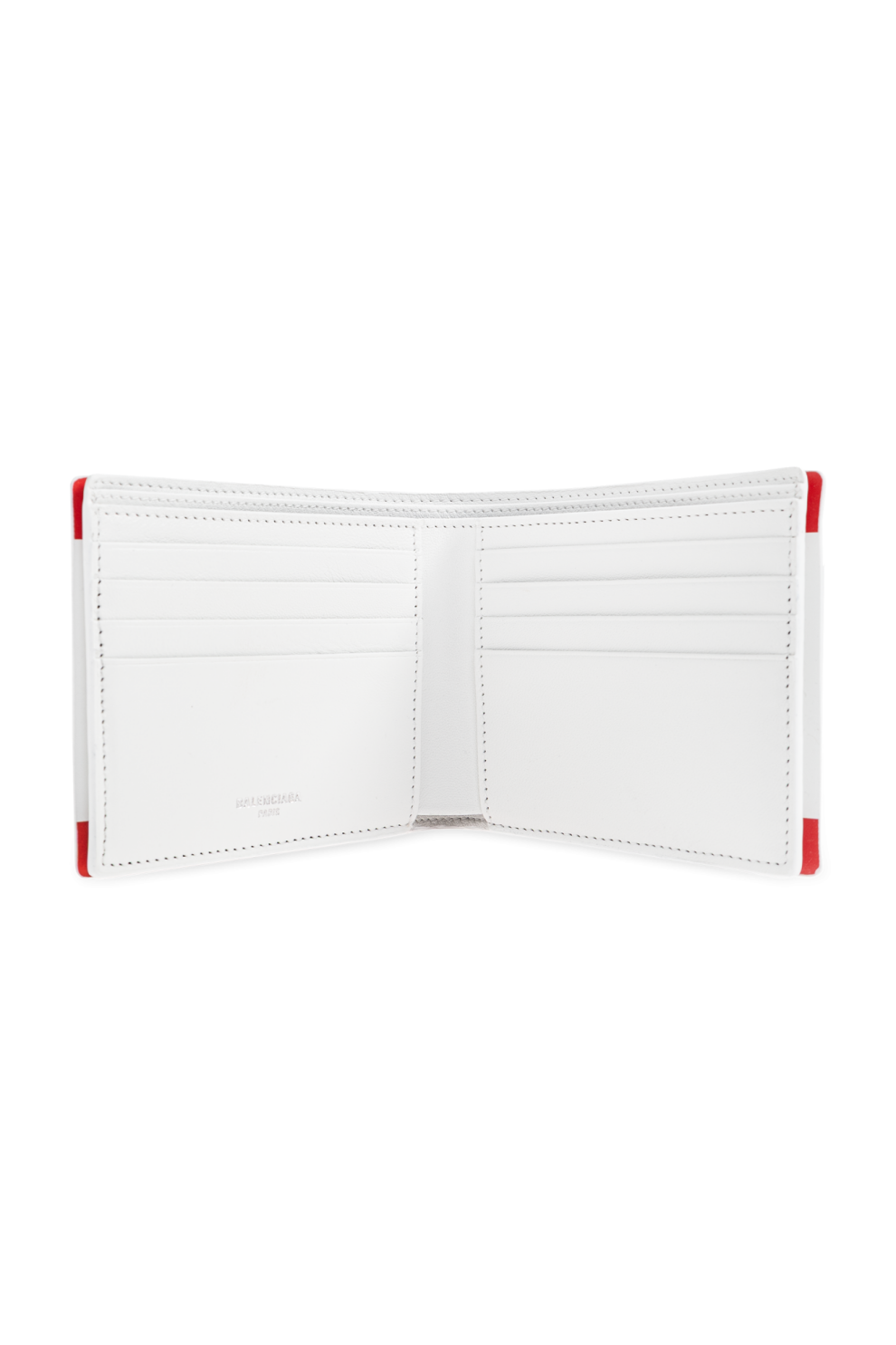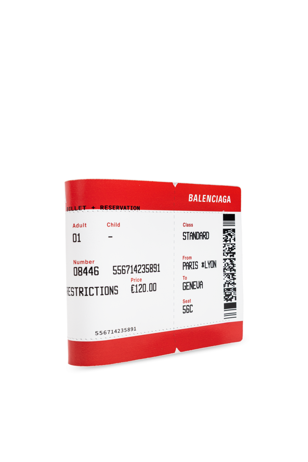 Его классическая прямоугольная форма сложения украшена уникальным принтом в стиле проездного билета с реалистичными секциями, штрихкодами и путевыми заметками. Внешняя и внутренняя части выполнены в белом цвете с изящными графическими деталями черного и красного цветов. Высококачественная кожа премиум-класса гарантирует непревзойденную прочность и ощущение роскоши с каждым прикосновением. Яркий логотип BALENCIAGA на лицевой стороне свидетельствует о престиже и уникальности изделия, идеально подчёркивая его эксклюзивный характер.