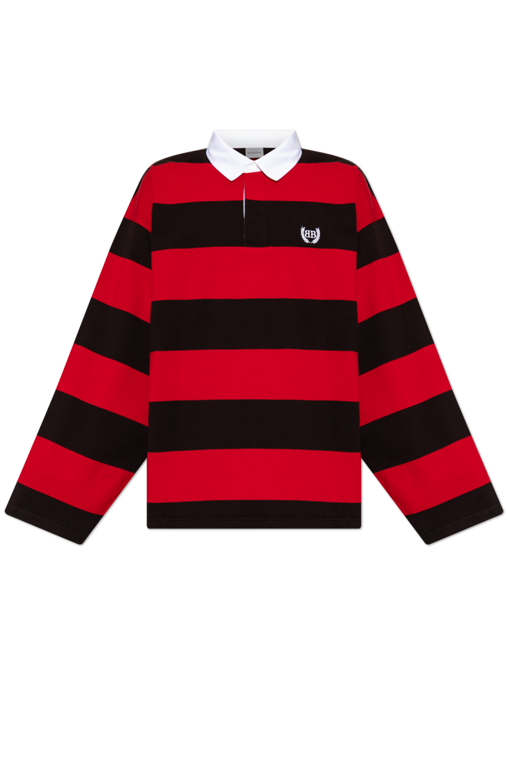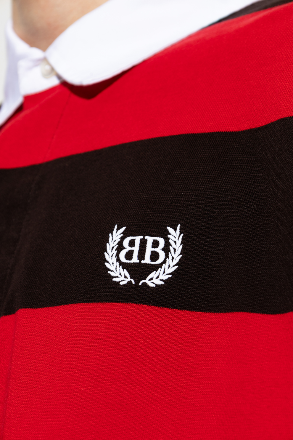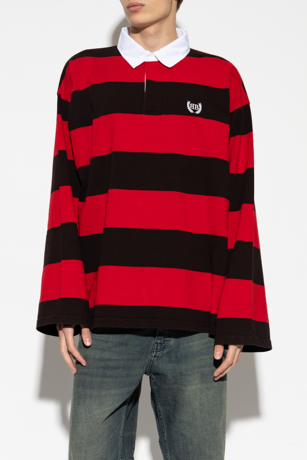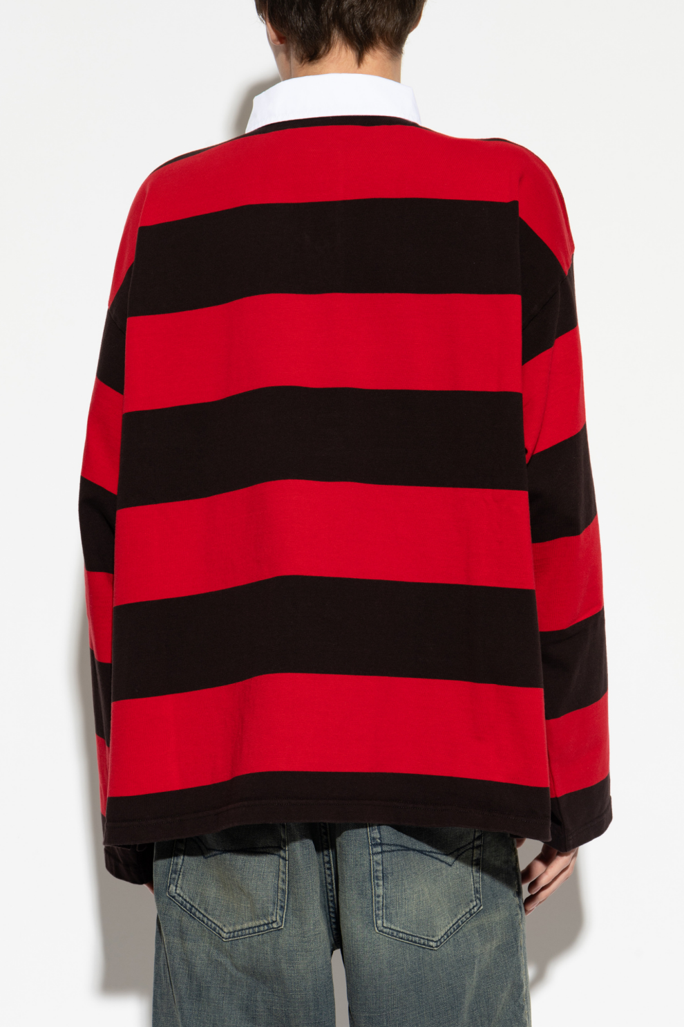 Полосатая рубашка Balenciaga — это выразительное сочетание классической спортивной эстетики и современной модной архитектуры. Модель выполнена в динамичной цветовой гамме: насыщенный красный фон эффектно контрастирует с широкими черными горизонтальными полосами, создавая сильный графический ритм и подчеркивая уверенный, индивидуальный характер изделия.