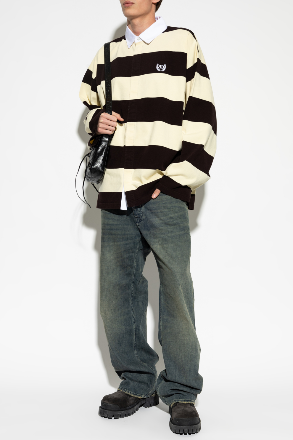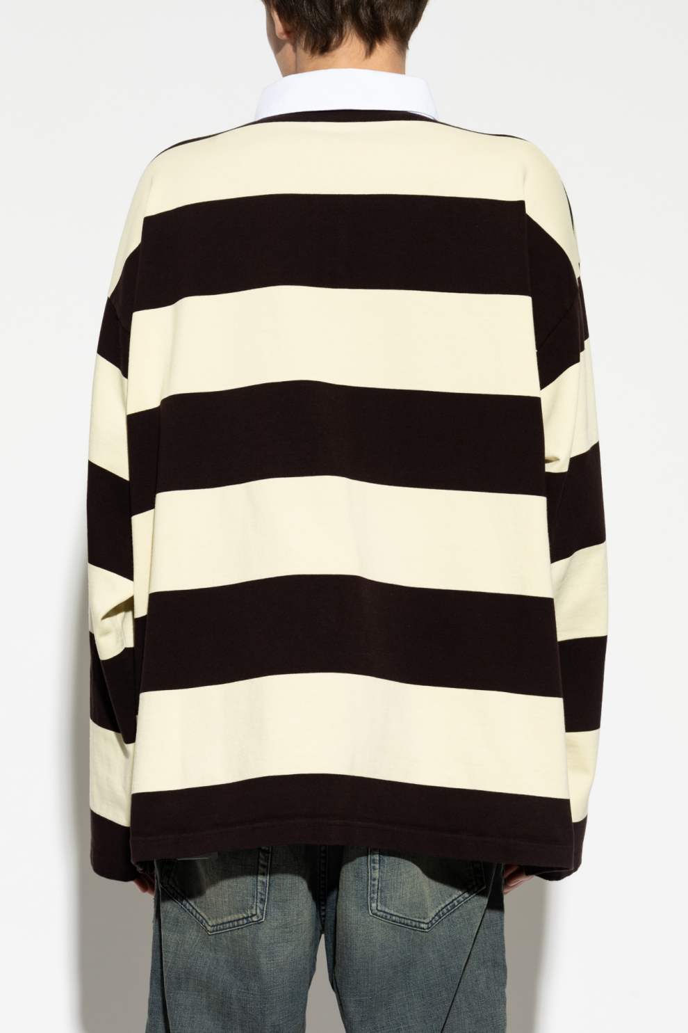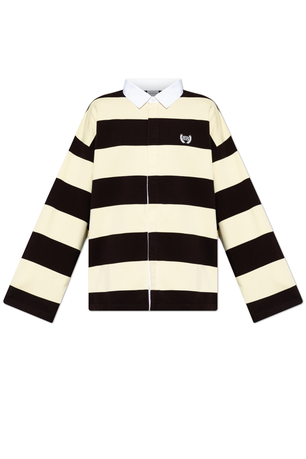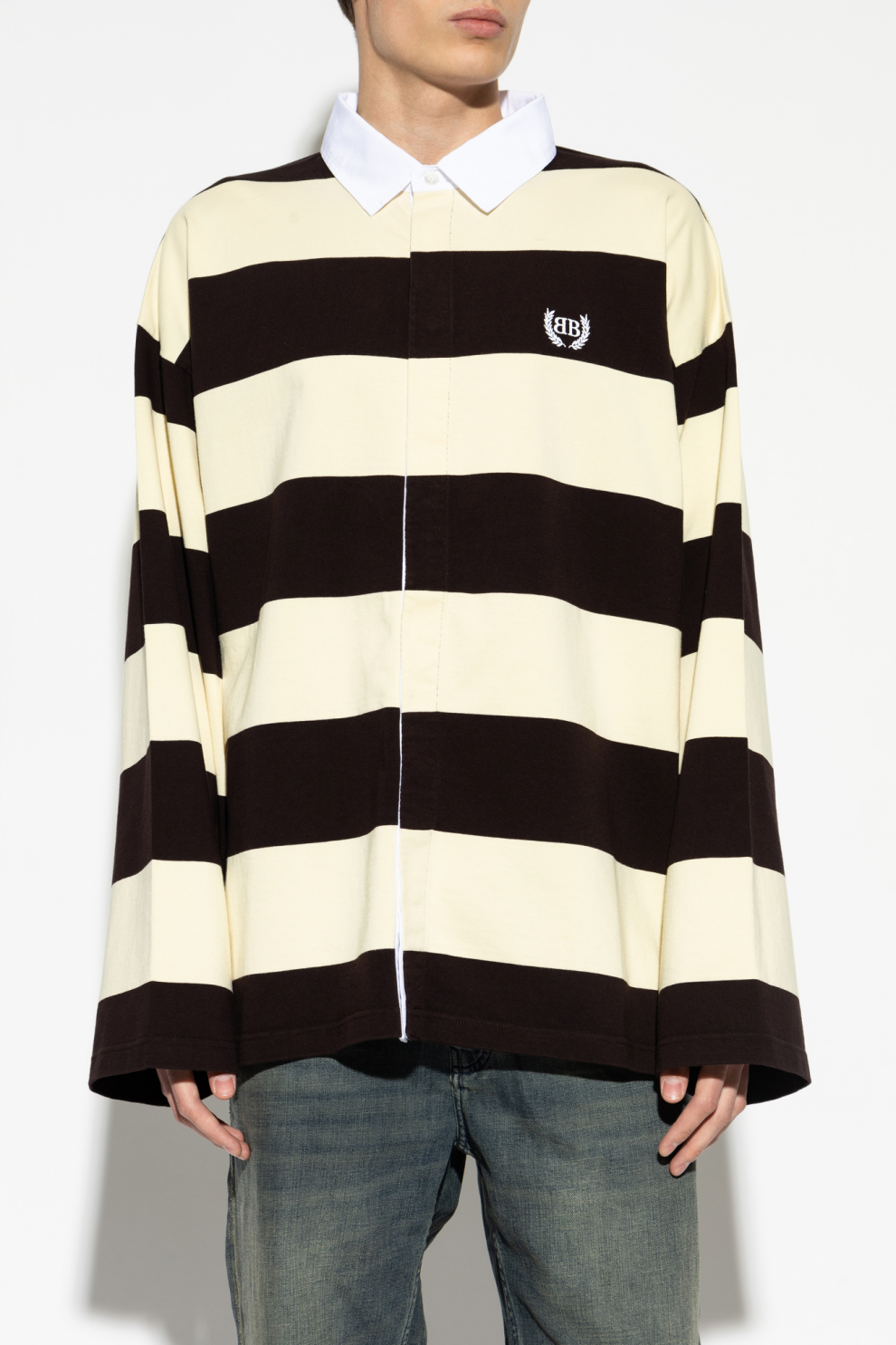 Горизонтальный полосатый рисунок в теплой палитре коричневого и кремового оттенков формирует яркий визуальный ритм, подчеркивая характерный для Balenciaga баланс между минимализмом и выразительным дизайном. Контрастный светлый воротник из более строгого материала добавляет образу структурности и легкой формальной строгости, усиливая гибридный характер модели, объединяющей элементы рубашки, поло и лонгслива.