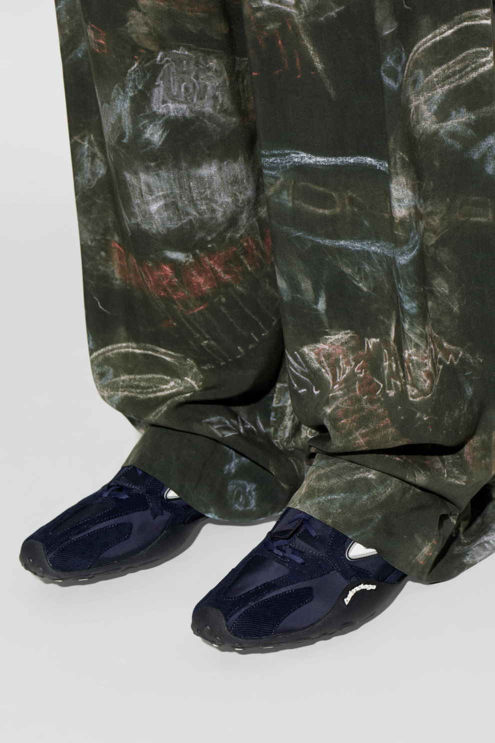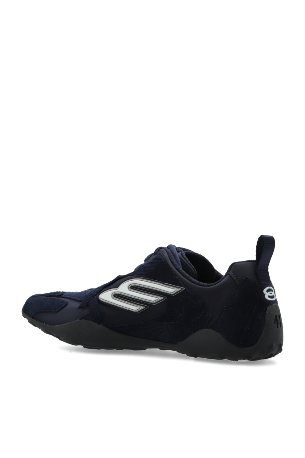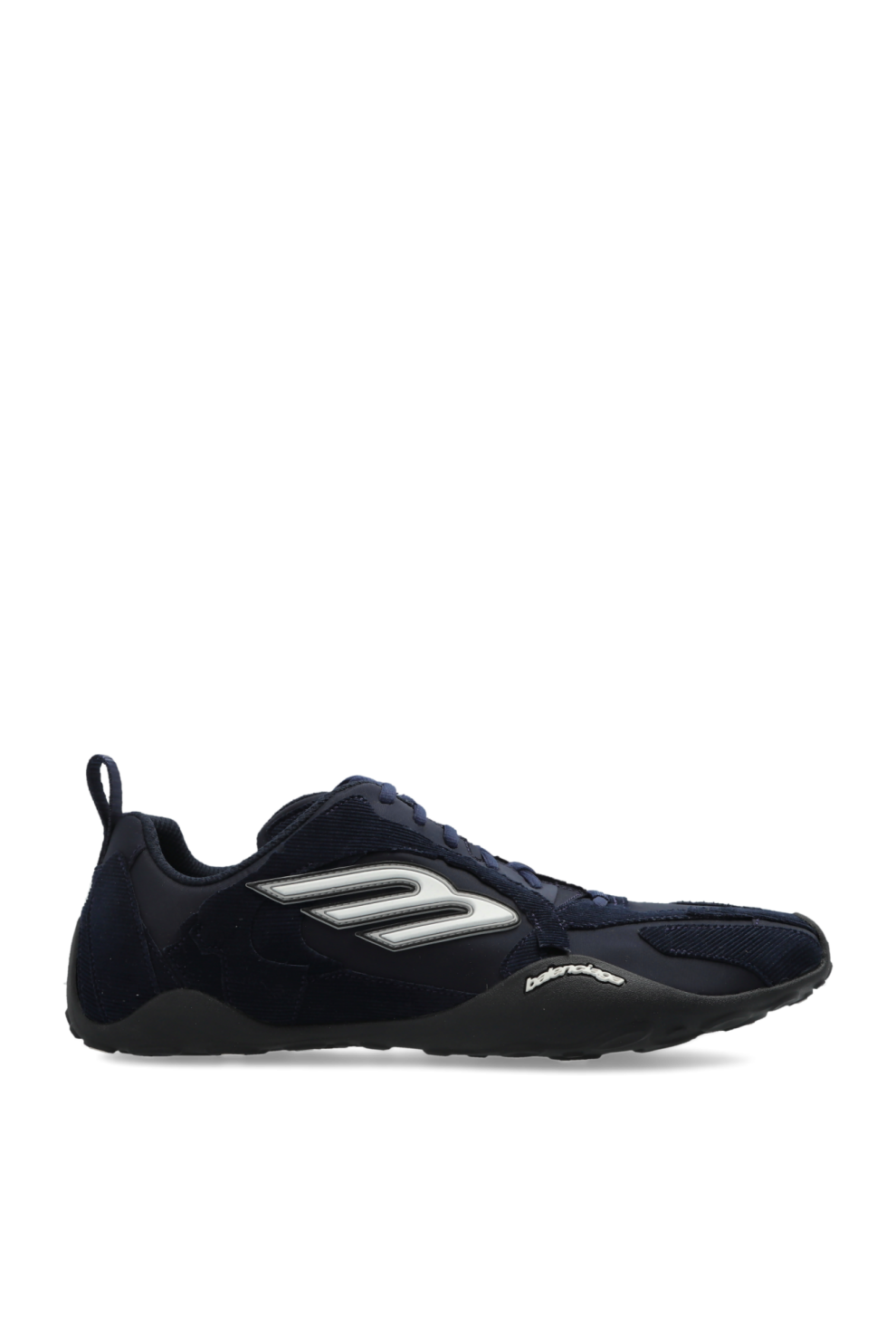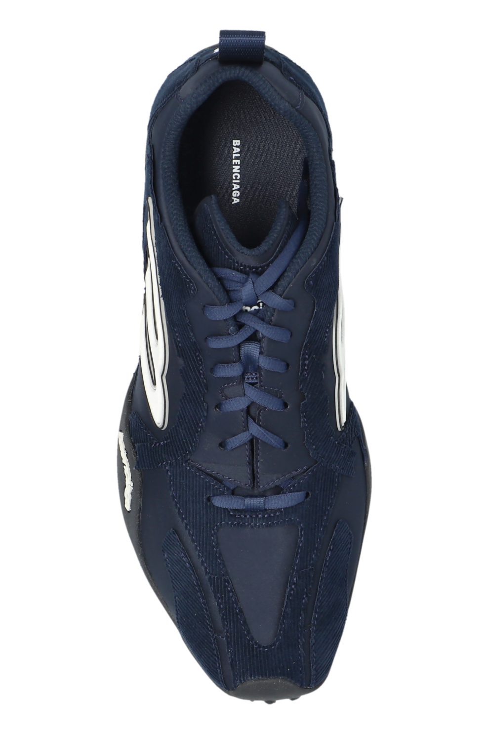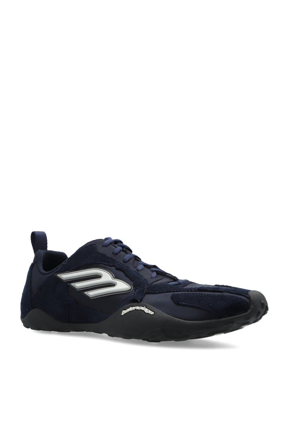 Доминирующий тёмно-синий оттенок придаёт модели глубину и универсальность, а серебристые акценты добавляют современную динамику. Рельефный логотип «B» и чёткая надпись BALENCIAGA внутри и сбоку подошвы служат изысканными фирменными деталями, подчёркивающими эксклюзивный характер изделия.