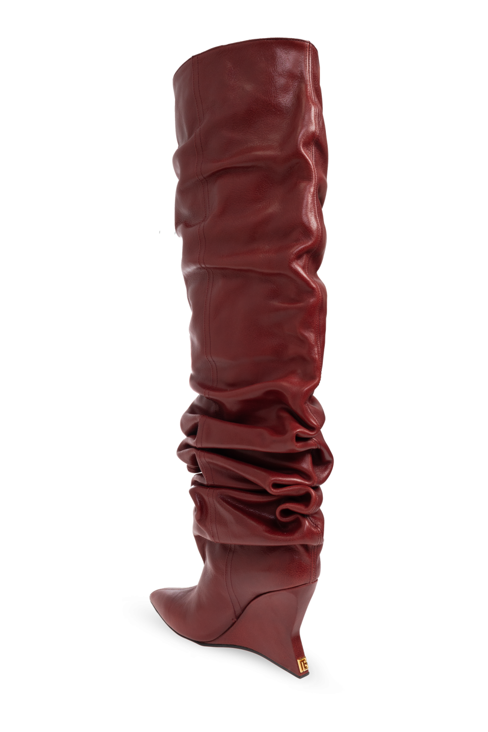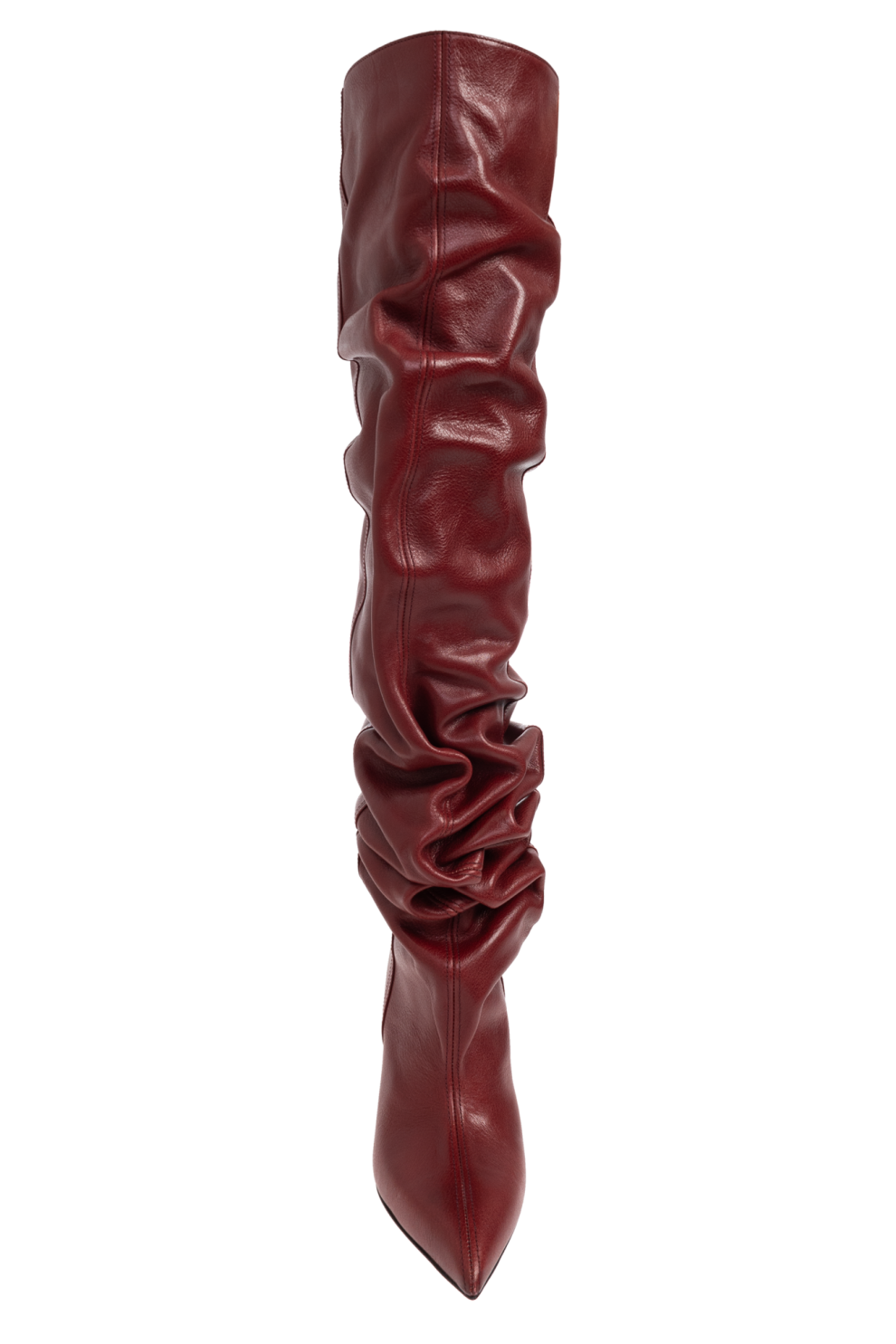 Бордовые сапоги на танкетке от Balmain — это утонченное воплощение современной роскоши с акцентом на чистоту линий и силуэт. Очень высокий верх, поднимающийся выше колена, мягко собран и оформлен без лишних декоративных элементов, позволяя форме говорить самой за себя. Гладкая натуральная кожа с легким сатиновым блеском изысканно подчеркивает насыщенный винный оттенок, добавляя образу глубину и благородство.