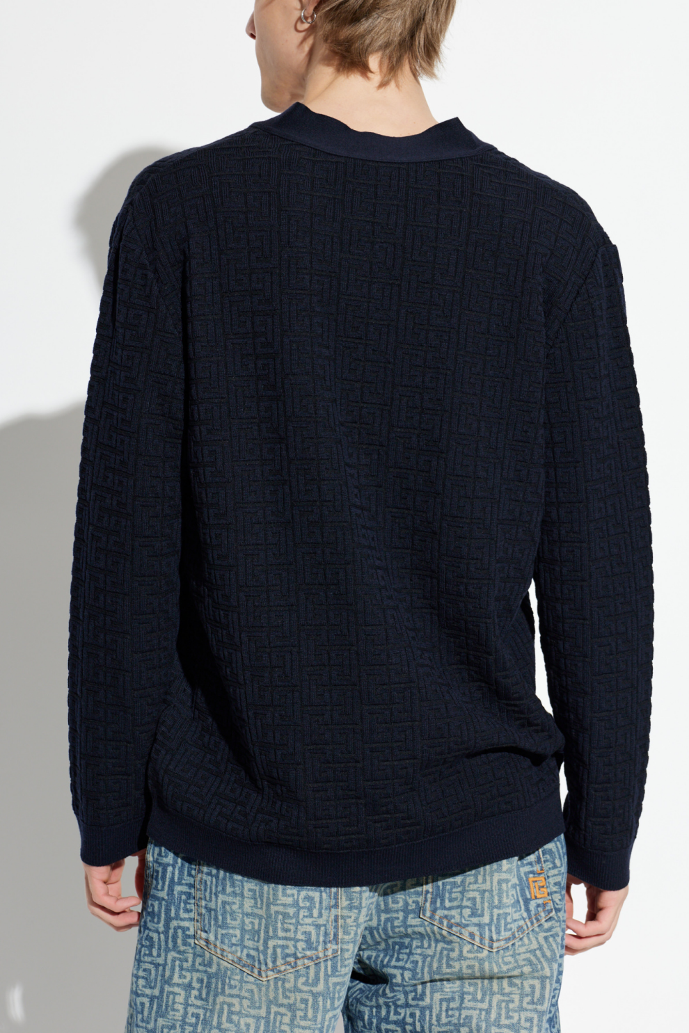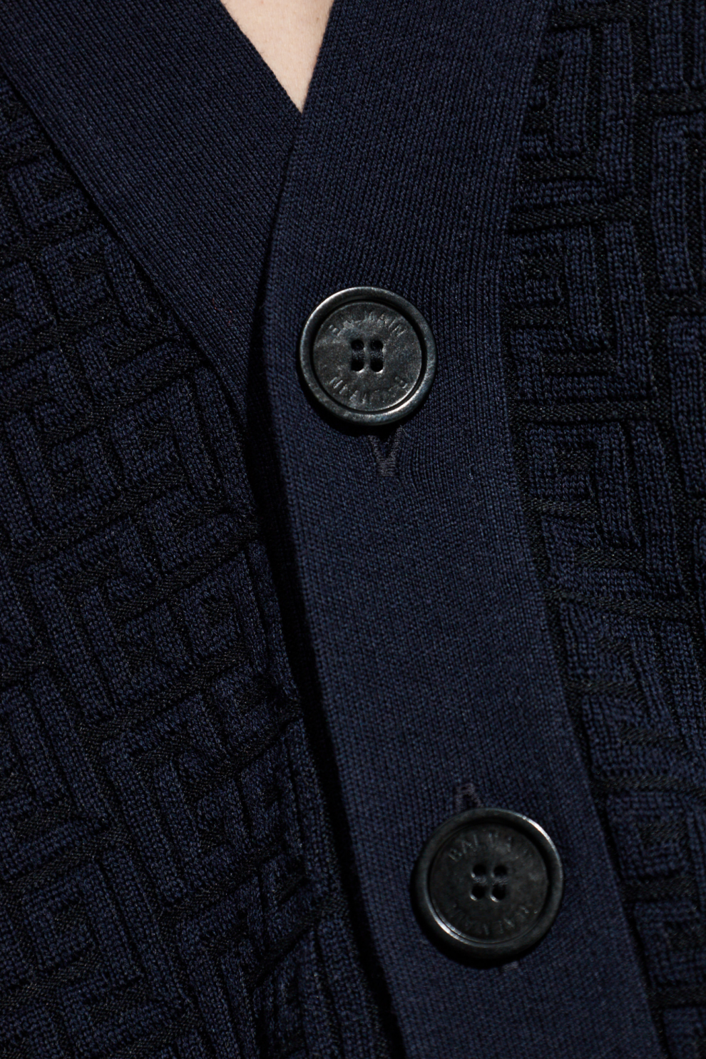 Кардиган Balmain с монограммой — это воплощение утонченной элегантности и современной изысканности. Его классический, простой дизайн дополнен глубоким V-образным вырезом и пятью большими темно-синими пуговицами, подчеркивающими уникальность изделия. Преобладающий темно-синий цвет придает всей вещи элегантность и вневременной характер.