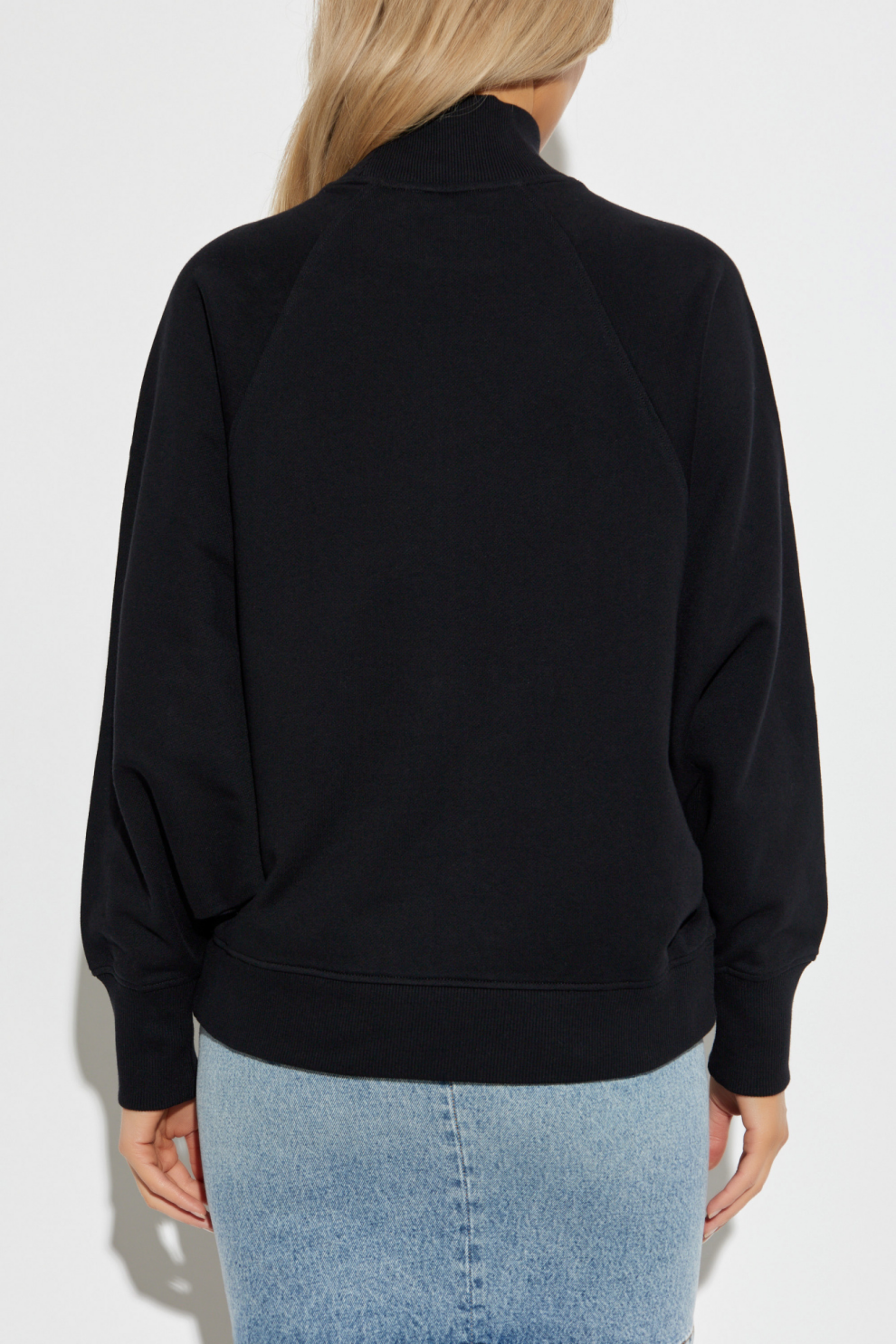 Этот свитшот Balmain с воротником-стойкой — смелая интерпретация повседневной одежды, возведённая в ранг дизайнерского заявления. Выполненный из плотного хлопкового трикотажа глубокого черного оттенка, он сочетает в себе тактильный комфорт и выразительную архитектуру формы. Свободный крой с реглан-рукавами, обладающими деликатным объемом, создает уверенный, современный силуэт, оставаясь при этом предельно комфортным.