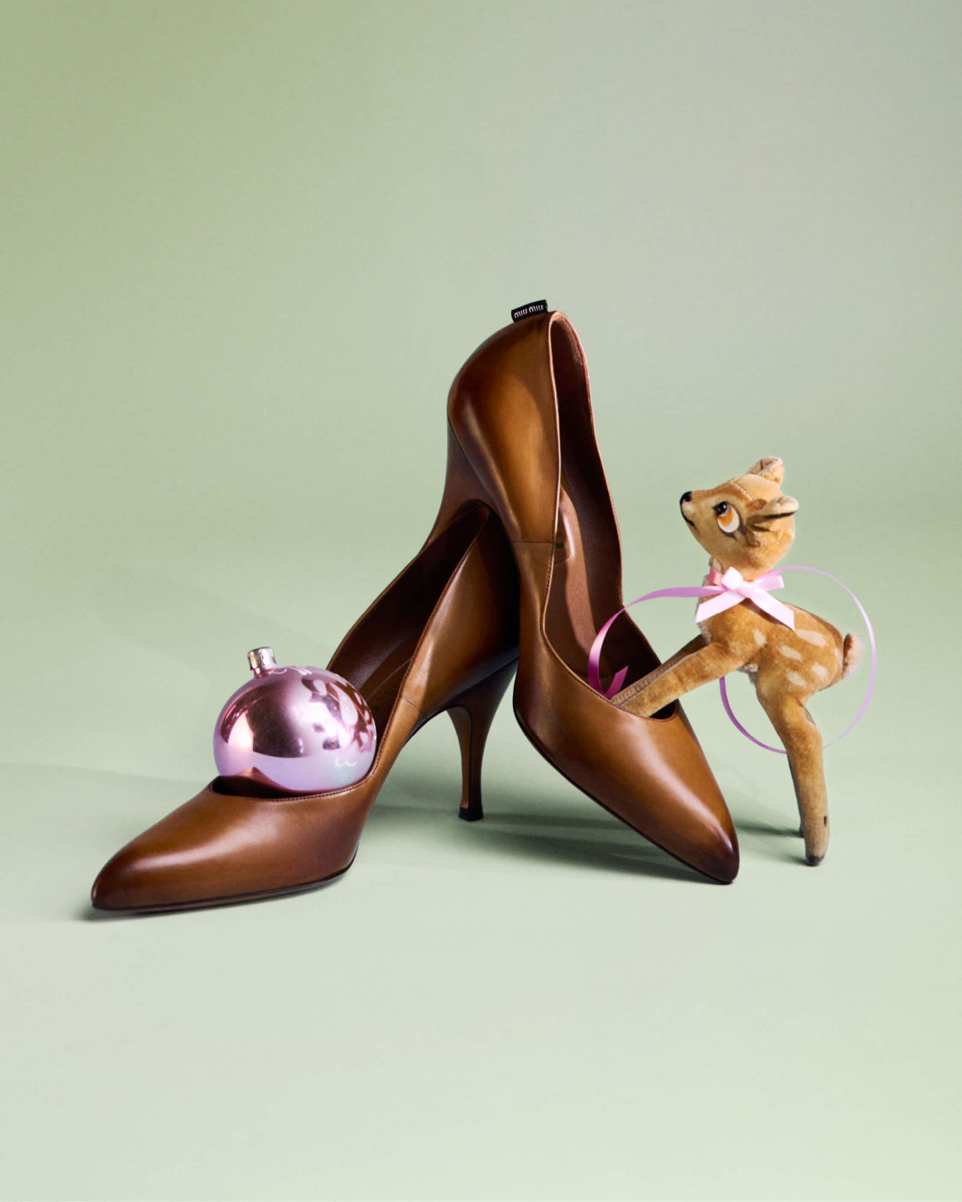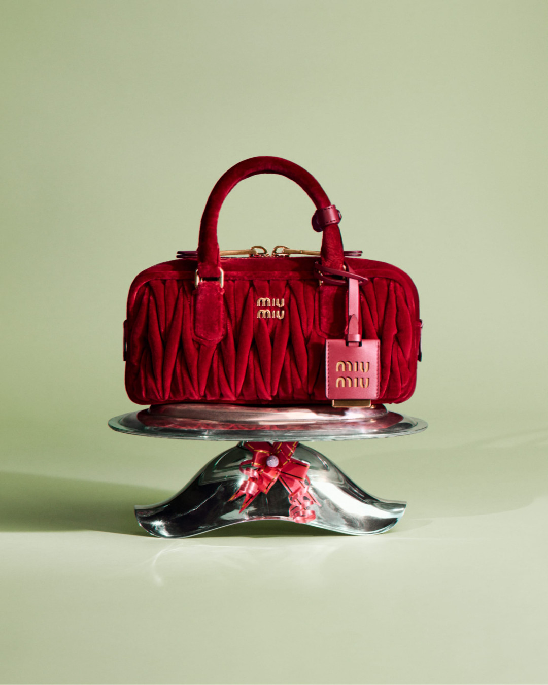 Особое внимание Miu Miu уделяет аксессуарам — как всегда, культовым. В кадре появляются: сумки Wander, Arcadie, Pocket, Beau, Solitaire, фирменный рюкзак, в классических оттенках и, специально для сезона, в глубоком аллом — праздничном, но строго выдержанном.