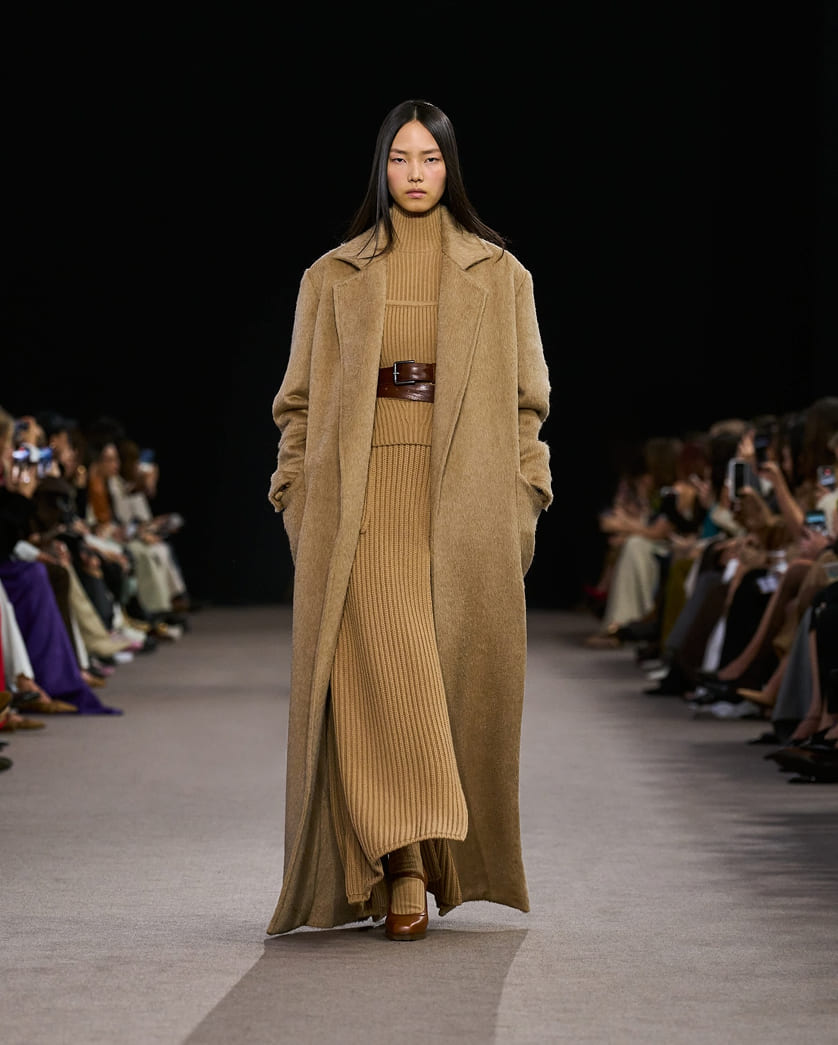 На показах Max Mara бежевый всегда был их главным героем — бренд вновь подтвердил свой статус мастера «невидимой элегантности». Пальто-халаты из шерсти, песочные тотал-луки и мягкие трикотажные комплекты создавали образ женщины, уверенной в себе без необходимости говорить громко.