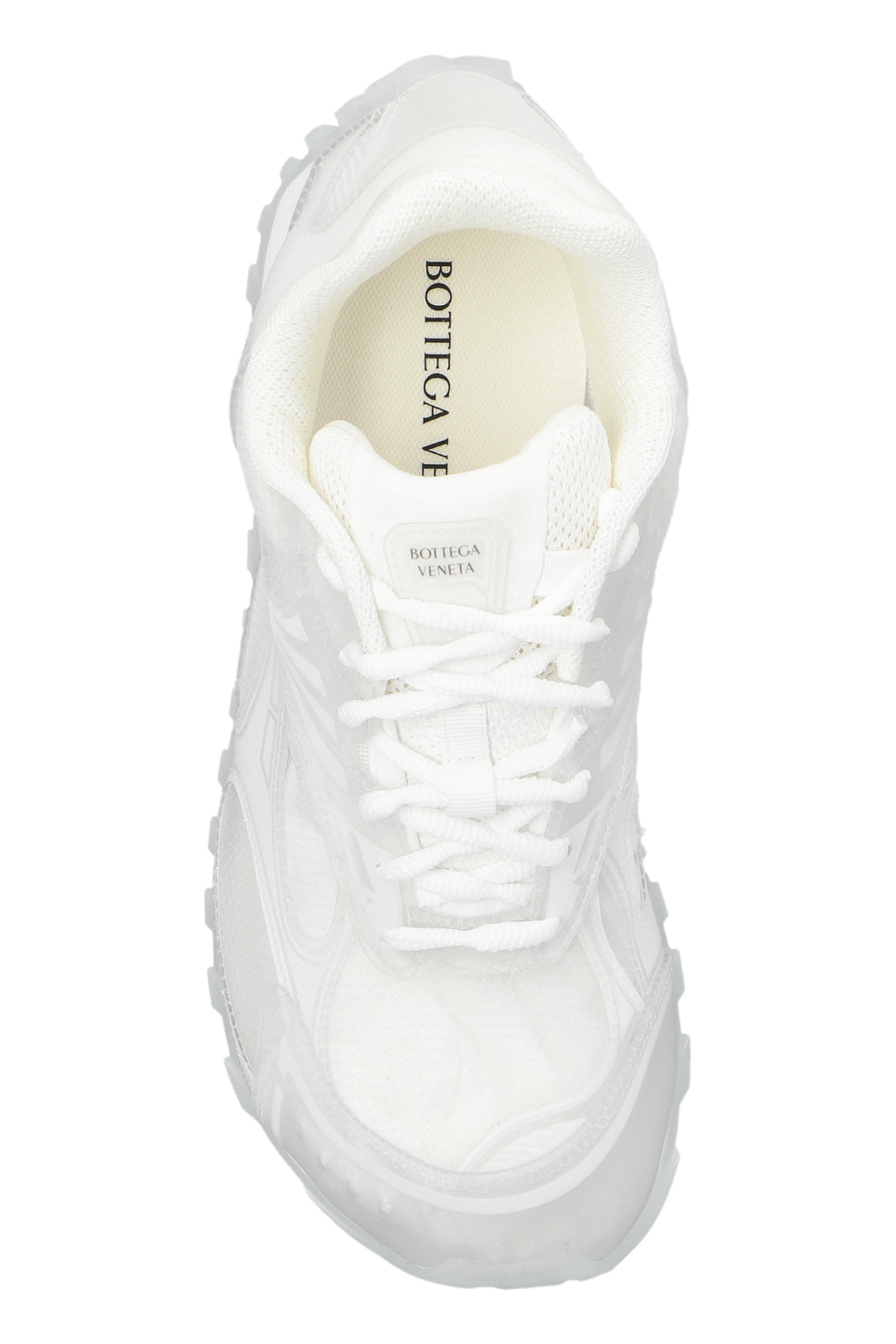 Многослойный верх выполнен из сочетания гладких, сетчатых и прозрачных технических материалов, обеспечивающих лёгкость и воздухопроницаемость. Аккуратная строчка и структурные элементы придают конструкции выразительность, сохраняя фирменную сдержанность эстетики Bottega Veneta.