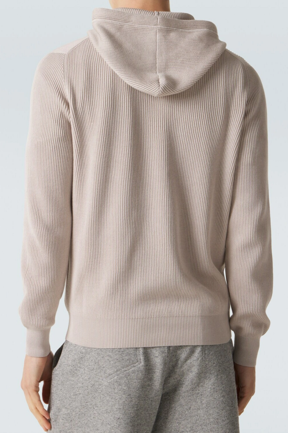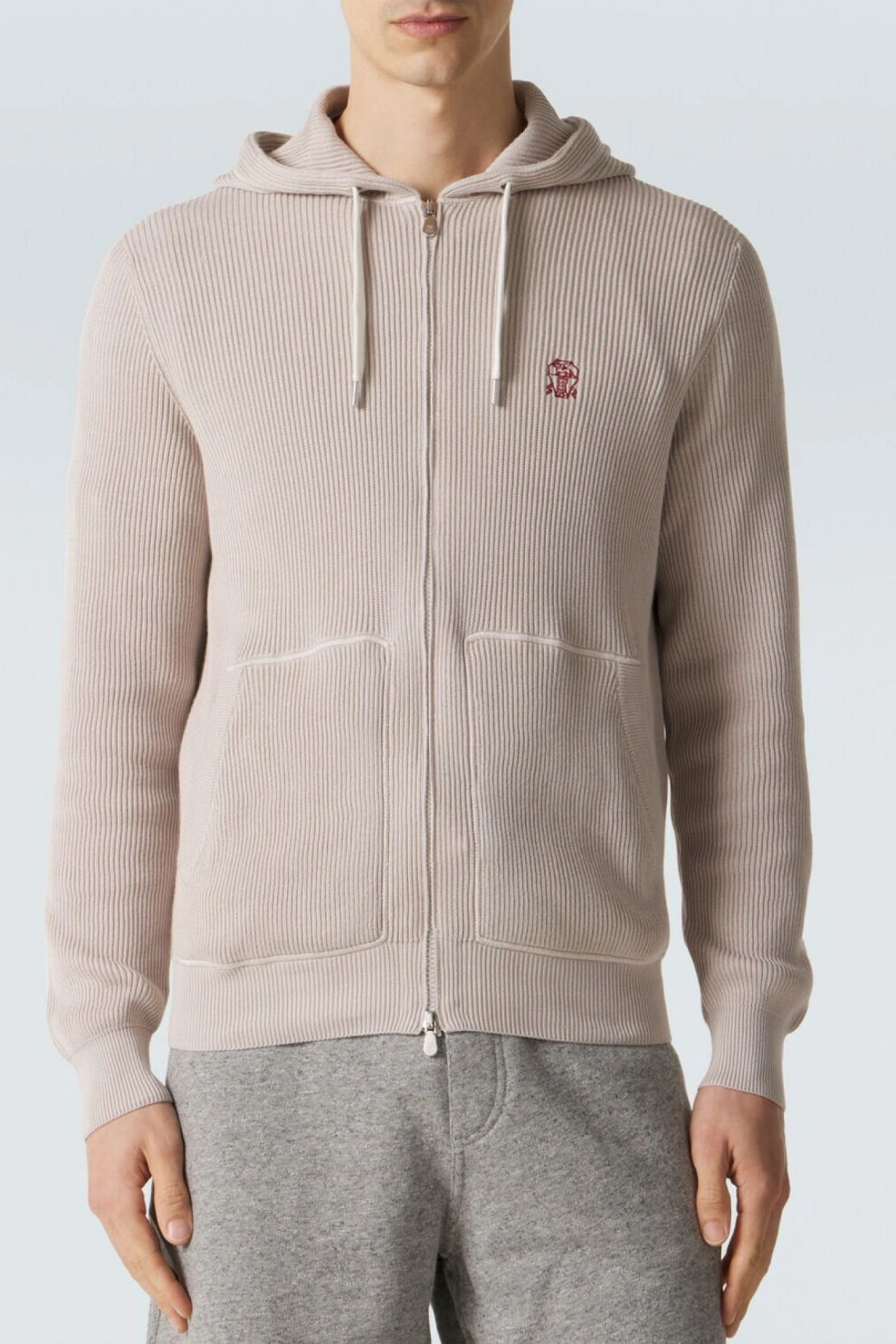 Худи на молнии от Brunello Cucinelli в благородном бежевом оттенке Juta воплощает философию сдержанной роскоши и безупречного итальянского стиля. Модель выполнена из высококачественного хлопка с фактурной ребристой вязкой, которая придаёт силуэту выразительность и подчёркивает утончённый характер изделия.