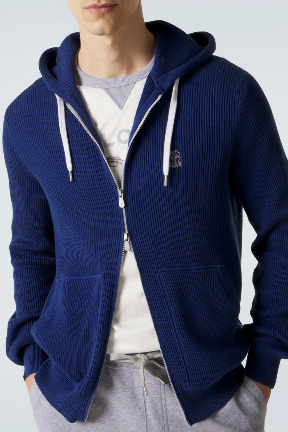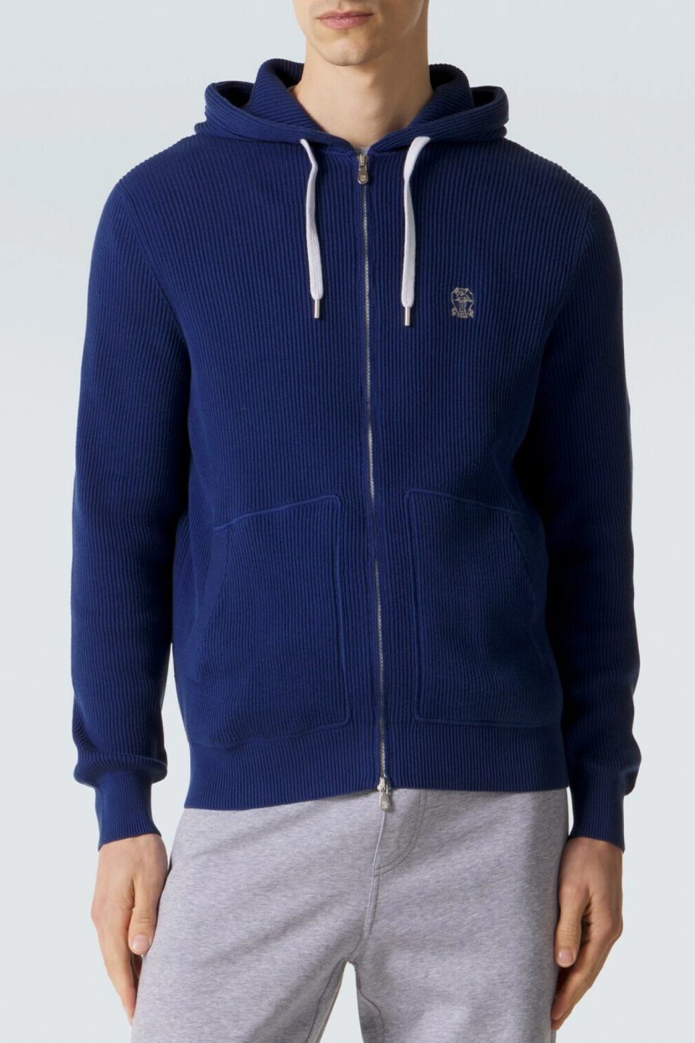 Мужское худи Brunello Cucinelli в насыщенном тёмно-синем оттенке Royal Blue — элегантное сочетание современного комфорта и безупречного итальянского мастерства. Изделие выполнено из 100% натурального хлопка и отличается мягкой ребристой текстурой, которая подчёркивает премиальное качество материала и безукоризненный крой.