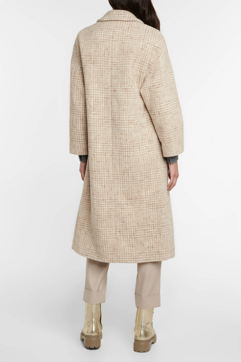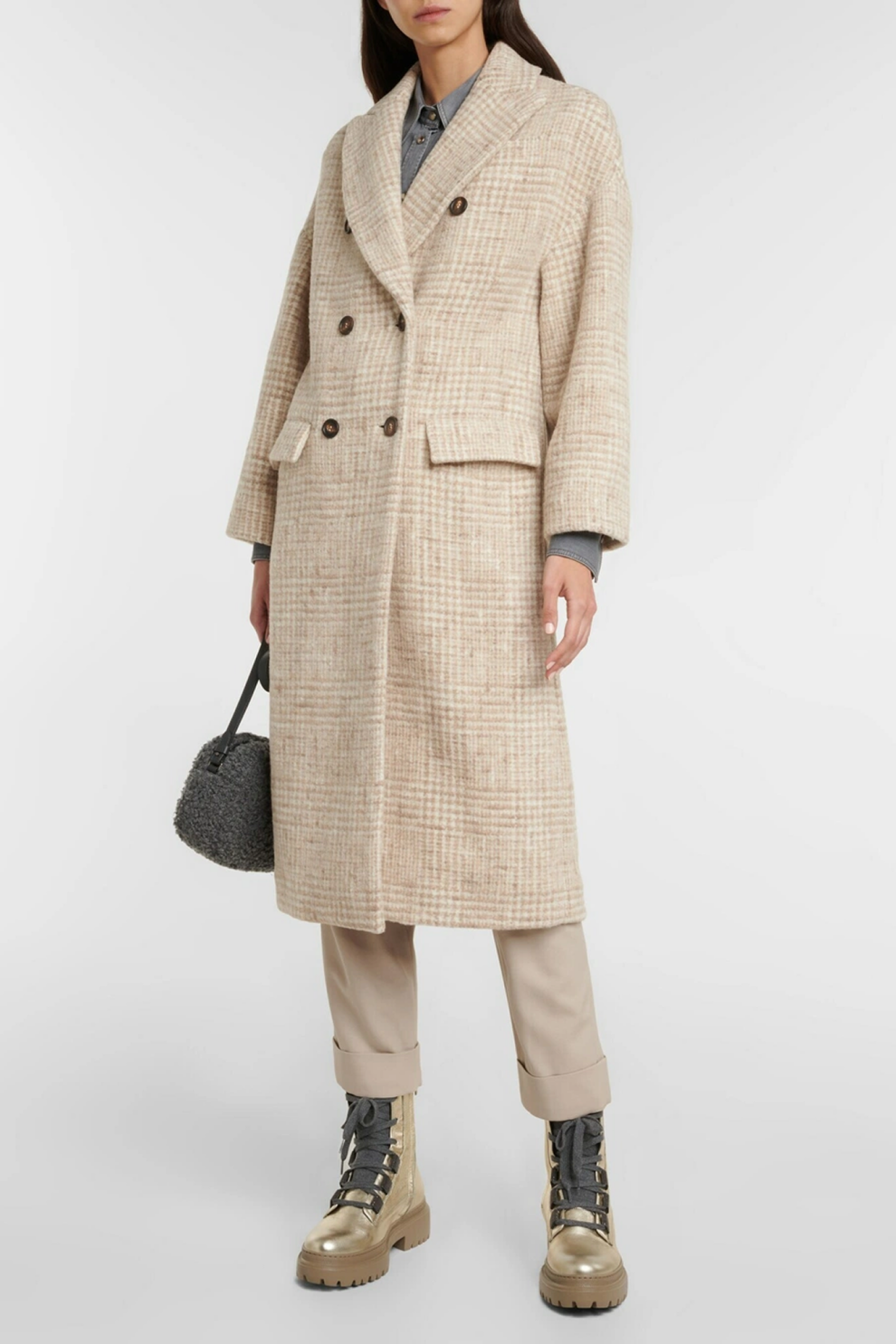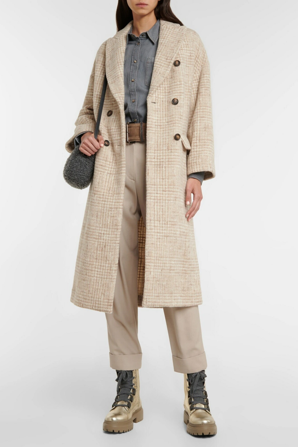 Это длинное пальто Brunello Cucinelli объединяет традиции классического портновского искусства и фирменные декоративные коды бренда. Модель выполнена из роскошной смеси альпаки и шерсти с культовым узором Prince of Wales, который придаёт образу аристократичную строгость.