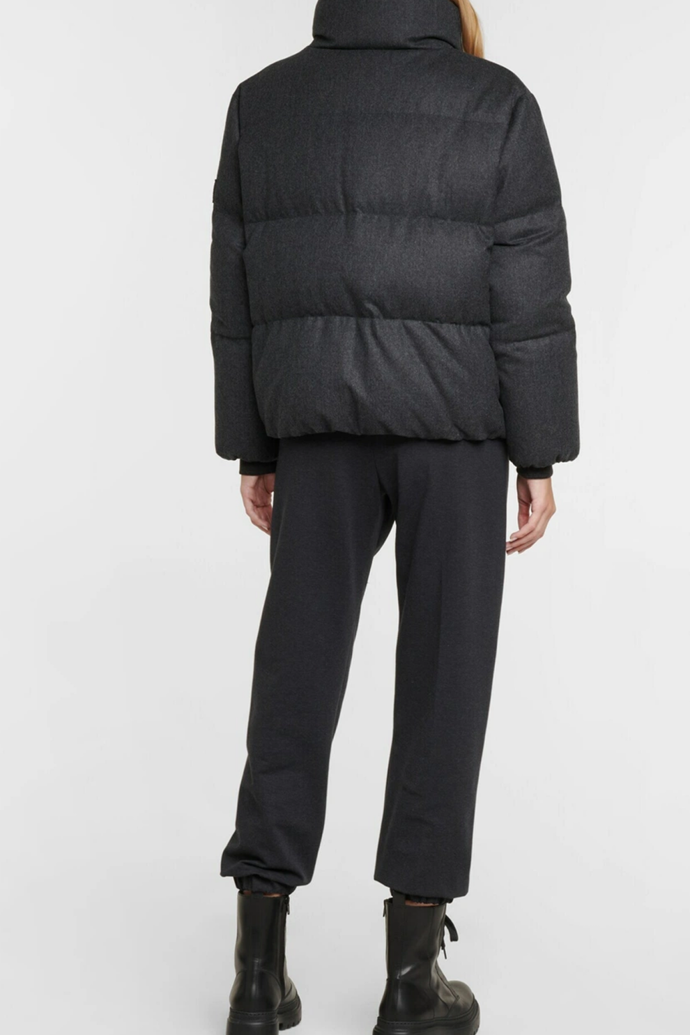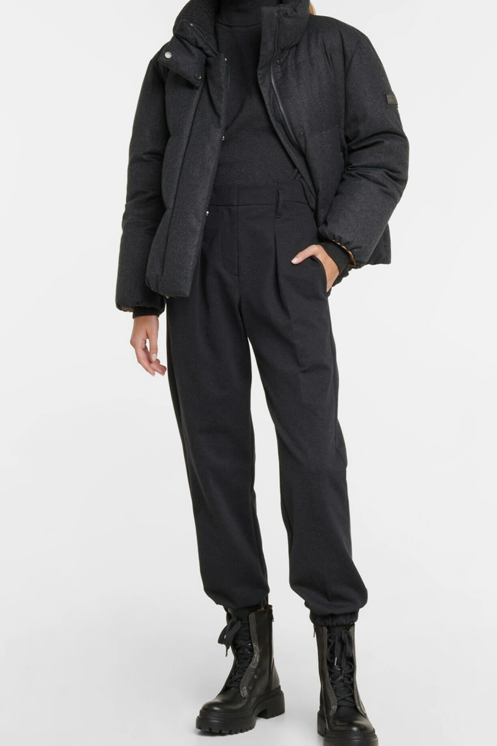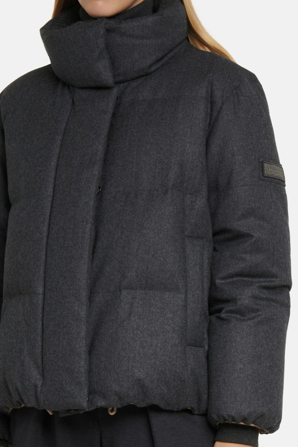 Высокий воротник с вязаной внутренней отделкой, манжеты с трикотажной резинкой и регулируемая талия подчёркивают внимание бренда к комфорту и деталям. Декоративная нашивка с отделкой monili на рукаве добавляет фирменный акцент, оставаясь сдержанной и элегантной.