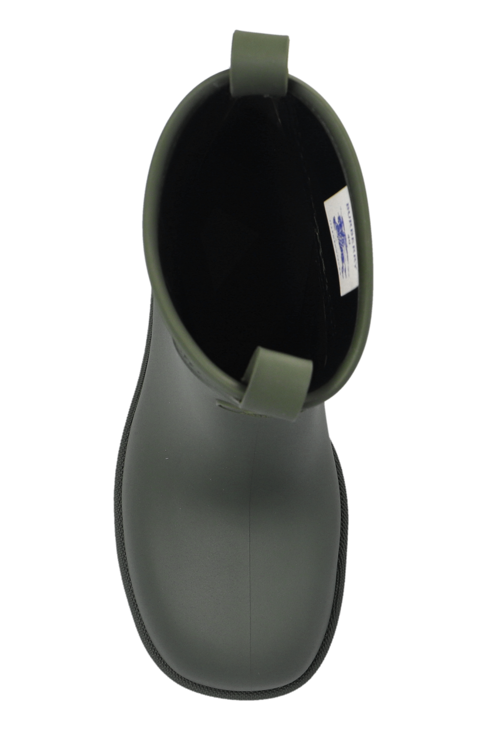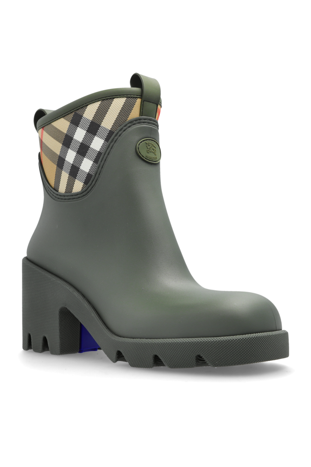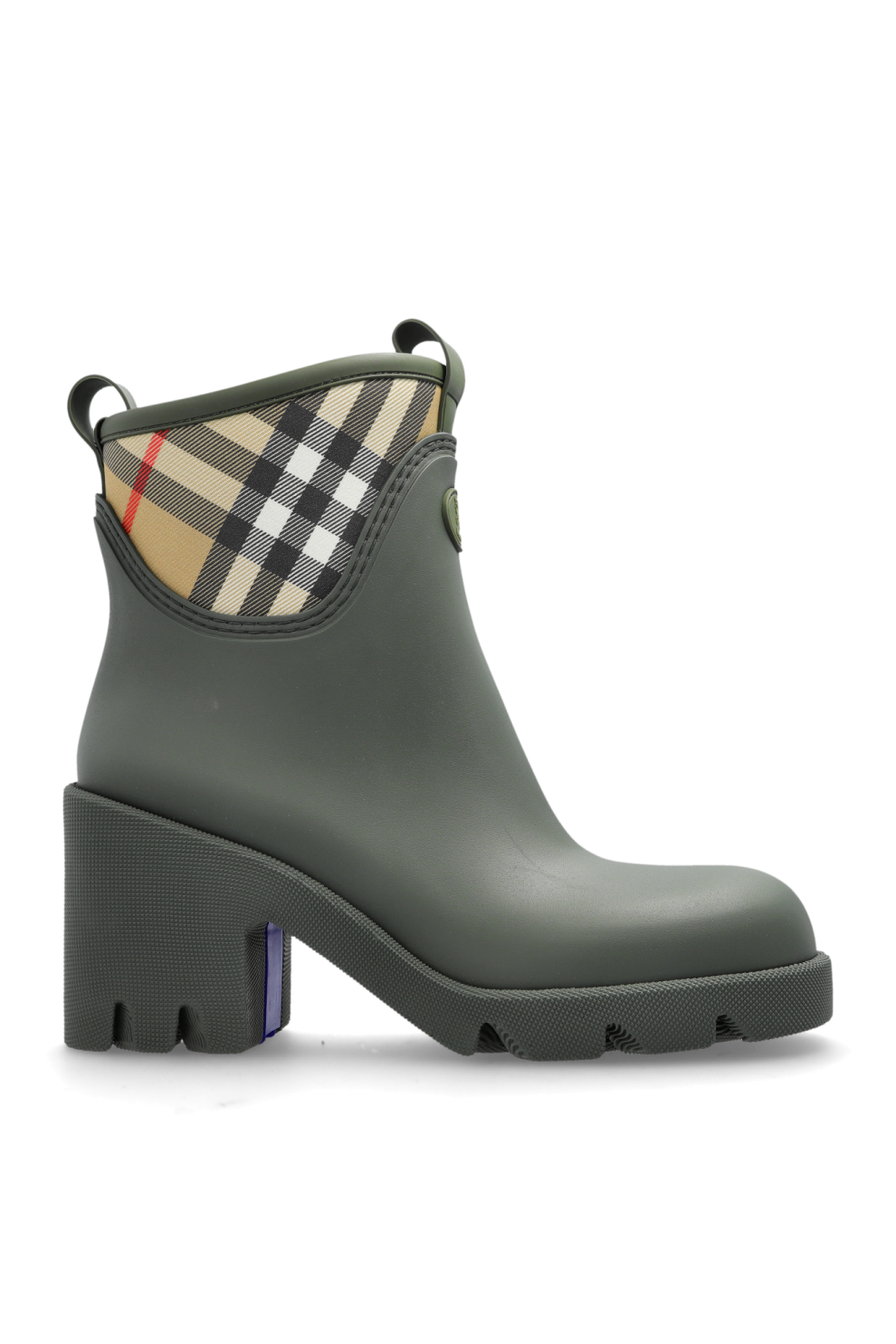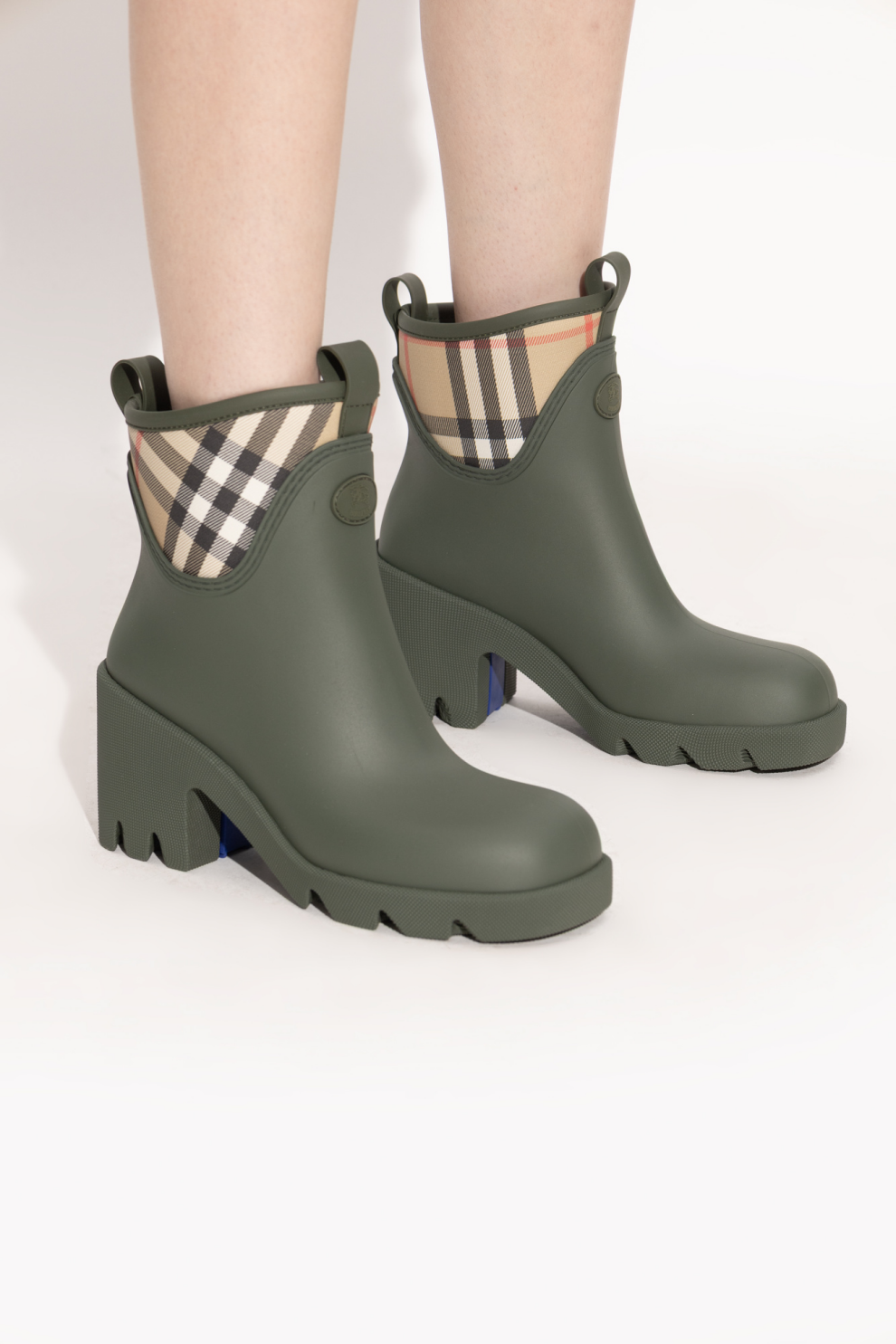 Резиновые сапоги Burberry «Marsh» на каблуке воплощают современную элегантность, где традиции сочетаются с изысканным дизайном. Укороченное голенище слегка приоткрывает щиколотку, а глубоко рифленая подошва и широкий массивный каблук обеспечивают уверенную походку даже в ненастную погоду.