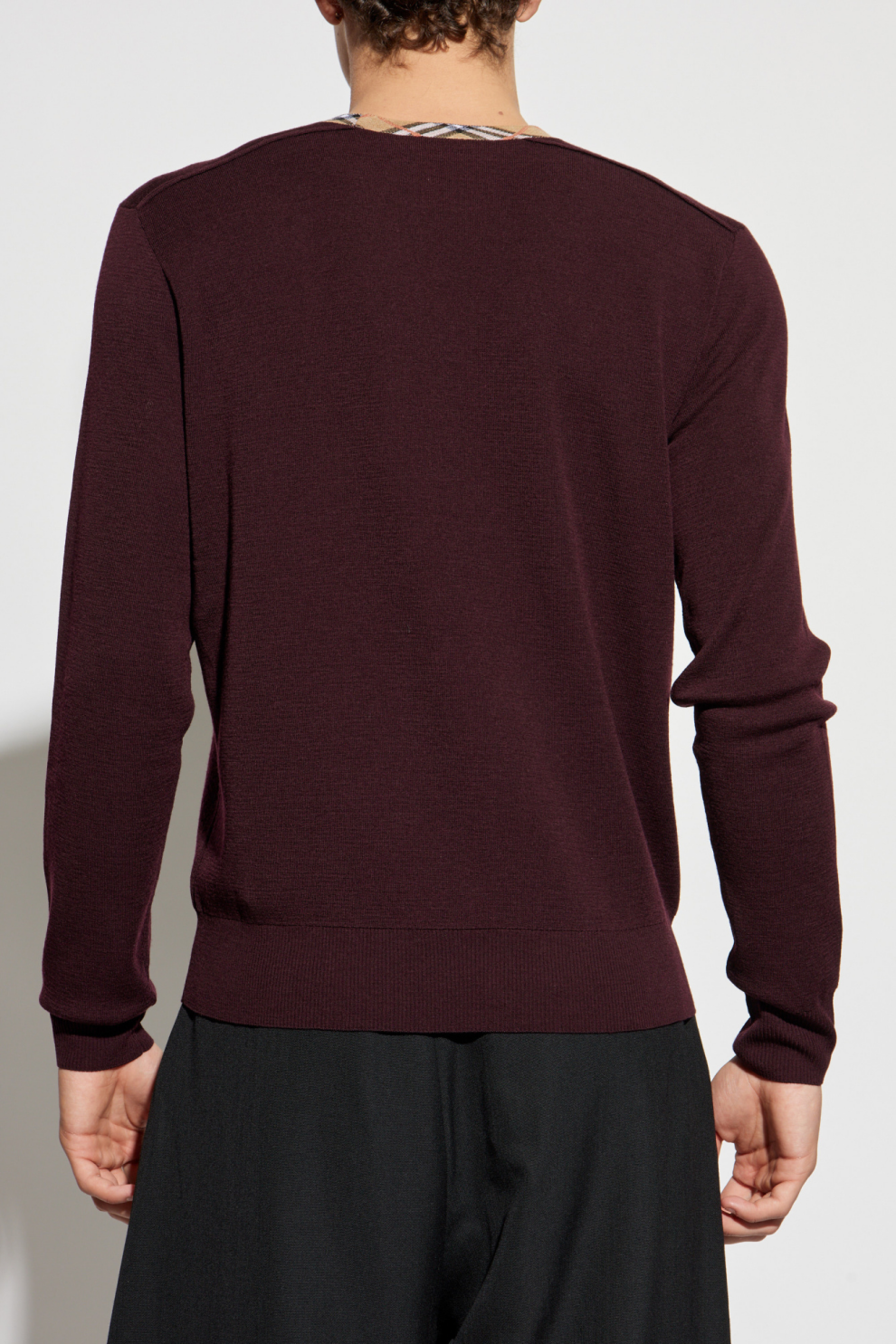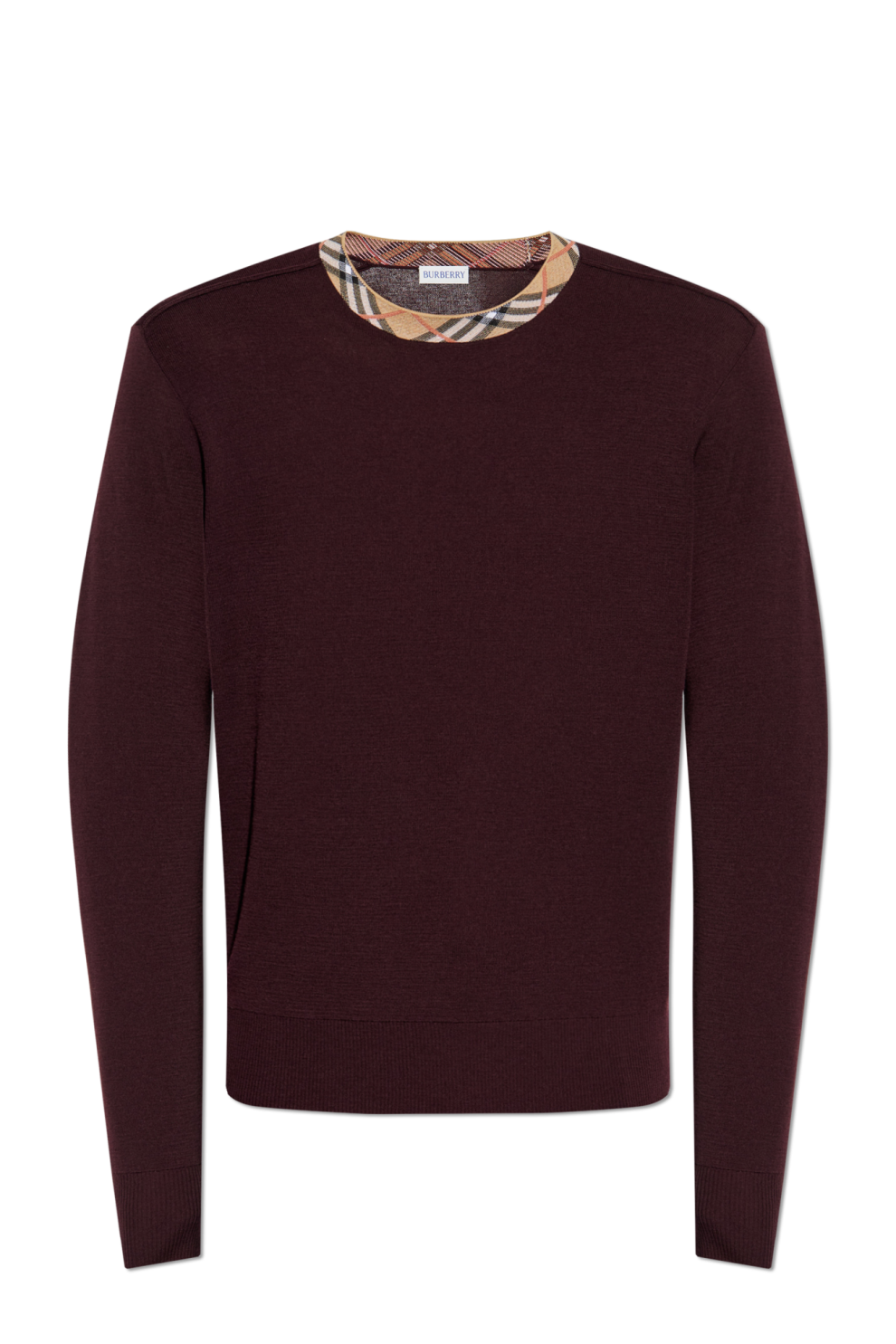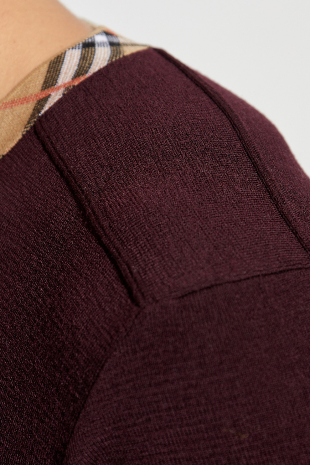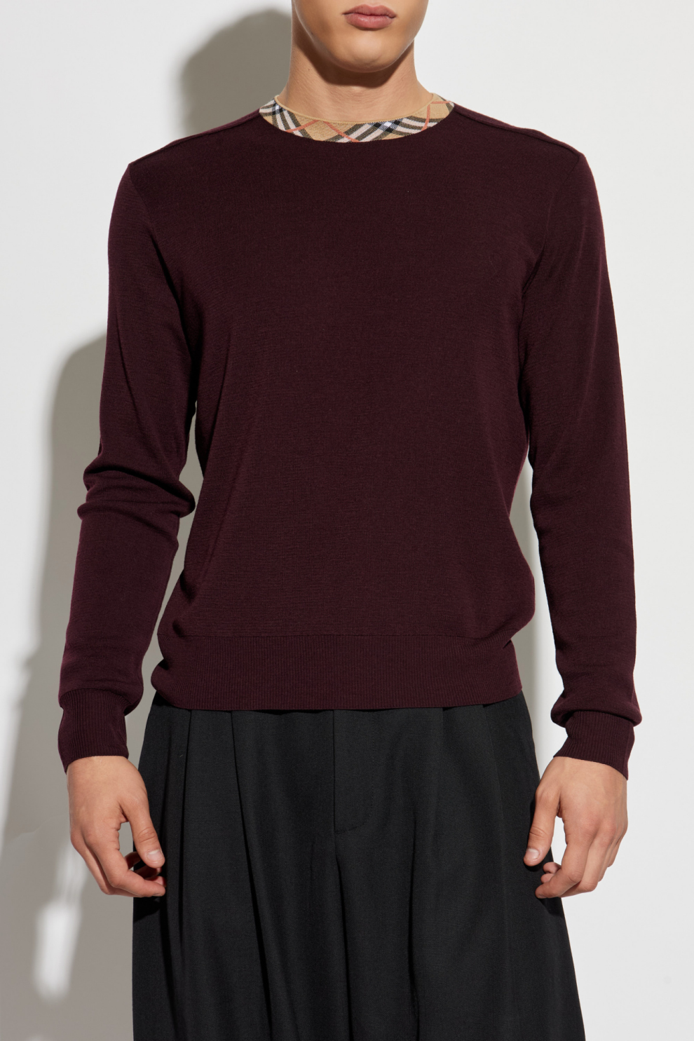 Особые дизайнерские акценты — круглый вырез с контрастной окантовкой в культовую клетку Burberry и аккуратная геометрическая строчка на плечах — придают свитеру современный характер, делая его узнаваемым и уникальным.