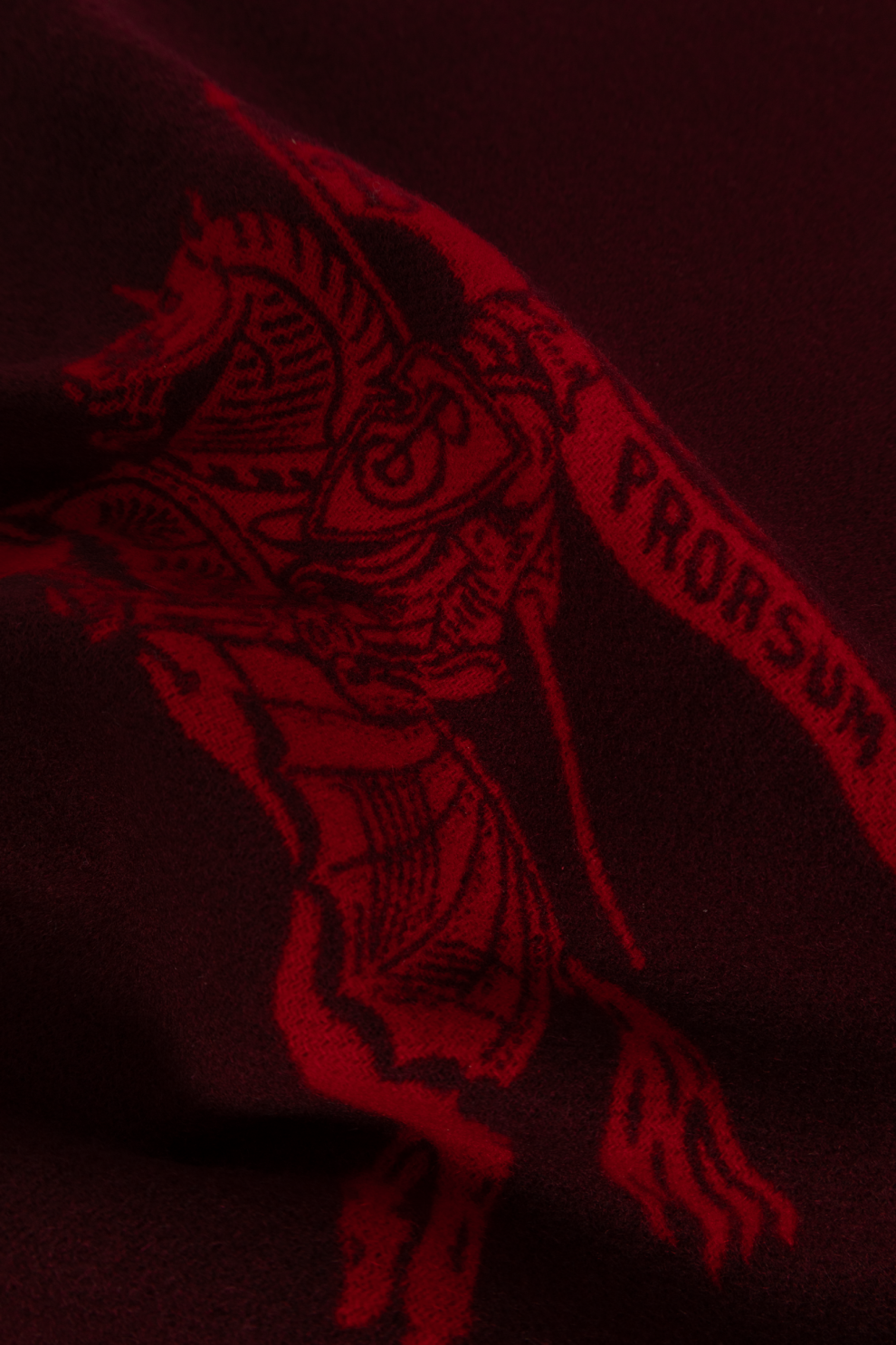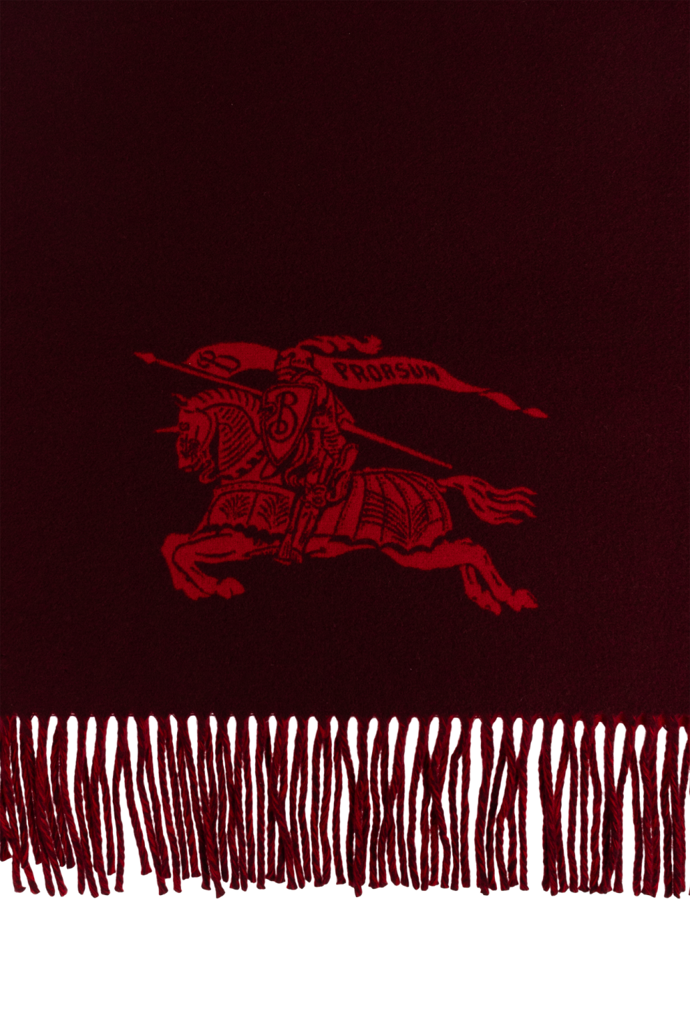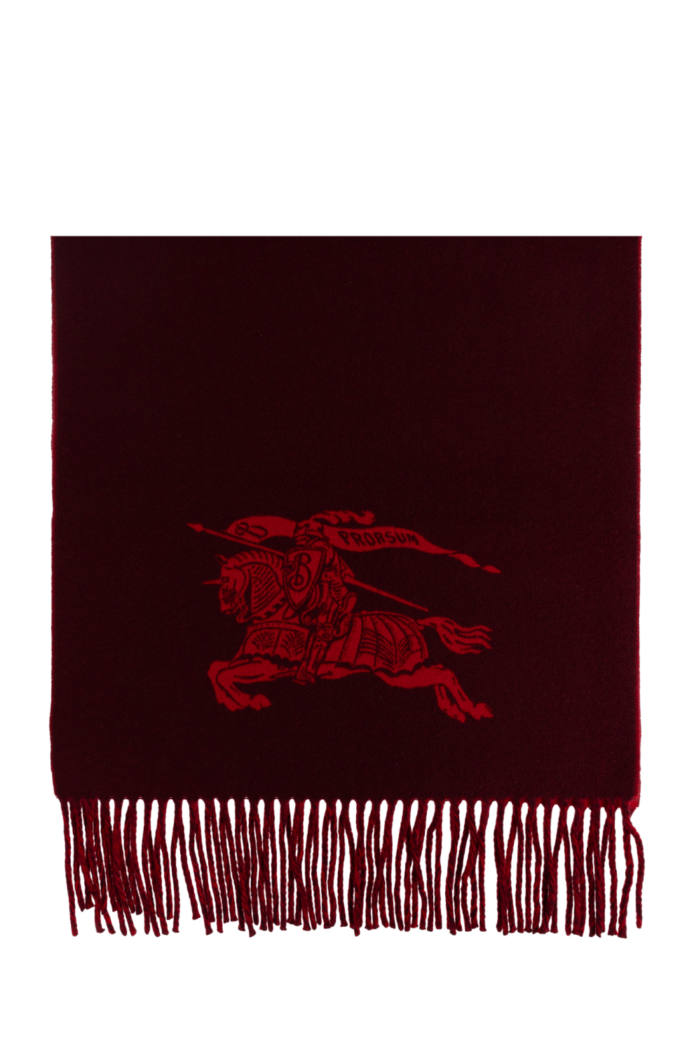 Кашемировый шарф Burberry с бахромой — вершина утончённой элегантности в мире роскошных аксессуаров. Шарф классической прямоугольной формы изготовлен из кашемира высочайшего качества, который восхищает своей мягкостью, пушистостью и лёгким естественным блеском. Доминирующий цвет этой модели — темно-красный, шарф украшен интригующим принтом с изображением рыцаря на коне со щитом и вымпелом, дополненным надписью «PRORSUM» — яркий акцент, отсылающий к традициям и престижу бренда Burberry.