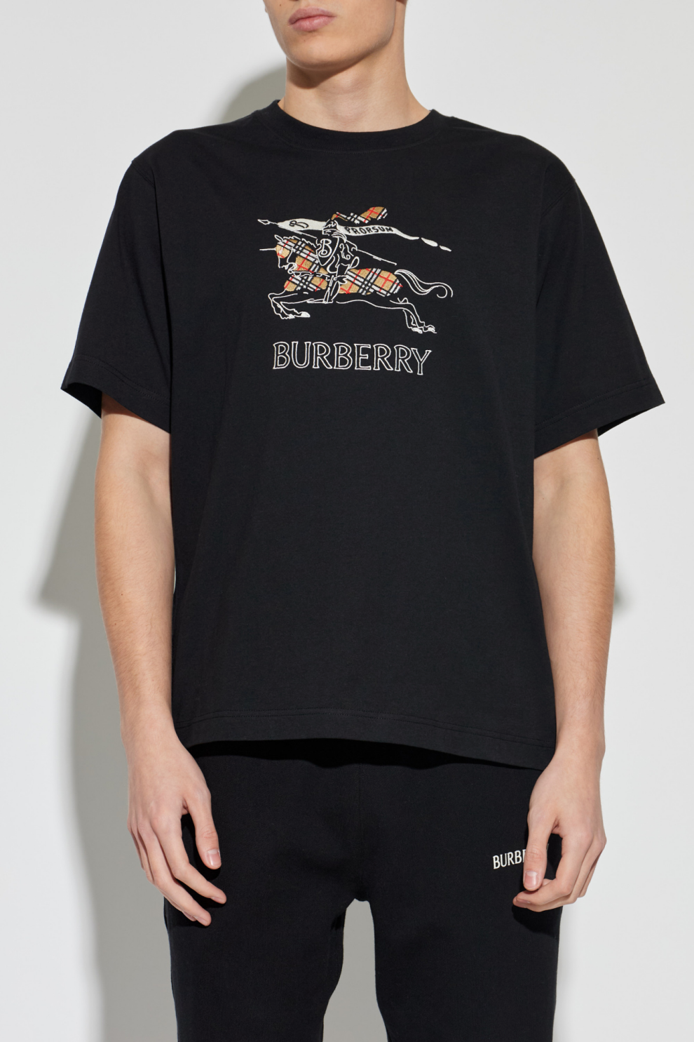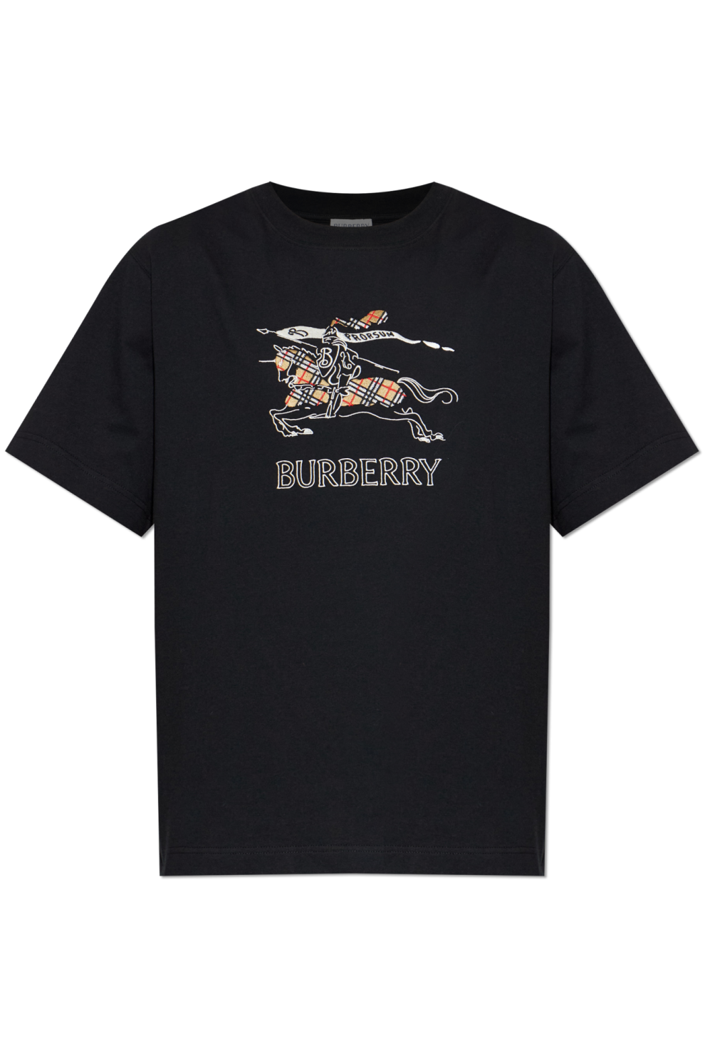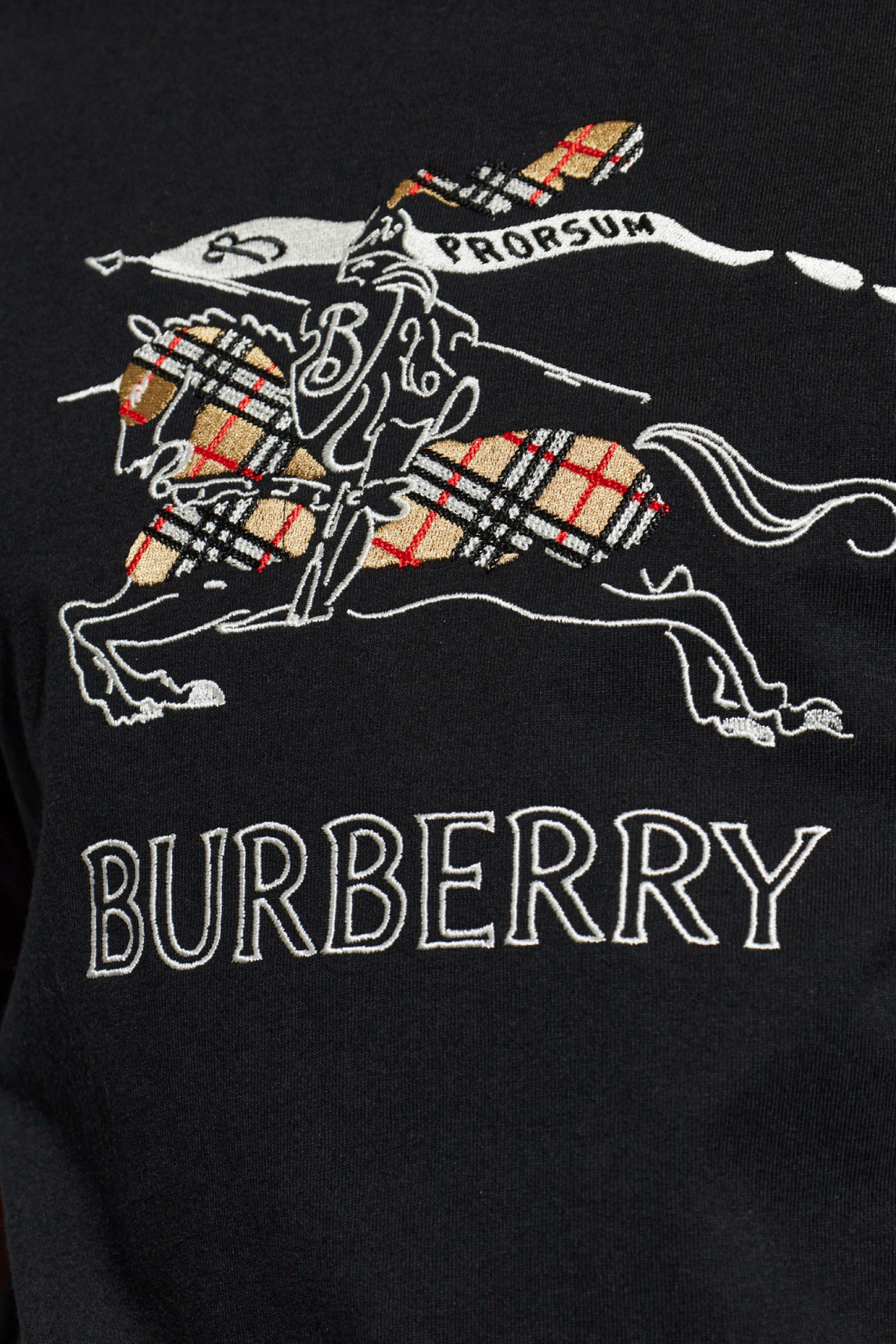 Центральный элемент дизайна — эффектная аппликация с силуэтом всадника на коне, выполненный в фирменной клетчатой текстуре, дополненный крупной надписью «BURBERRY». Ручная обработка деталей и выразительный логотип подчёркивают эксклюзивность модели, делая её уникальным предметом гардероба. Черный цвет изделия придаёт универсальность и подчёркивает его вневременный стиль, а гладкая спина сохраняет чистоту и минималистичную эстетику.