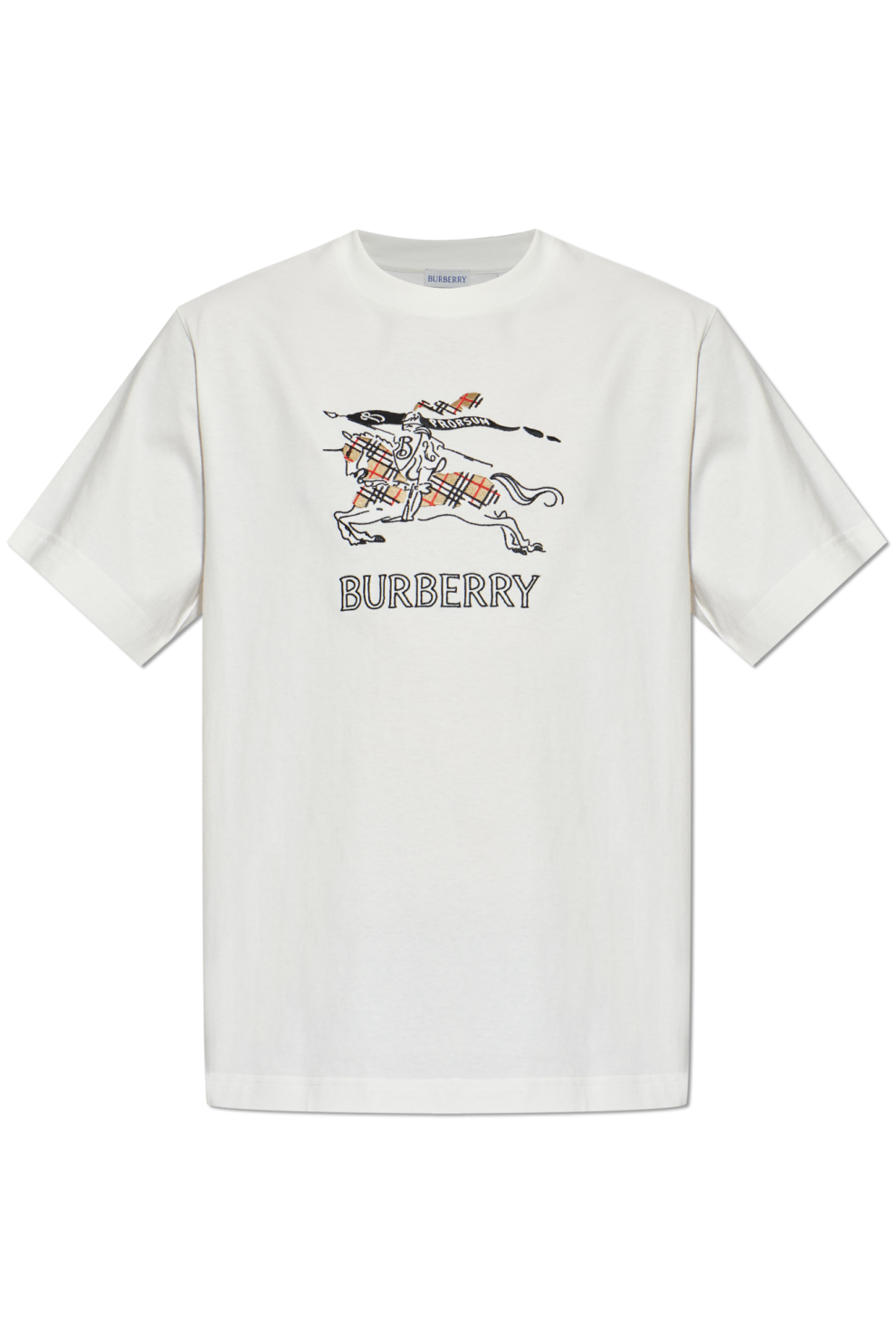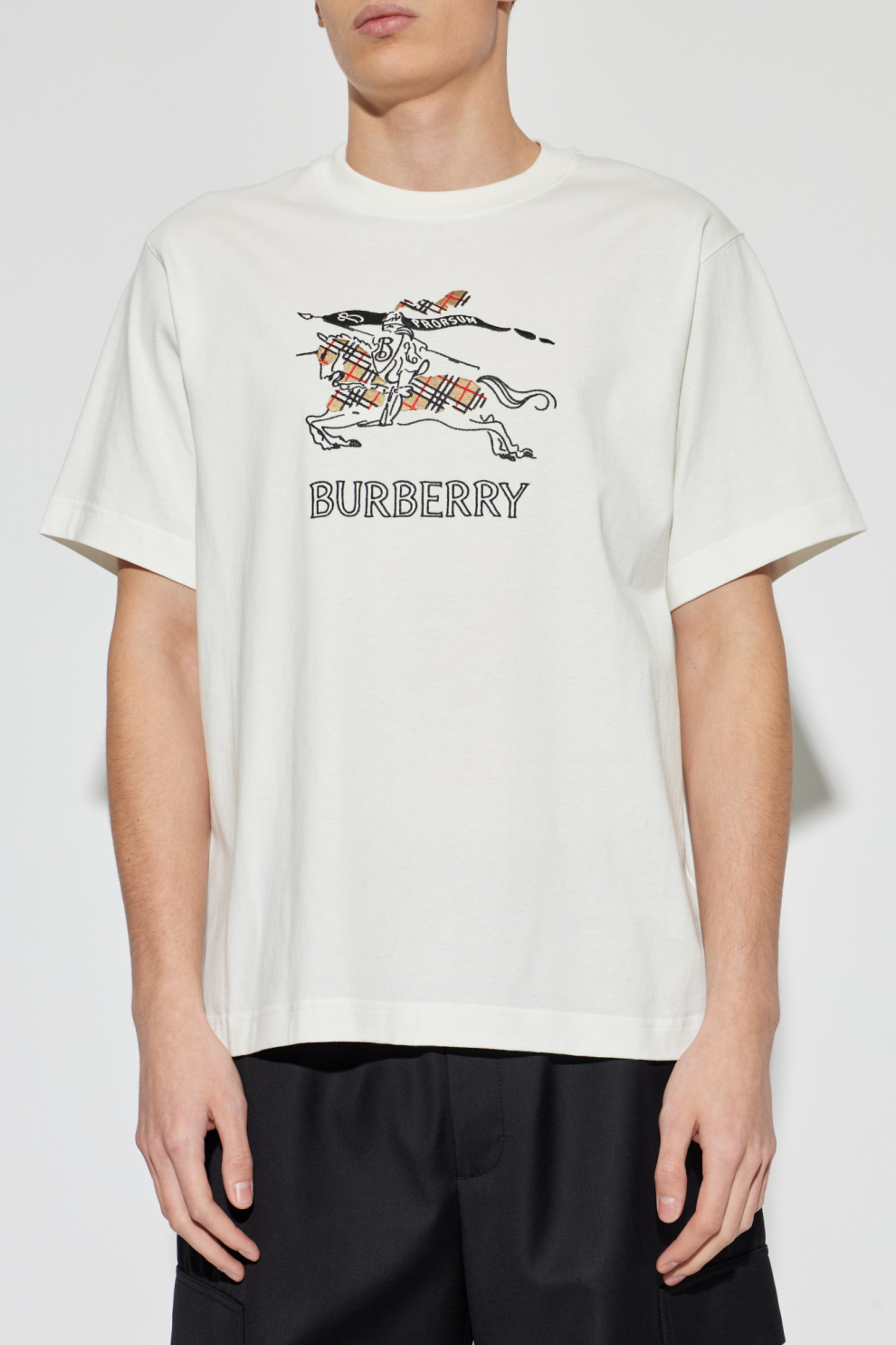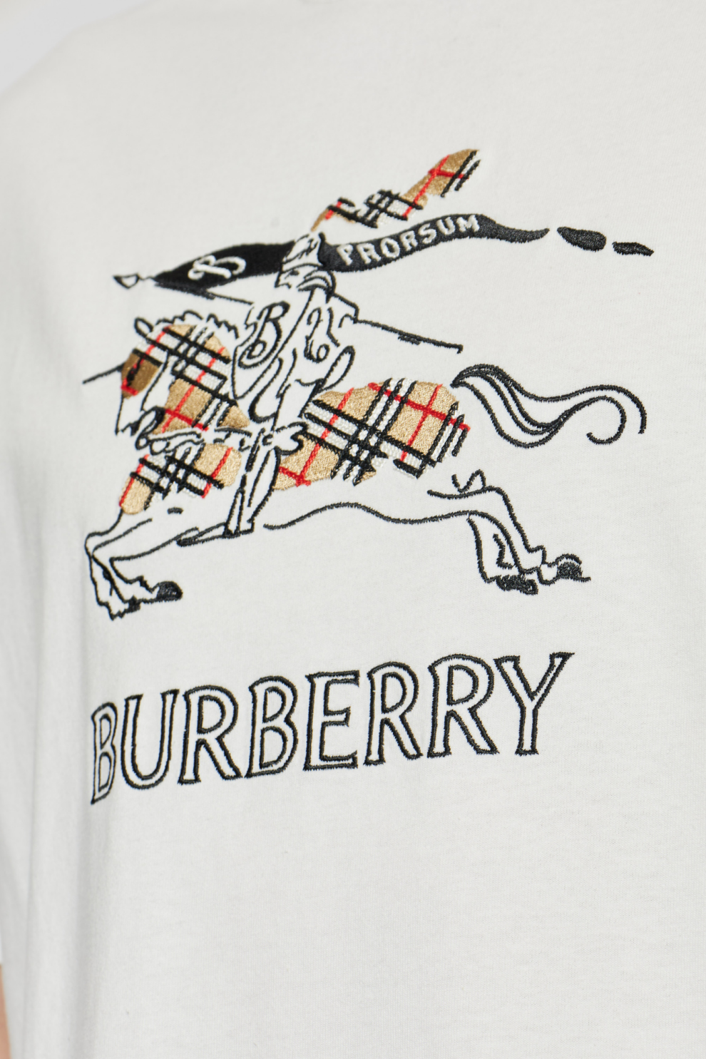 Центральный элемент дизайна — эффектная аппликация с силуэтом всадника на коне, выполненный в фирменной клетчатой текстуре, дополненный крупной надписью «BURBERRY». Ручная обработка деталей и выразительный логотип подчёркивают эксклюзивность модели, делая её уникальным предметом гардероба. Белый цвет изделия придаёт универсальность и подчёркивает его вневременный стиль, а гладкая спина сохраняет чистоту и минималистичную эстетику.