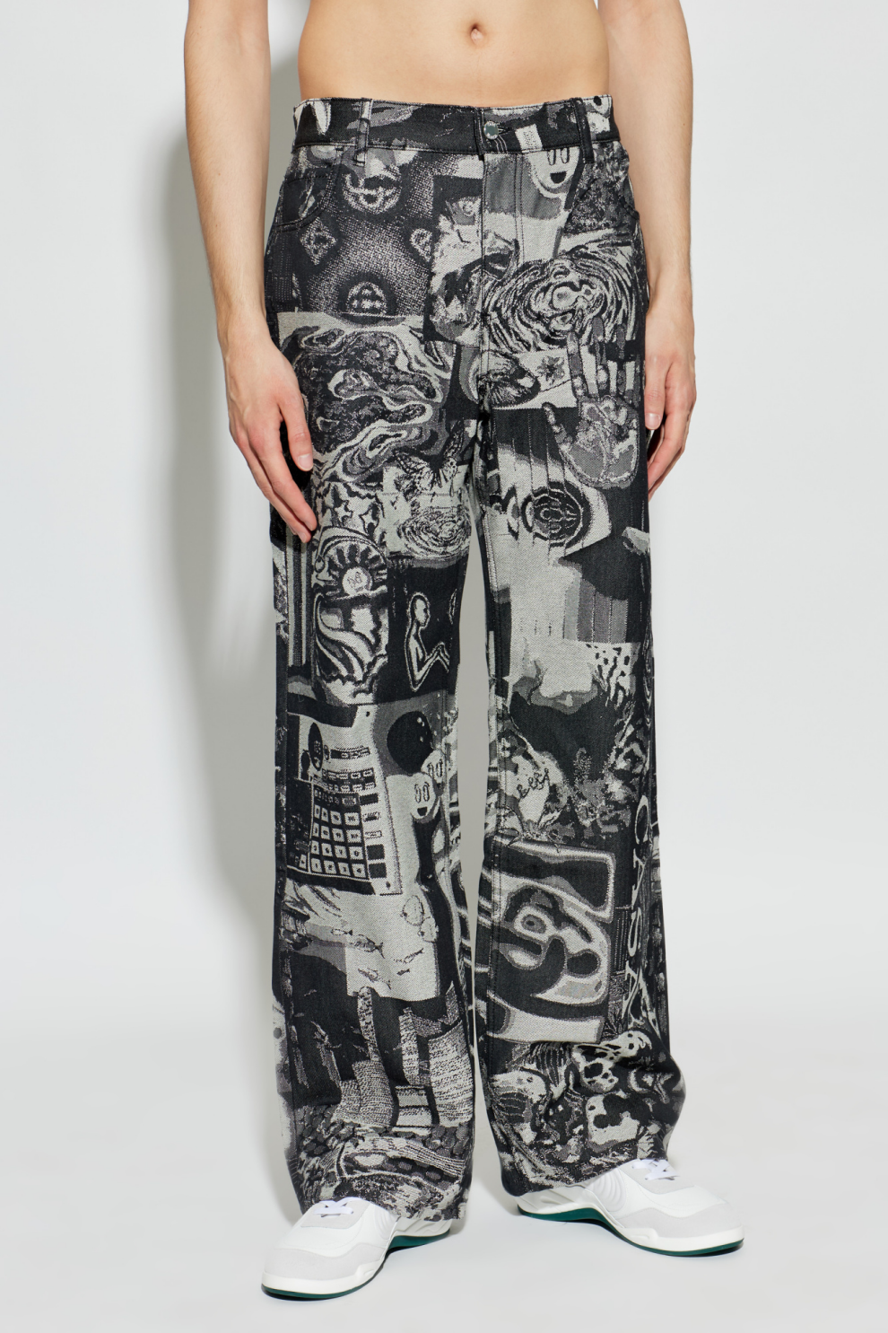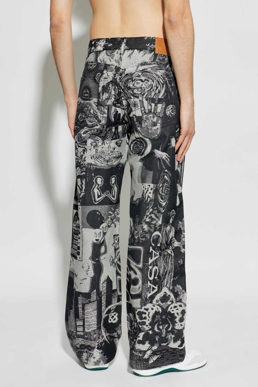 Джинсы Casablanca Rave Collage — это смелое переосмысление классического денима, в котором искусство и мода соединяются в единой выразительной концепции. Модель выполнена из плотного жаккардового денима с характерной зернистой текстурой, где хаотичный коллаж из рейв-флаеров, графики и символов превращается в уникальный художественный узор.
