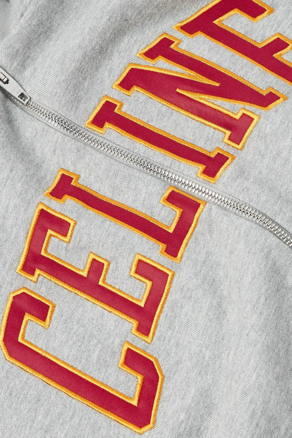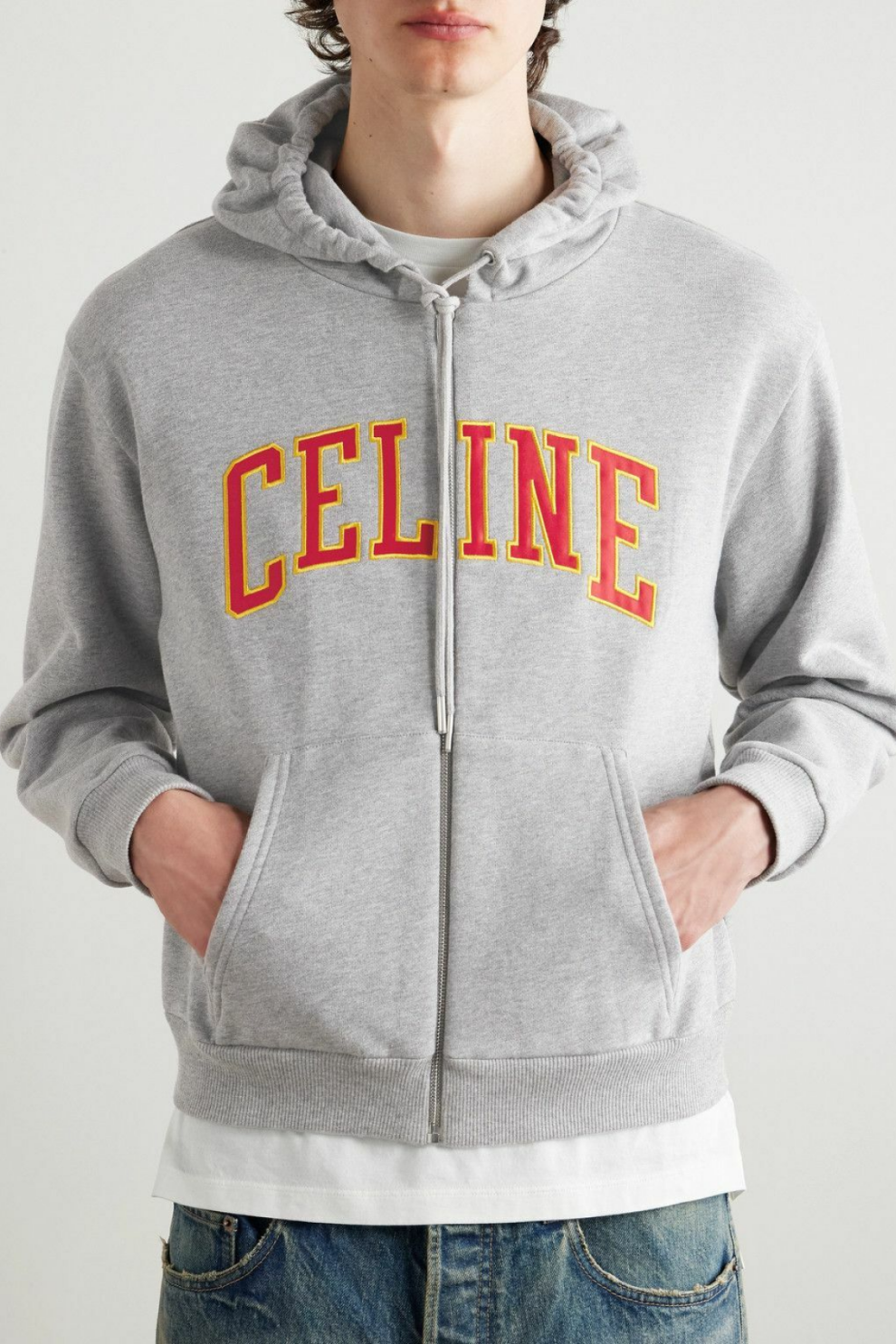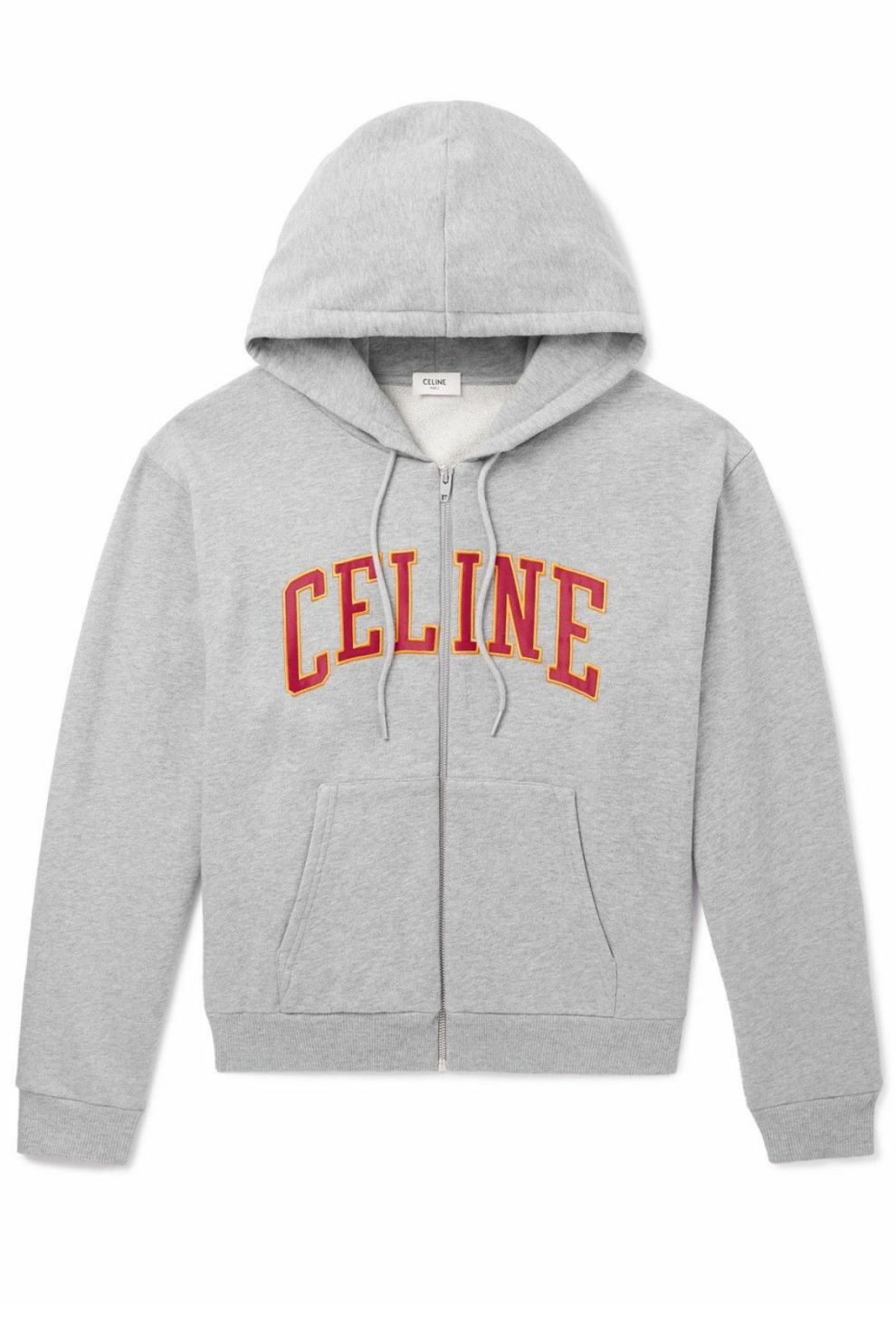 Центральным акцентом выступает вышитый логотип CELINE, выполненный объёмными красно-жёлтыми буквами в университетской стилистике — выразительная деталь, которая добавляет изделию коллекционный характер и подчёркивает его принадлежность к высокой моде.