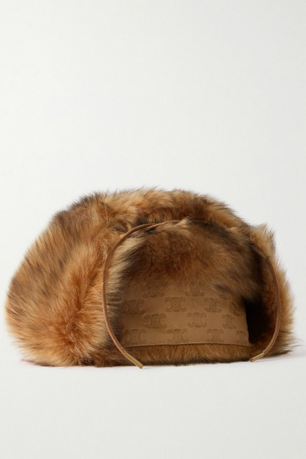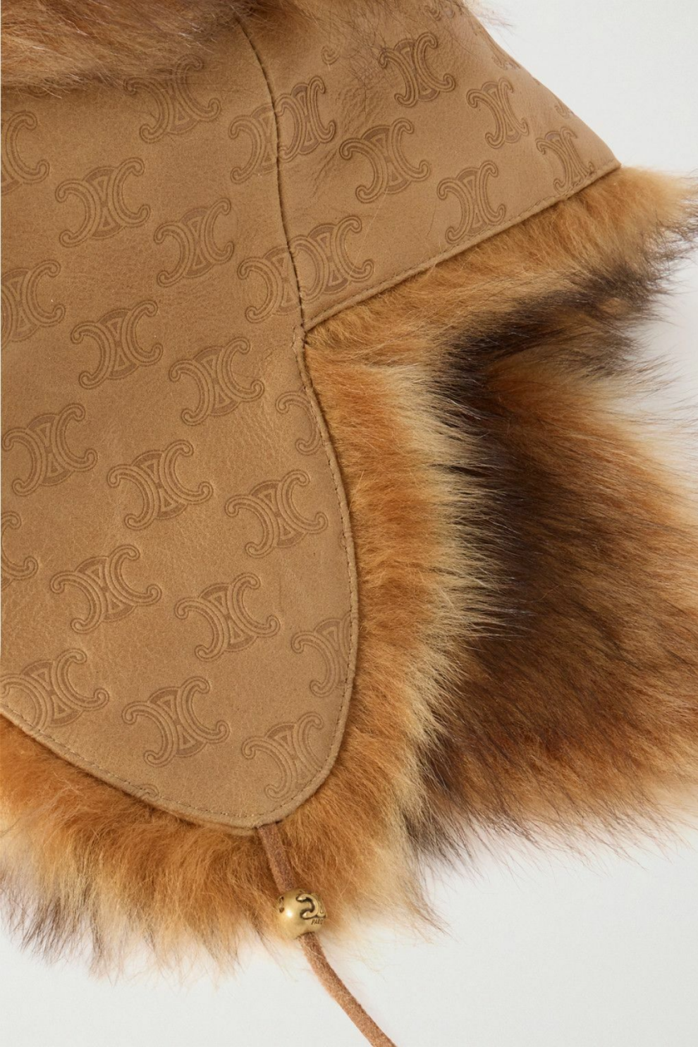 Объёмная текстура натурального меха обеспечивает тепло и комфорт в холодную погоду, а насыщенный коричневый оттенок подчёркивает премиальность материала и универсальность изделия. На задней части аккуратно размещён тиснёный логотип CELINE, который выступает сдержанным, но узнаваемым акцентом.