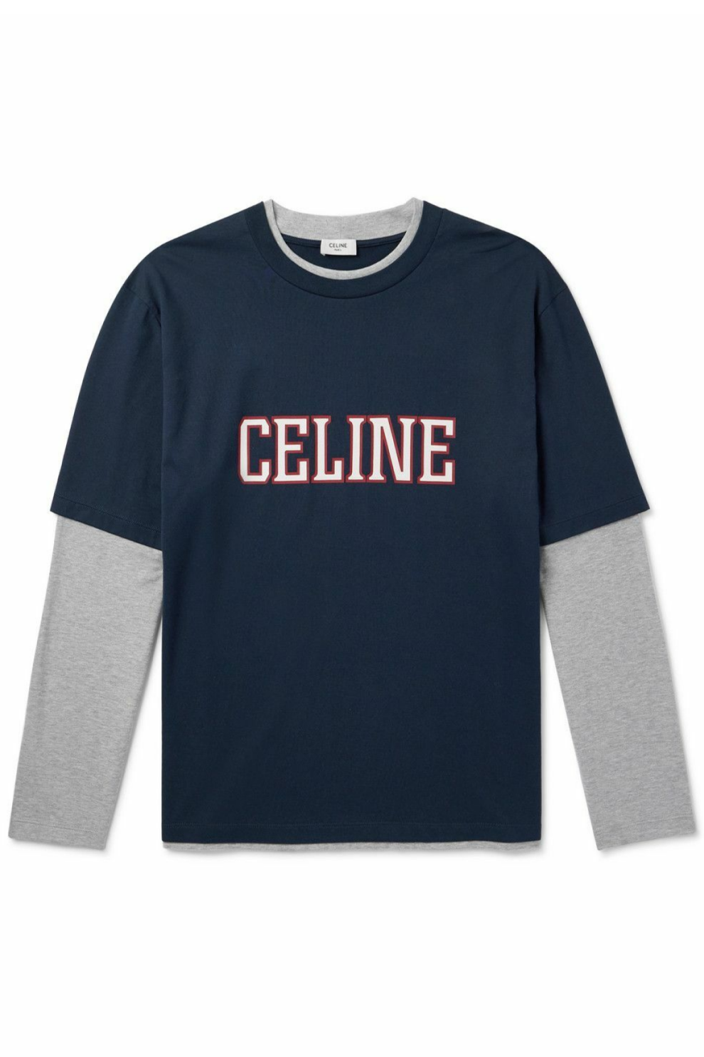 Синяя двухслойная футболка Celine Homme, которая пересекает коды скейт-культуры, гранжа и панка — три эстетики, которые Эди Слиман мастерски превращает в современную минималистичную классику. Футболка выполнена из мягкого хлопкового джерси и создана так, чтобы выглядеть как два самостоятельно надетых слоя. Такой визуальный эффект добавляет глубины силуэту и создаёт характерный неряшливо-стильный настрой, отсылающий к духу альтернативной сцены 90-х.