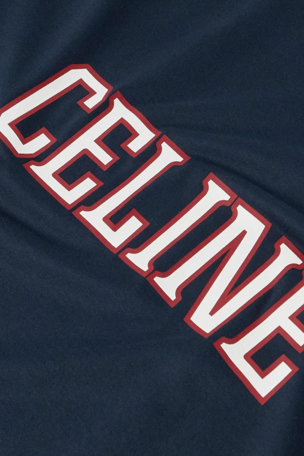 На груди расположен чёткий, графичный логотип CELINE, напечатанный по центру — акцент, который подчёркивает уверенность бренда и делает вещь легко узнаваемой. Глубокий синий оттенок добавляет образу свежести и делает модель особенно универсальной: она одинаково хорошо смотрится с денимом, чёрными карго, кожаной курткой или свободными брюками.