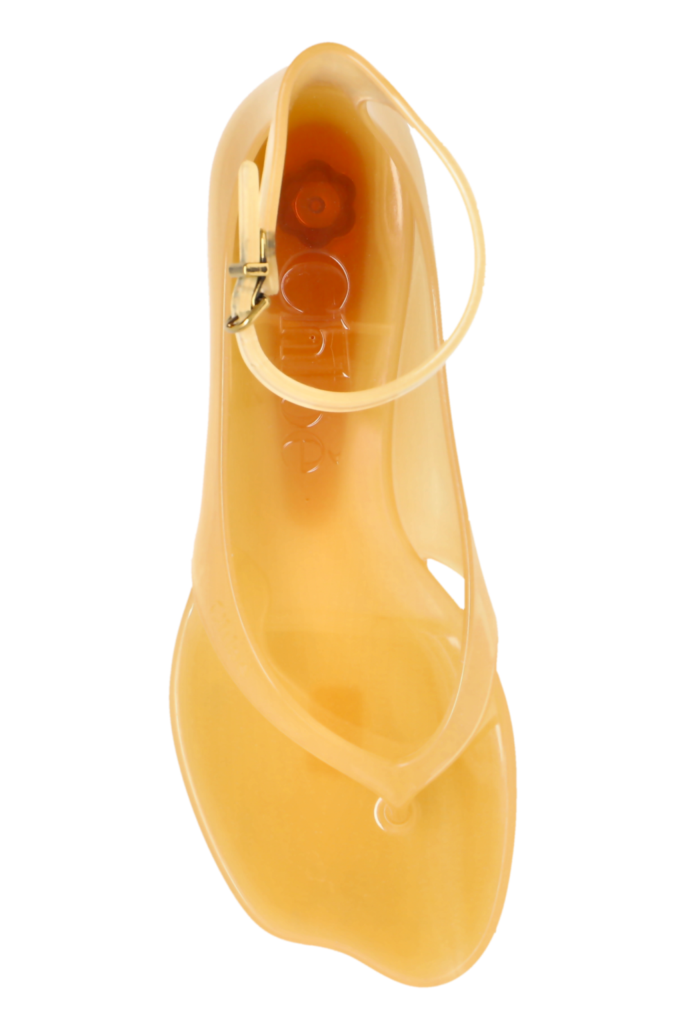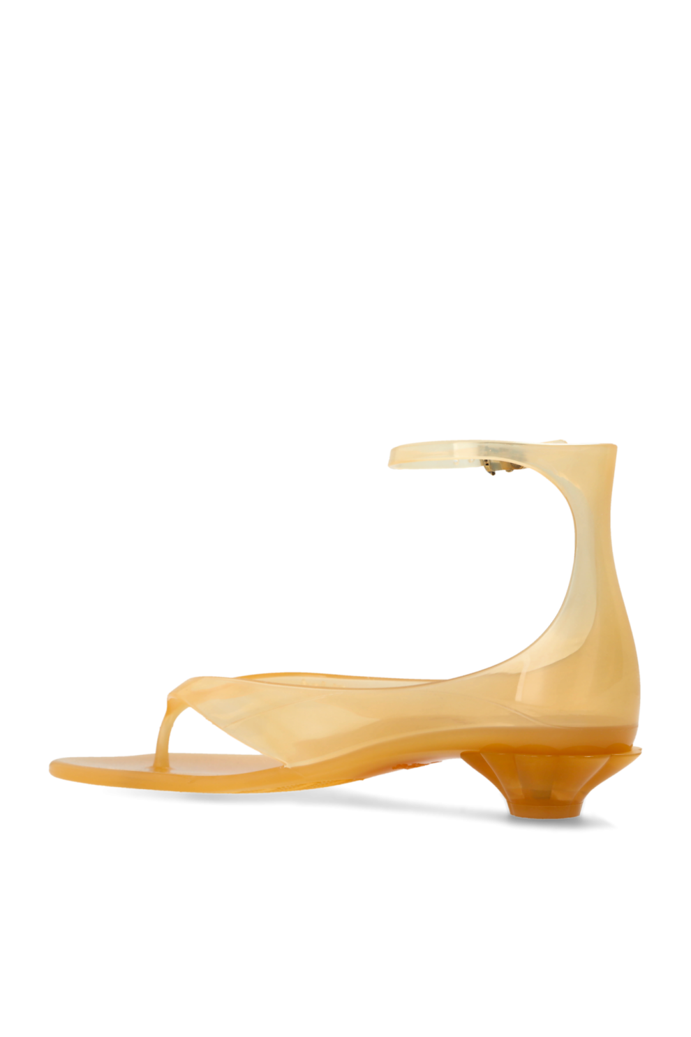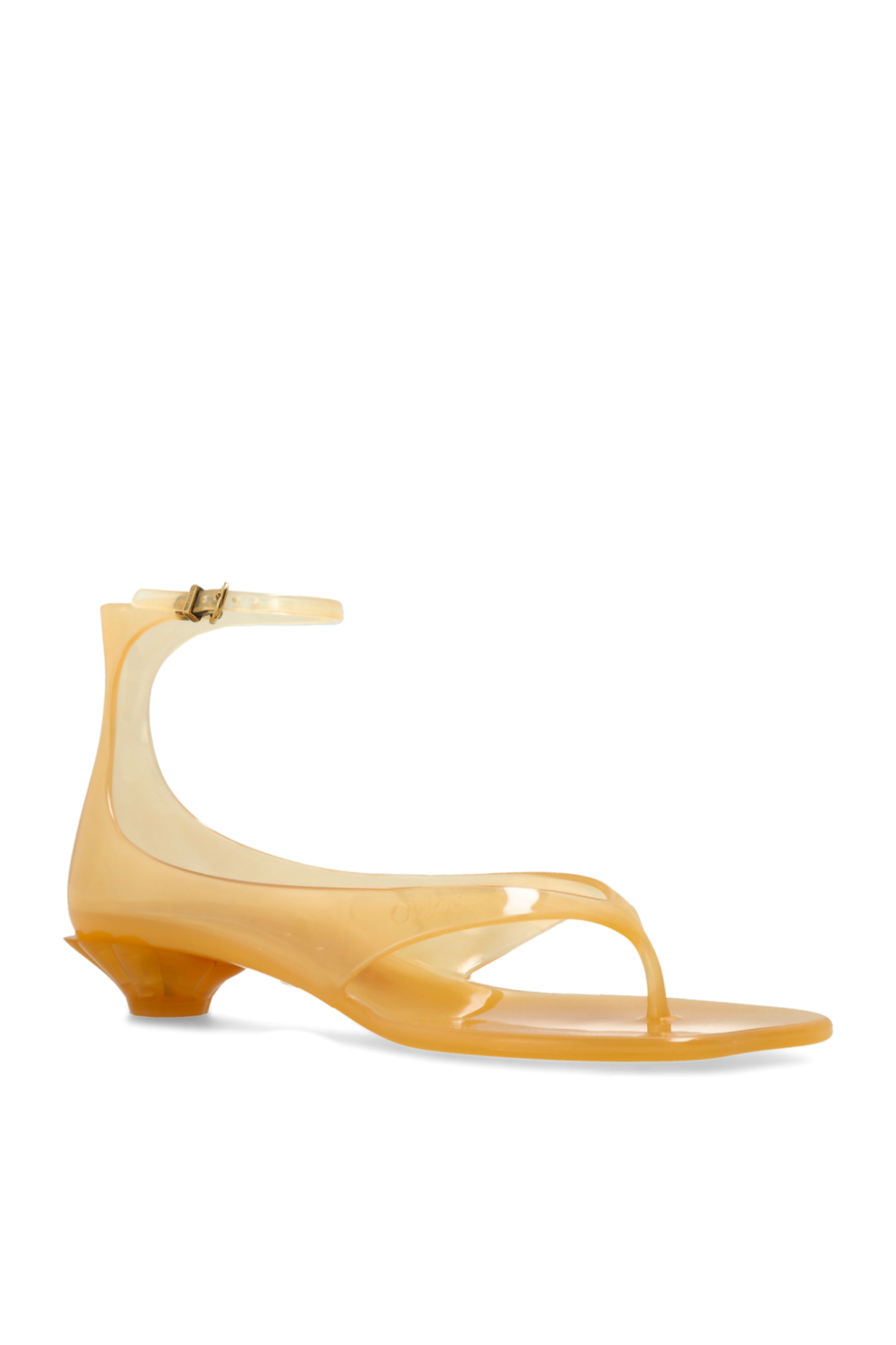 Модель выполнена из полупрозрачного ТПУ янтарного оттенка с мягким глянцевым эффектом, благодаря чему обувь выглядит свежо и современно, добавляя образу лёгкость и актуальность. Тонкие ремешки аккуратно фиксируют стопу, а изящная металлическая пряжка золотистого цвета на щиколотке служит не только функциональной деталью, но и утонченным акцентом, подчеркивающим премиальный характер модели.
