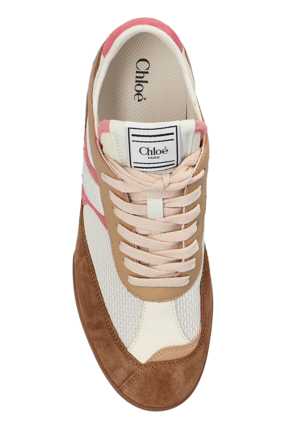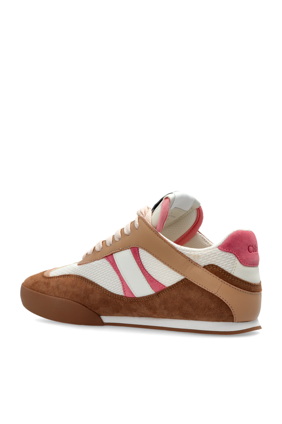Кроссовки Chloé Kick в оттенке Baby Pink — воплощение современной элегантности и непринуждённого стиля. Их изящный низкий силуэт с закругленным носком подчёркивает утончённый характер модели, а гармоничное сочетание кремово-белой дышащей сетки с коричневыми замшевыми вставками и бело-розовыми боковыми полосами создаёт уникальный, многослойный образ.