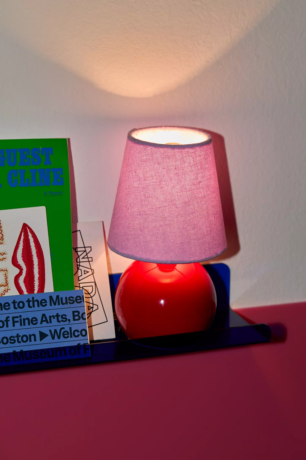 Главная особенность модели — сферическое основание насыщенного красного цвета, привлекающее внимание и создающее динамичную композицию. Его дополняет удлинённый плетёный абажур конусообразной формы, выполненный в нежном лавандовом оттенке. Лампа мягко рассеивает свет, создавая уютное настроение в вечернее время.