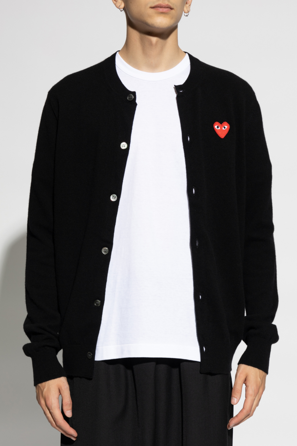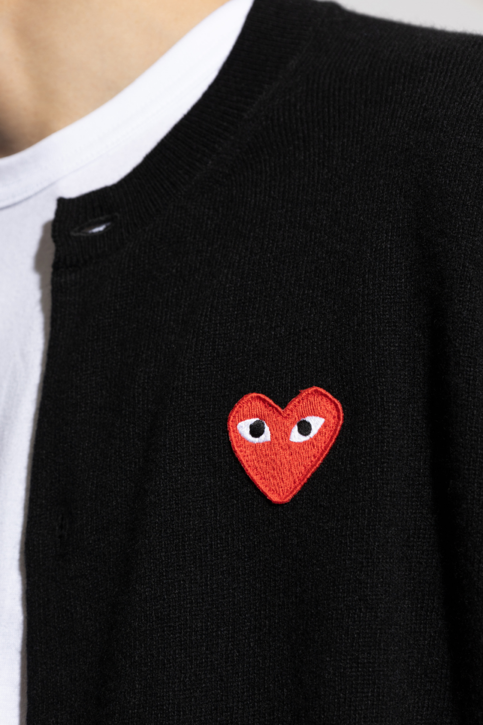 Отличительная черта этого кардигана — красная нашивка в форме сердца с белыми глазами на левой стороне груди — фирменный знак линейки бренда, придающий изделию неповторимый вид. Контрастные белые пуговицы на чёрном фоне придают изделию элегантный и в то же время современный вид. Рукава и подол отделаны резинкой, что обеспечивает идеальную посадку.