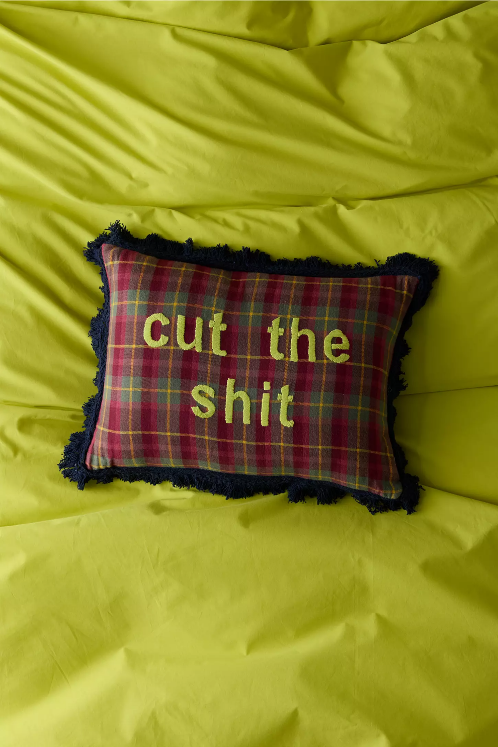 Добавьте в интерьер смелый и непринуждённый акцент с этой декоративной подушкой, где клетчатый узор в сочетании с вышитым надписью “Cut The Shit” создаёт дерзкий, но стильный образ, который подчёркивает индивидуальность вашего пространства.
