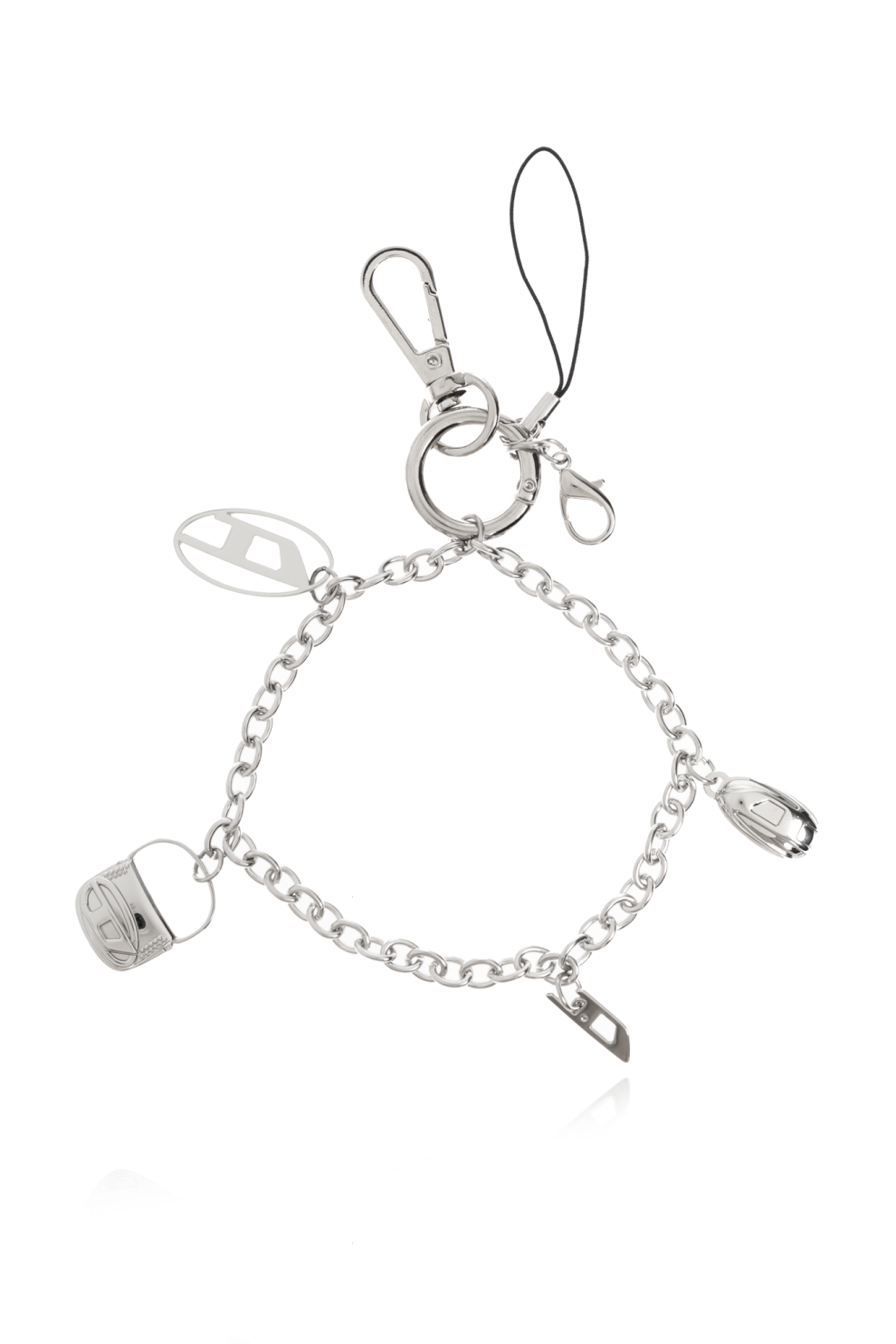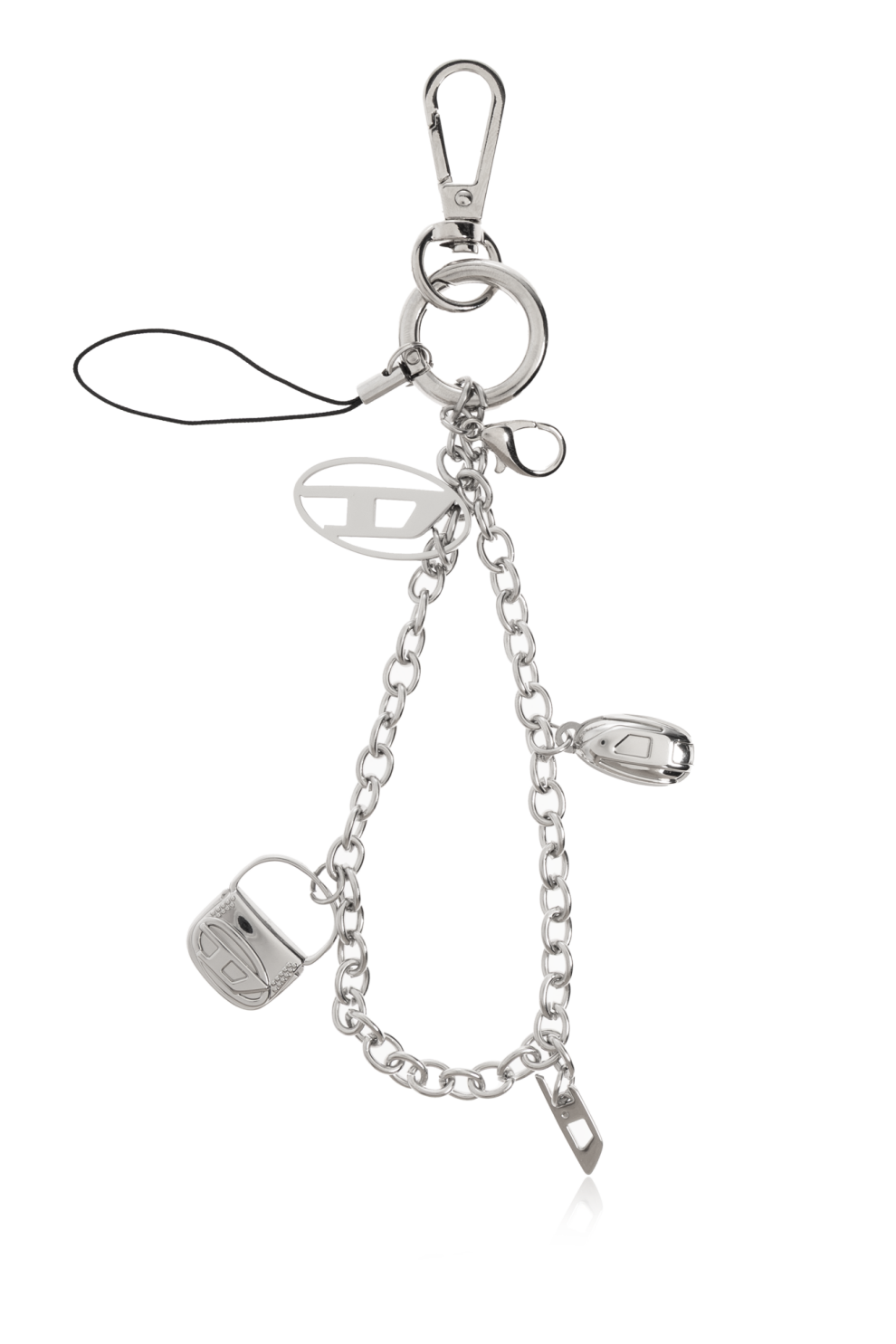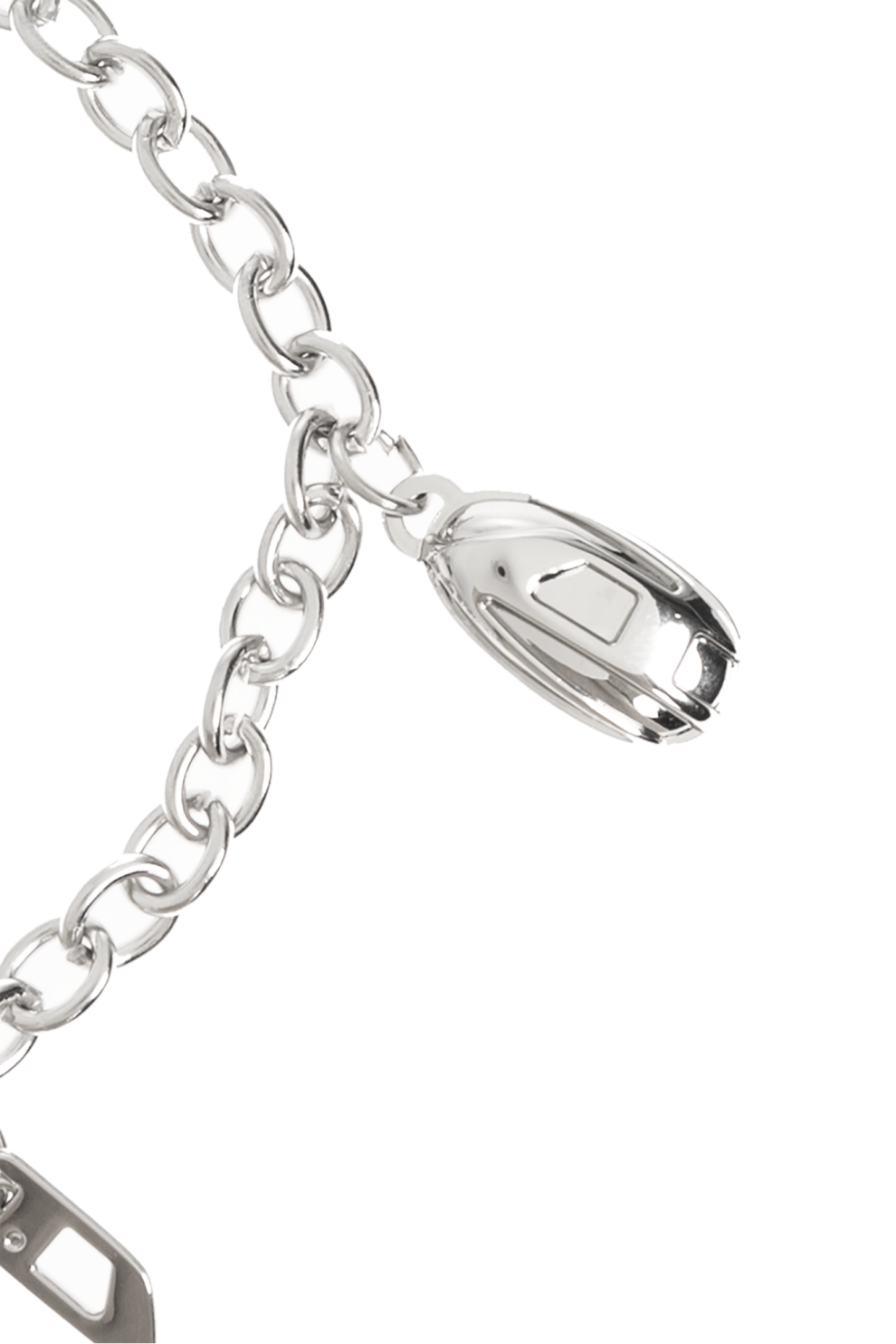 Серебристый брелок с различными подвесками от Diesel, который очаровательно дополнит любимую сумку, джинсы или даже смарфтон. Гармонично переплетенная цепочка из глянцевого серебра дополнена утонченными подвесками: стильным замочком, эллиптическим элементом со сложной выемкой и акцентами, вдохновленными технологичной эстетикой.