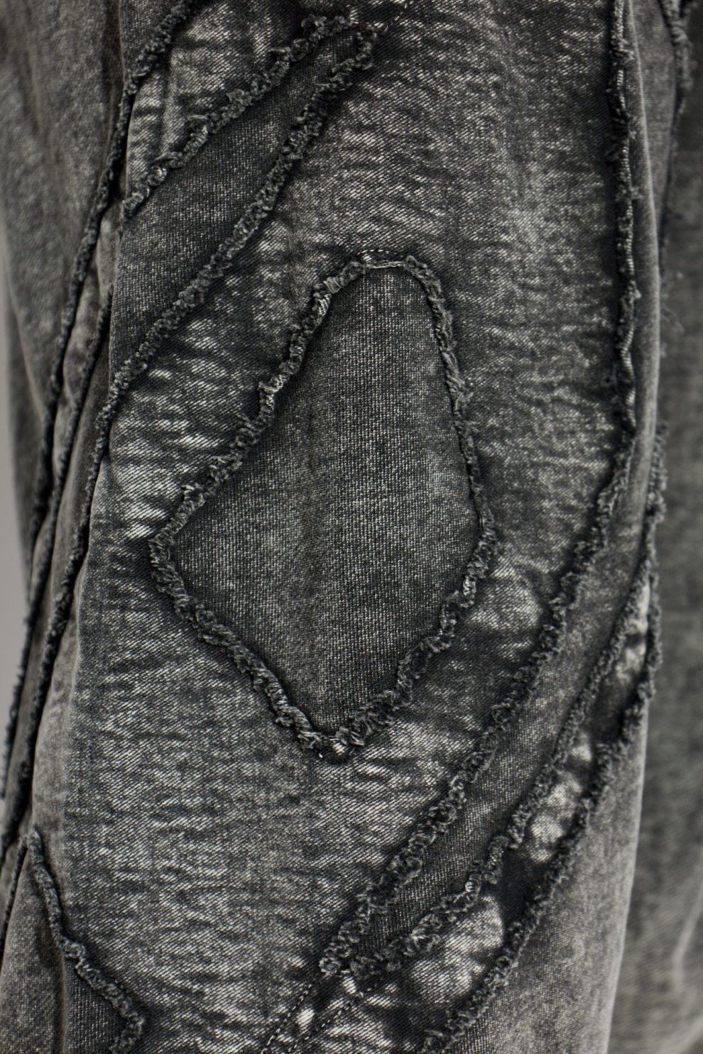 Акцентным элементом выступает абстрактная аппликация на левой штанине — фактурный художественный штрих, который добавляет глубину и подчёркивает индивидуальность изделия. Модель легко вписывается как в повседневные образы, так и в расслабленный smart-casual.