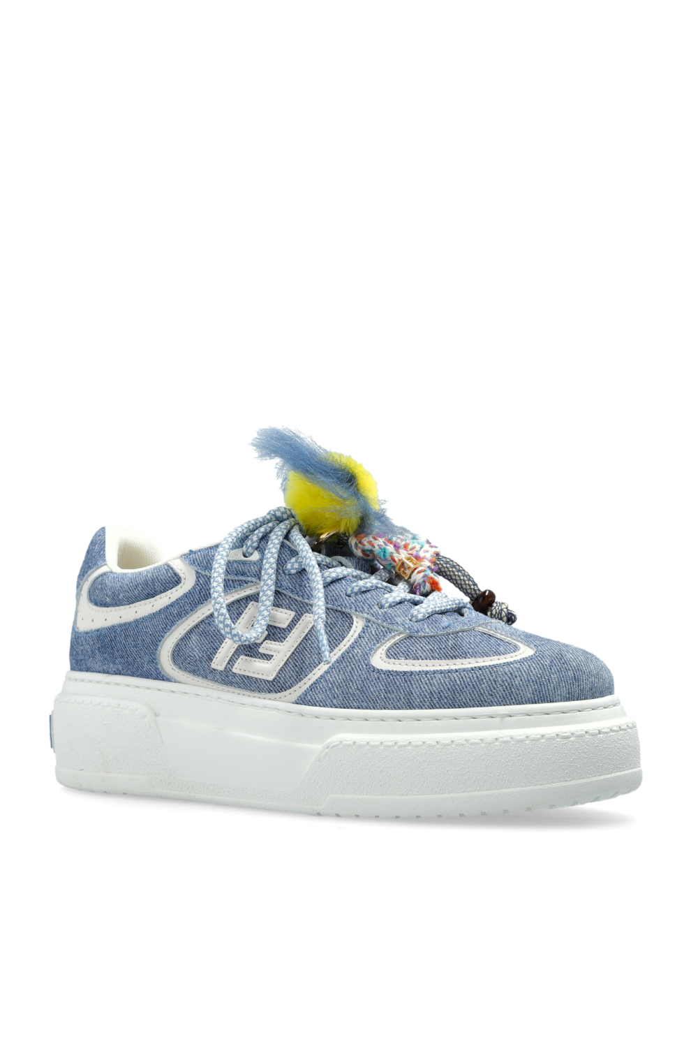 Кроссовки Match на платформе от Fendi — это сочетание современного спортивного дизайна и повседневной роскоши. Модель выполнена с низким верхом из синей ткани с лёгким джинсовым плетением, дополненной контрастной белой строчкой и яркой окантовкой, что придаёт силуэту выразительность и глубину.
