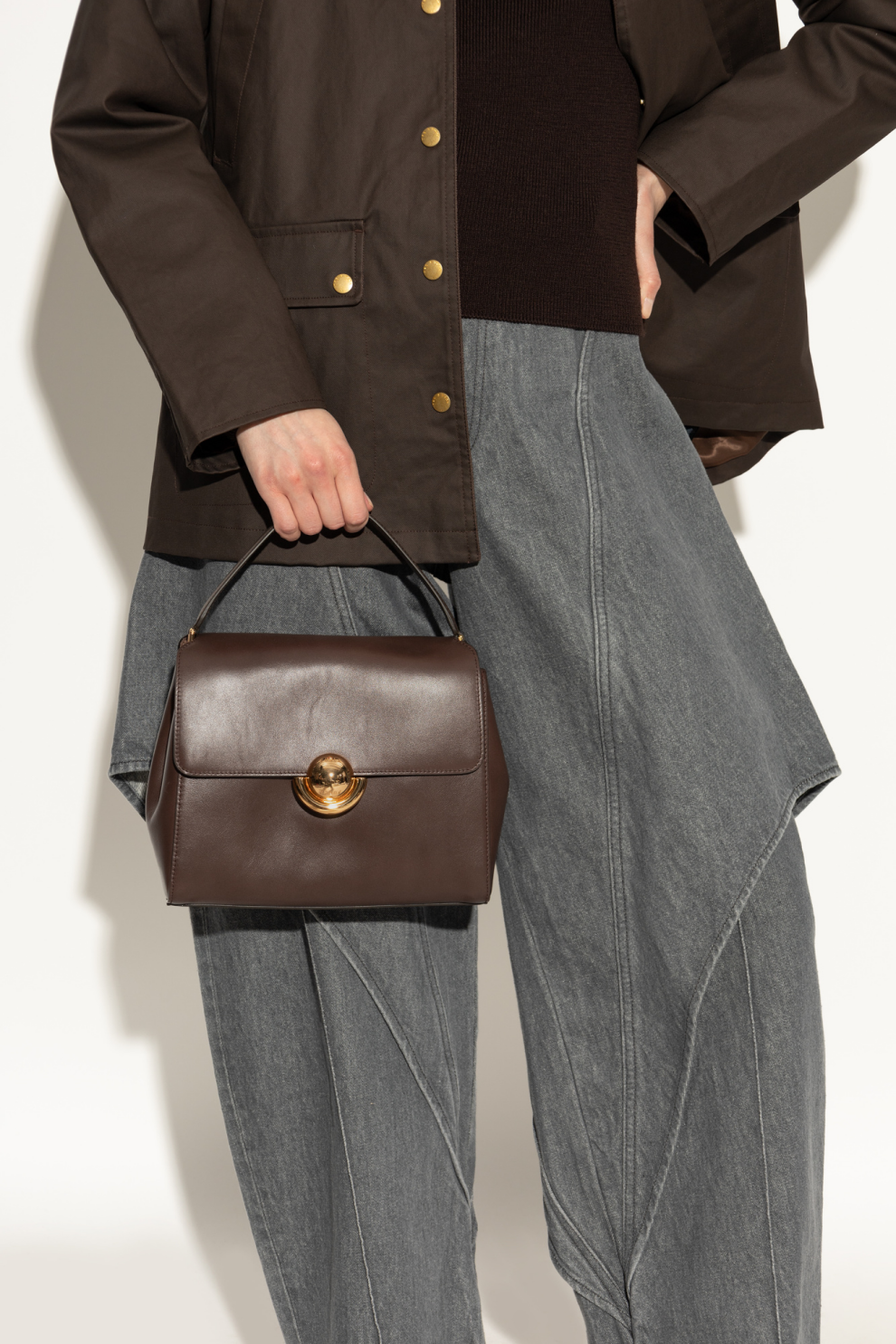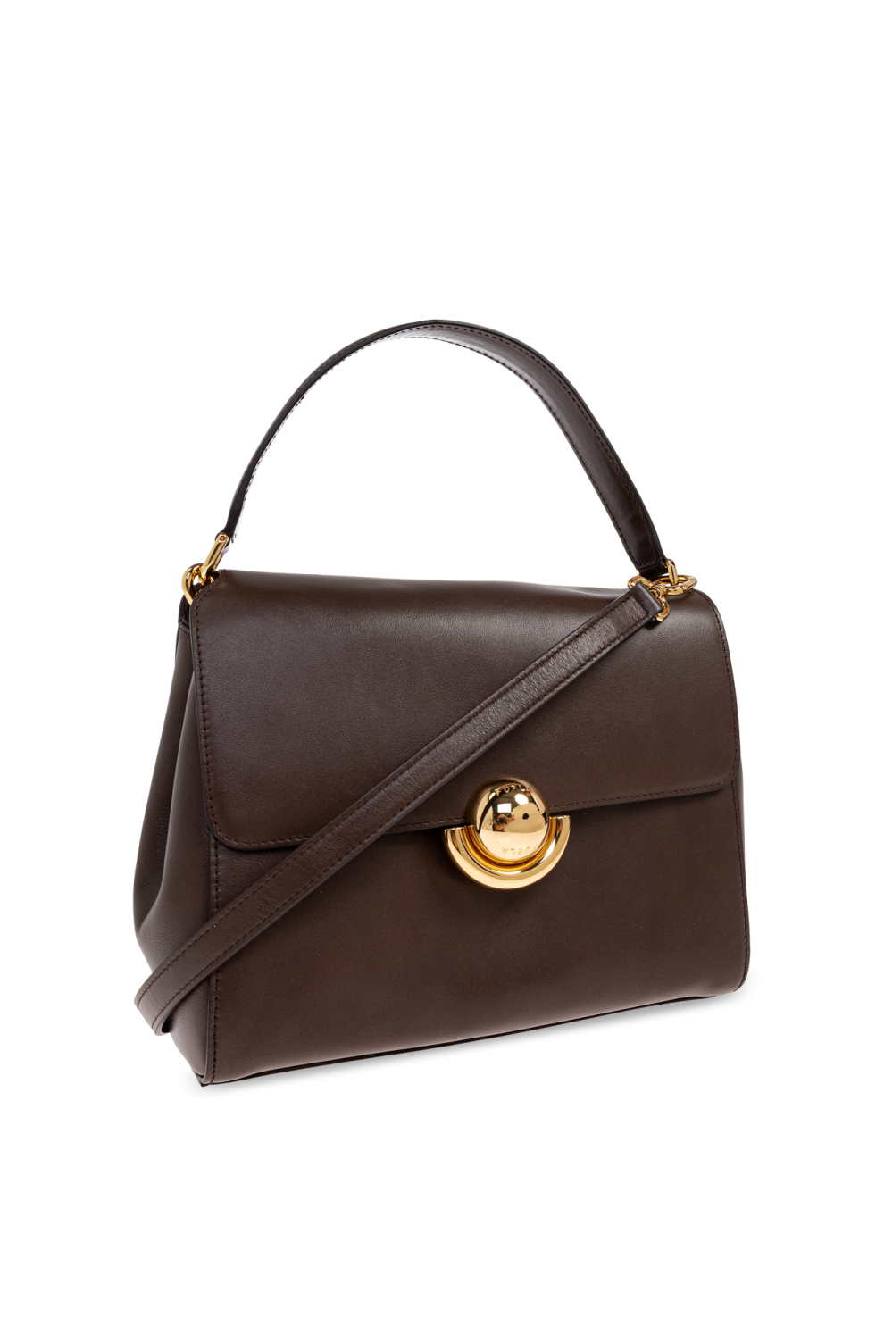 Центральным декоративным элементом является характерная круглая золотистая застёжка с гравировкой названия бренда, подчёркивающая уникальность изделия. Короткая прочная кожаная ручка и регулируемый съёмный плечевой ремень обеспечивают универсальность и комфорт при ношении.