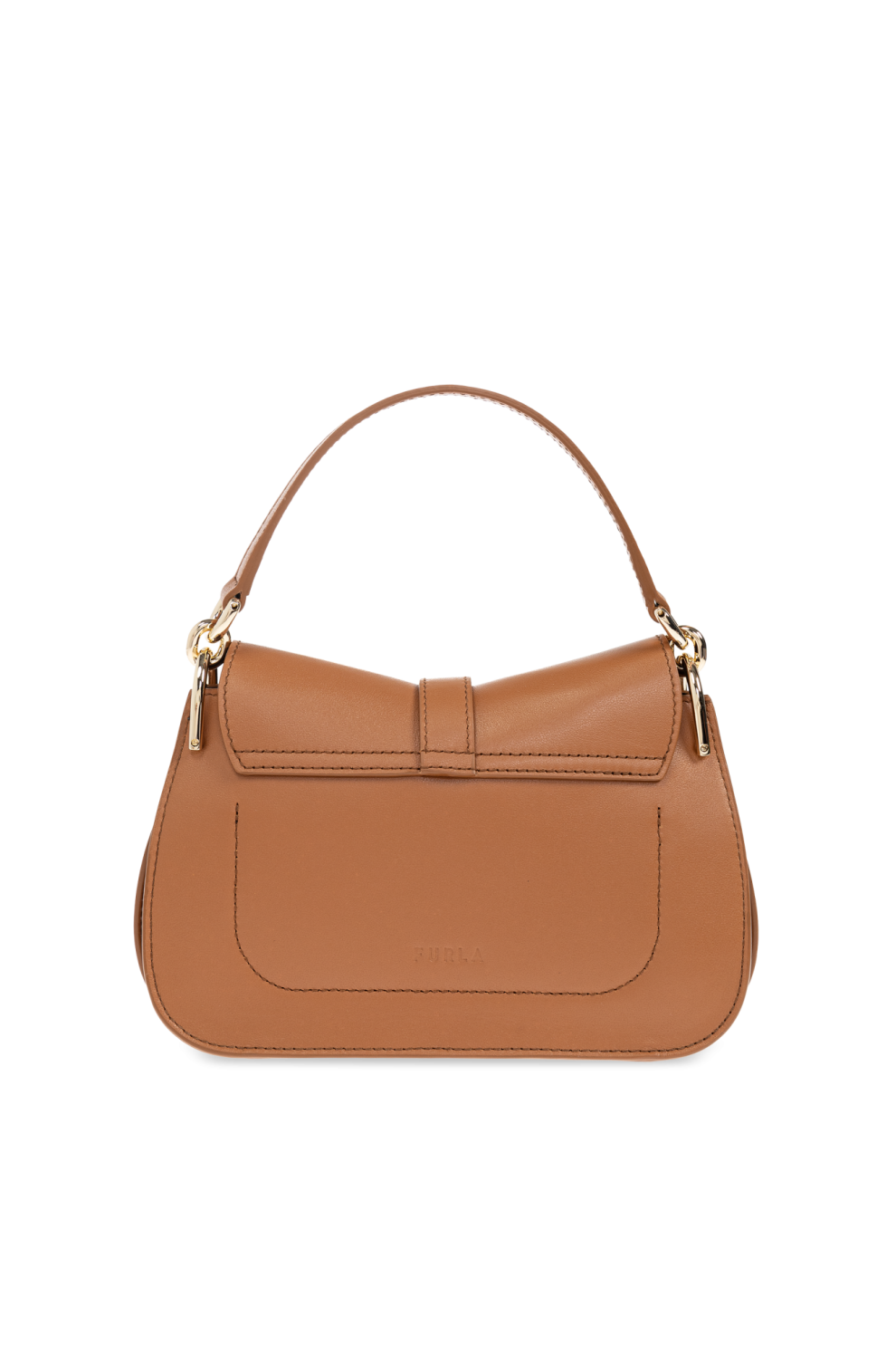 Гладкая текстура кожи тонко подчёркивает её роскошный характер, а расположенная по центру золотая застёжка в форме стилизованной буквы «F» не только украшает, но и подчёркивает уникальный фирменный стиль Furla . Благодаря одной ручке сумка невероятно удобна и красиво лежит в руке.